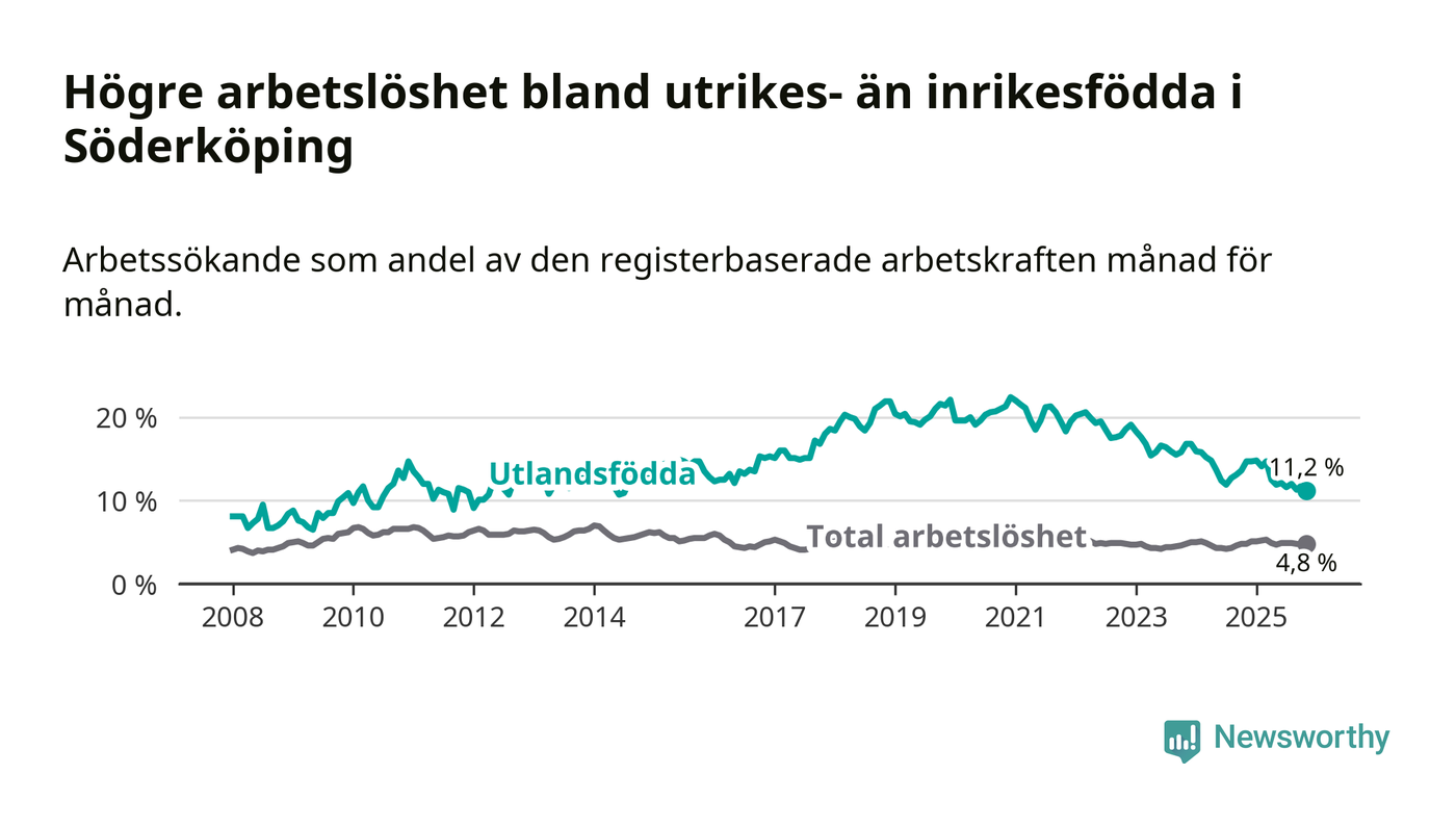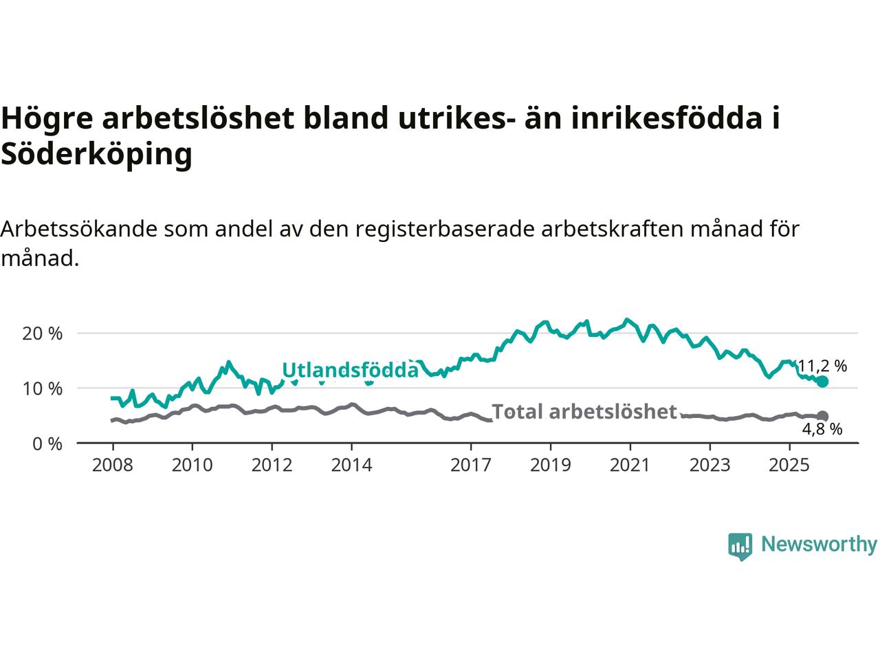 Skillnaden i arbetslöshet mellan utrikesfödda och hela befolkningen är 6,4 procentenheter i Söderköping. Det är en betydligt mindre skillnad än för ett år sedan (−3,5 procentenheter).