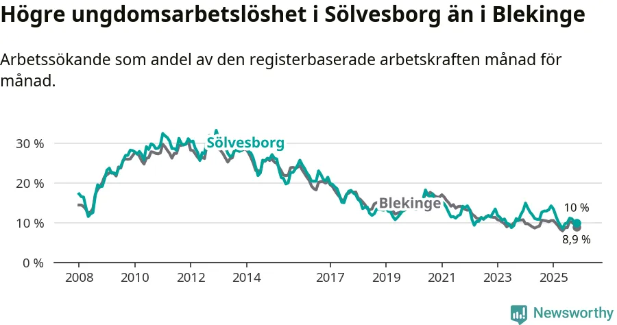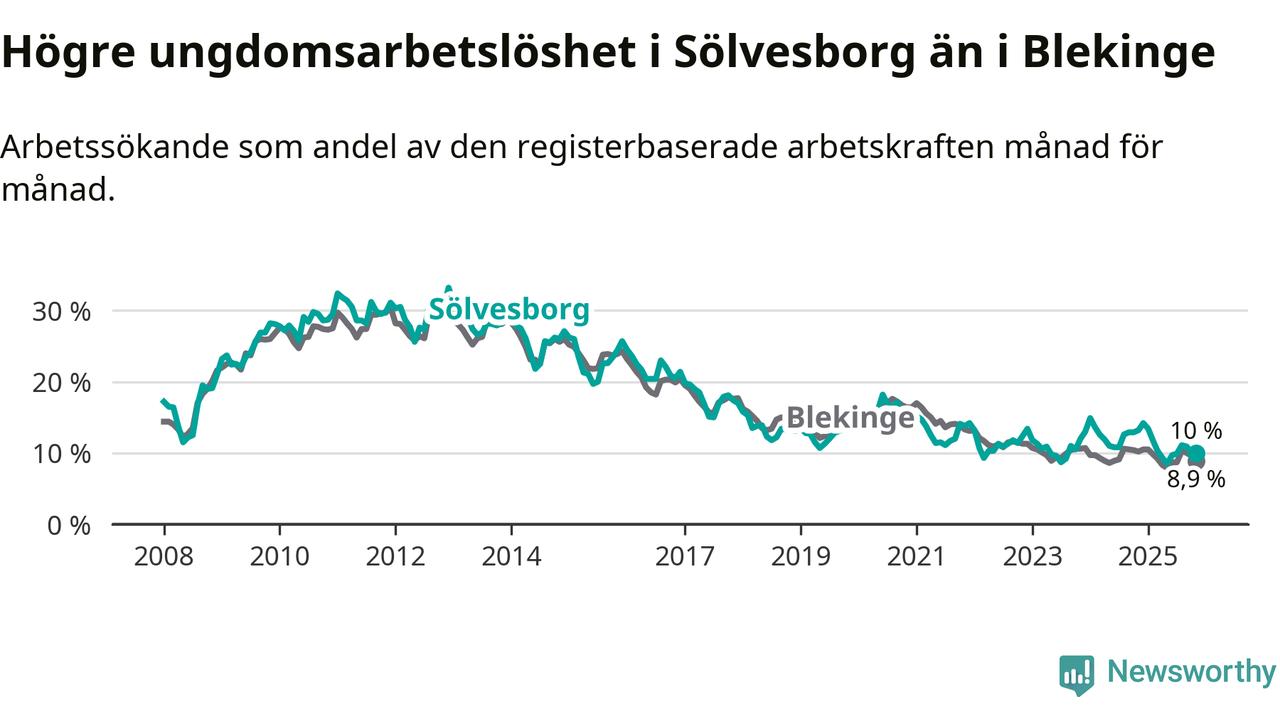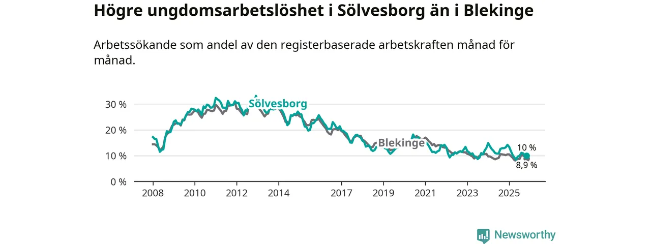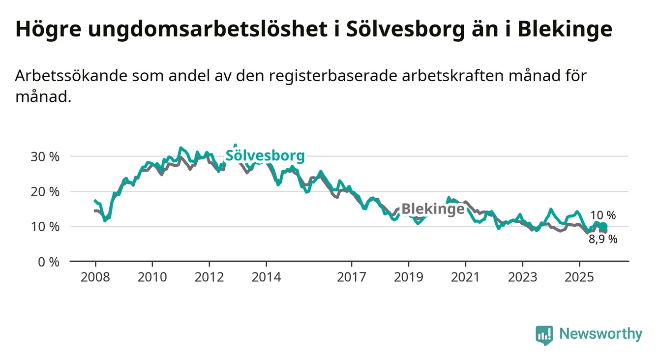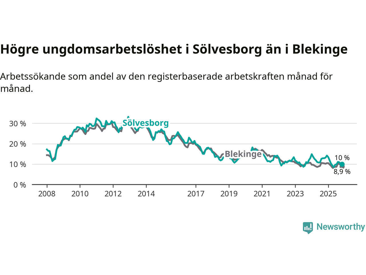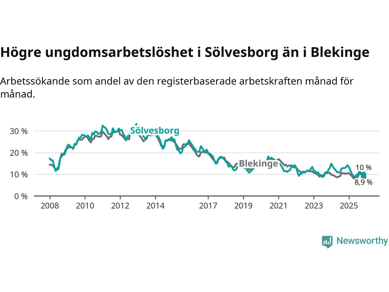 Medan Sölvesborg har lägre total arbetslöshet än Blekinge, ligger ungdomsarbetslösheten 1,1 procentenheter högre i Sölvesborg.