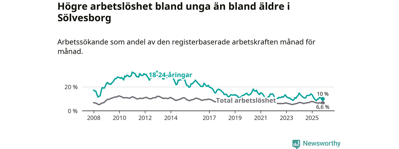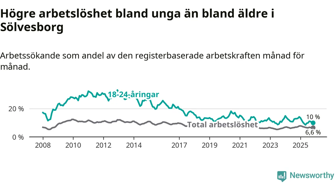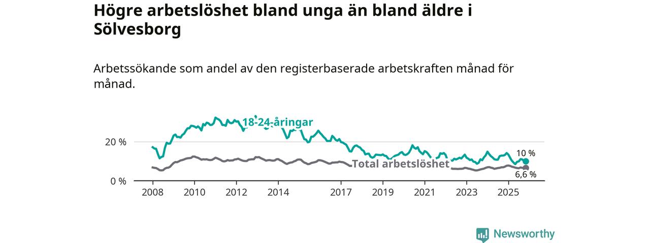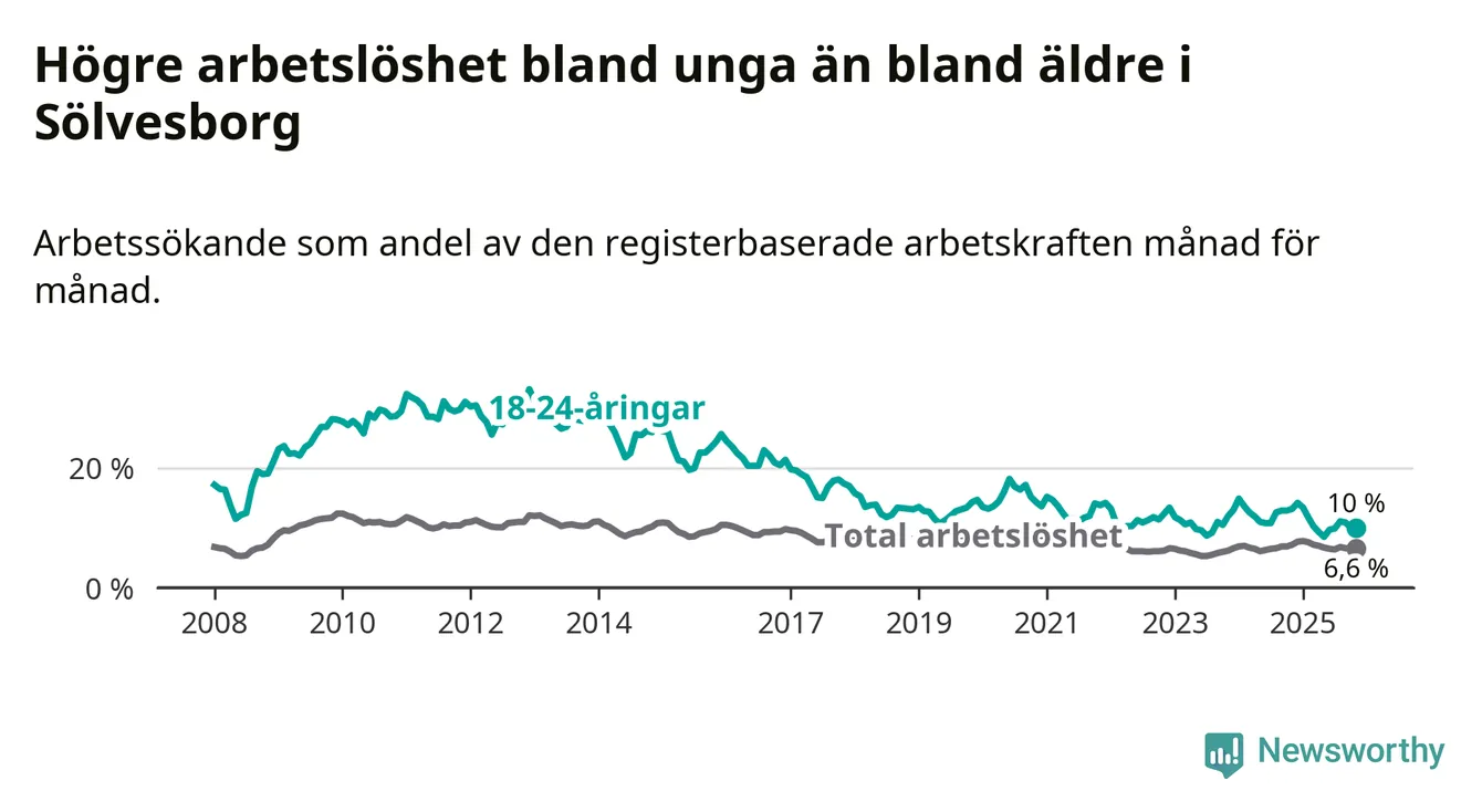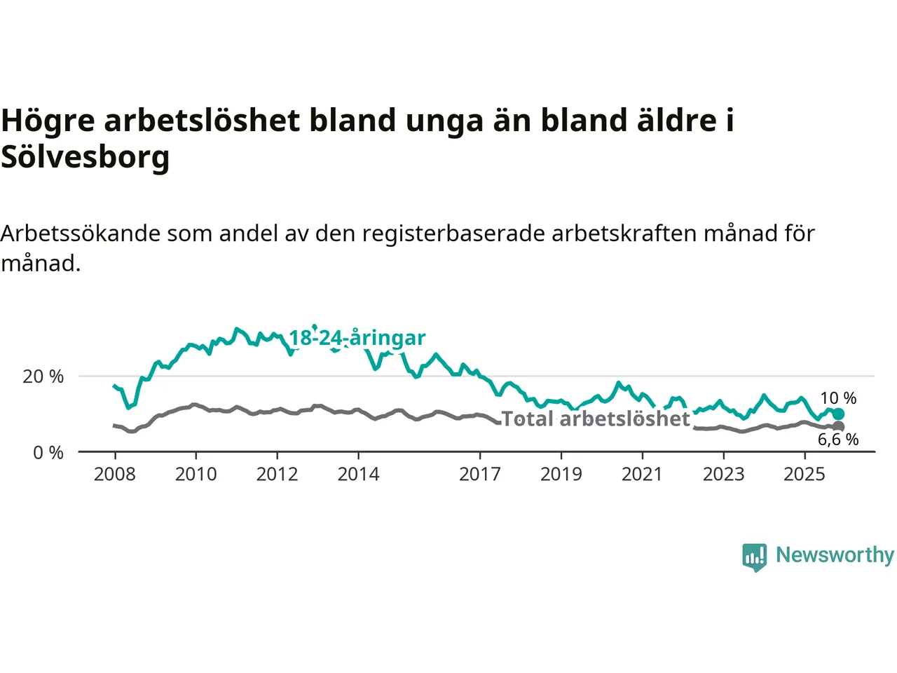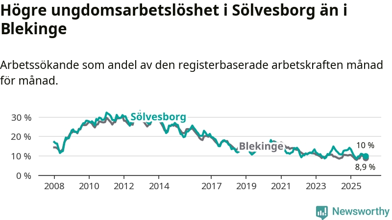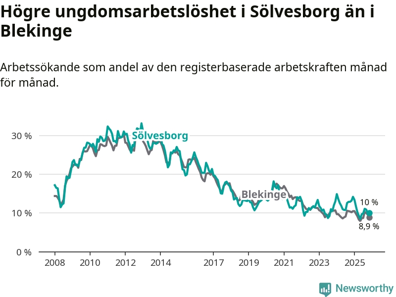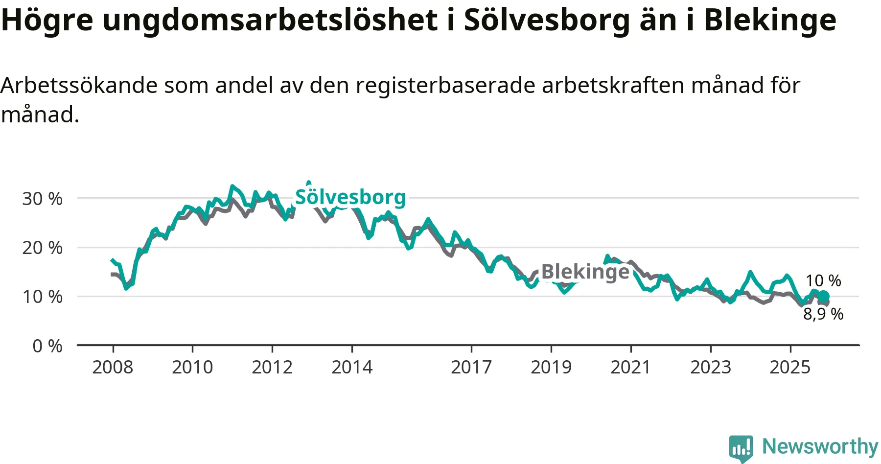 Medan Sölvesborg har lägre total arbetslöshet än Blekinge, ligger ungdomsarbetslösheten 1,1 procentenheter högre i Sölvesborg.