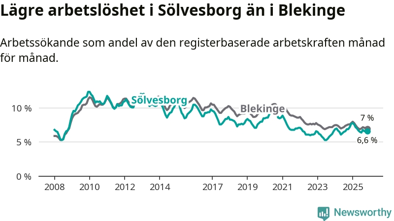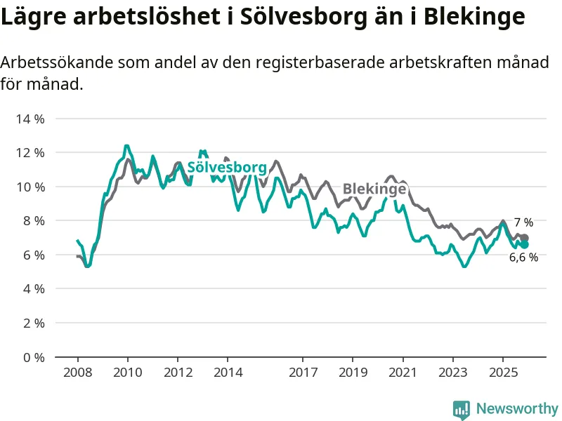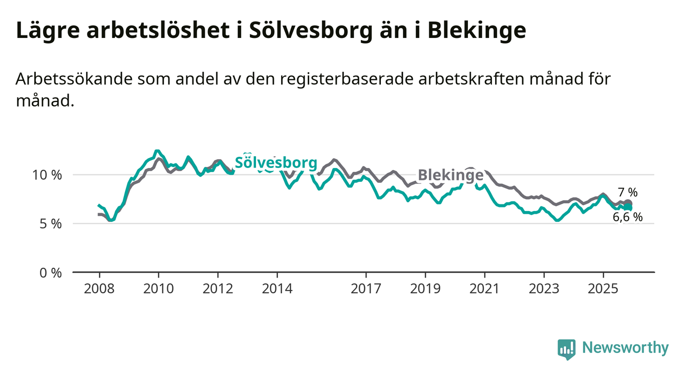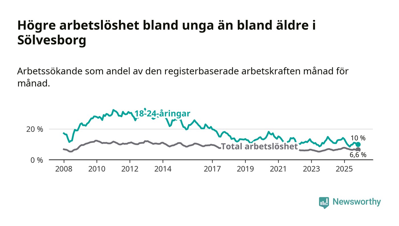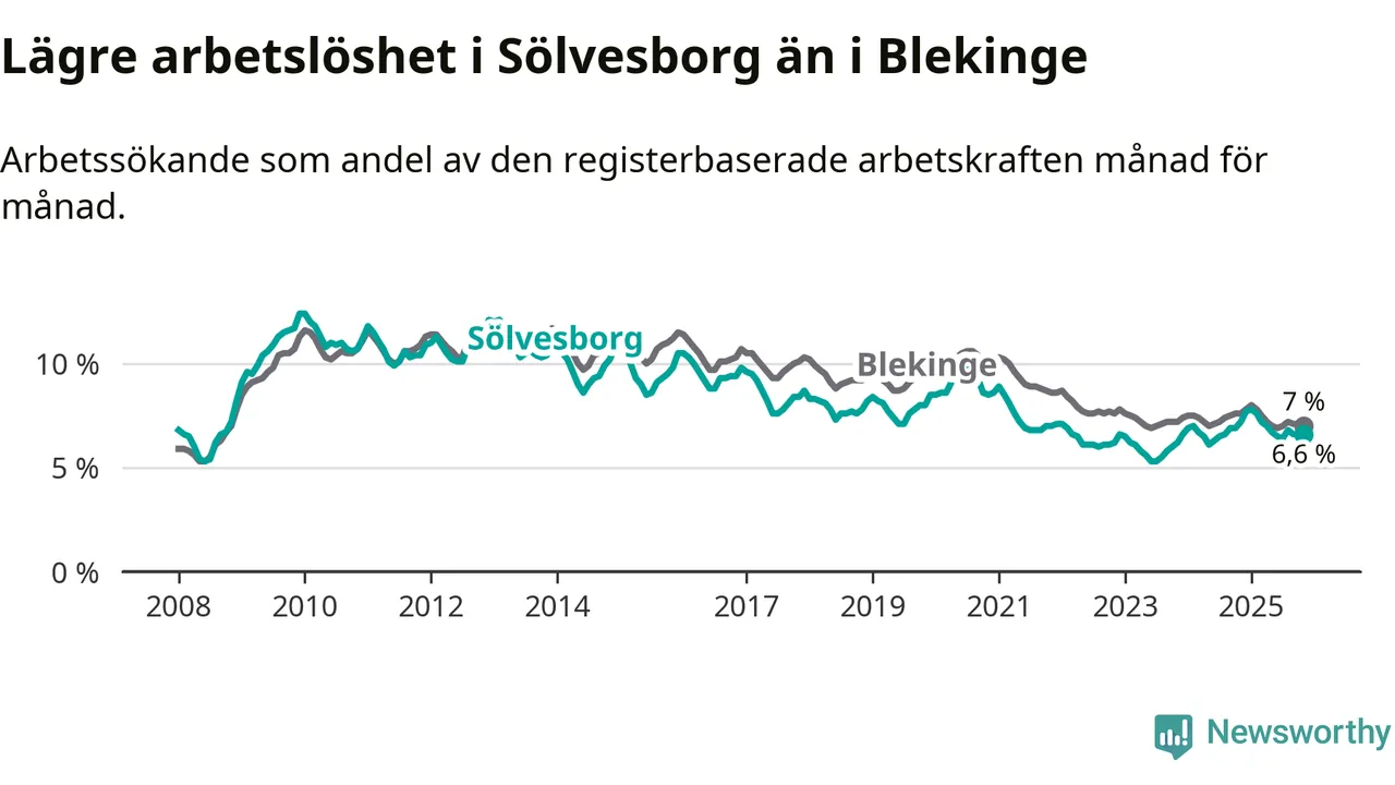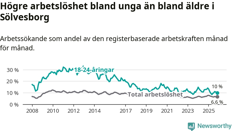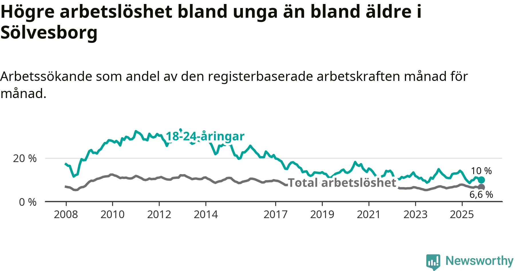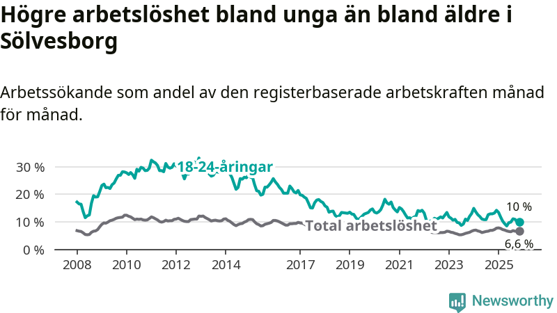 Medan Sölvesborg har lägre total arbetslöshet än Blekinge, ligger ungdomsarbetslösheten 1,1 procentenheter högre i Sölvesborg.