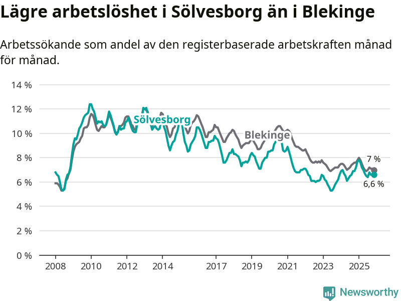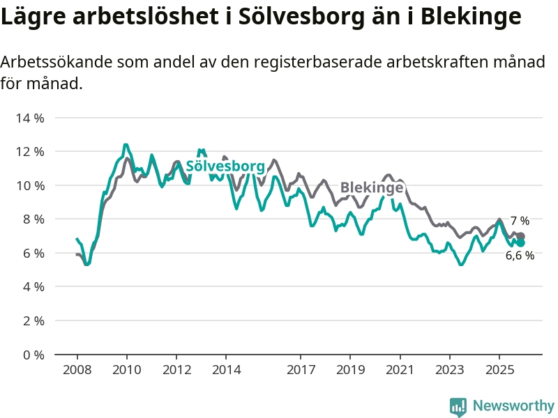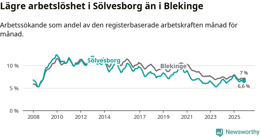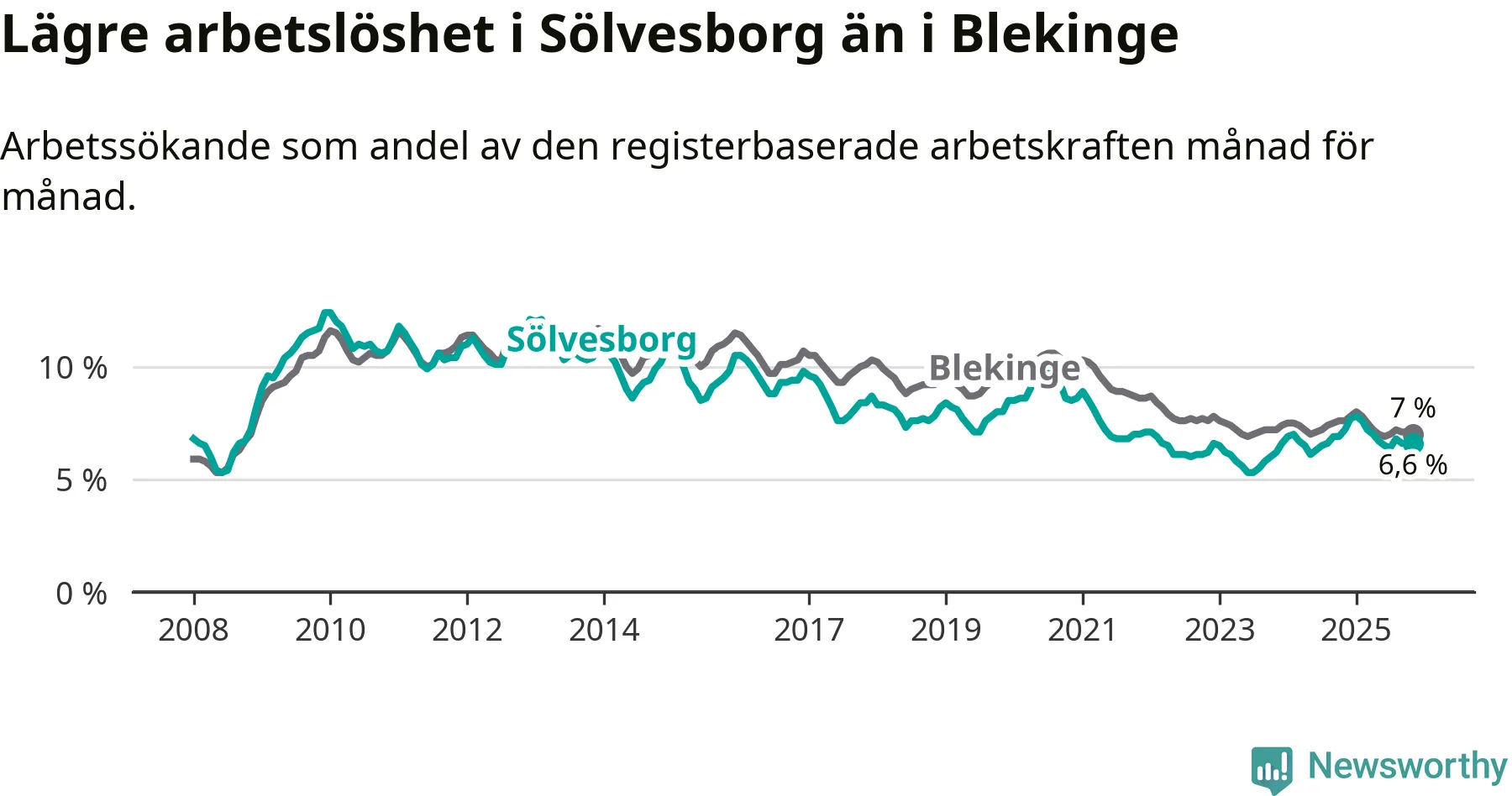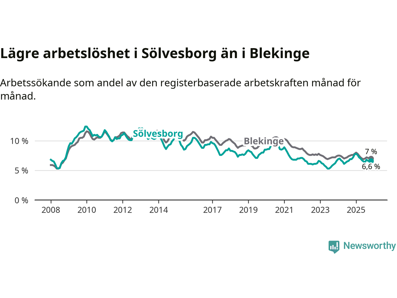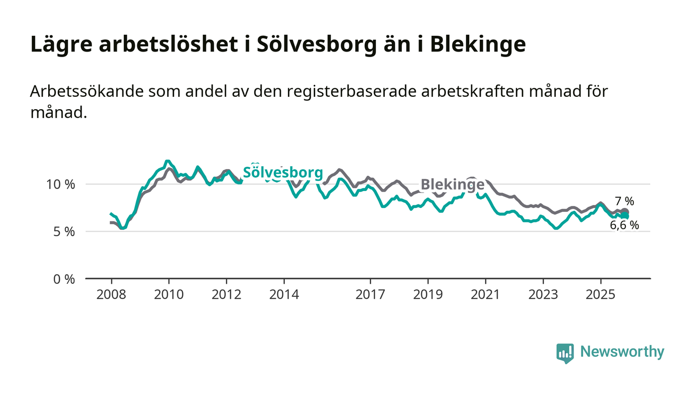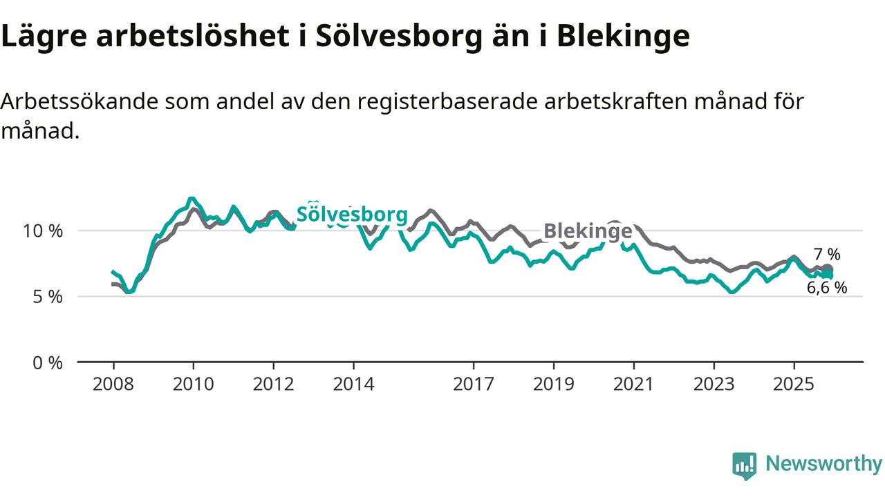 Sölvesborg hade redan tidigare lägre arbetslöshet än snittet i hela Blekinge län och nu växer klyftan (6,6 procent i kommunen, jämfört med 7,0 procent i hela länet). Karlskrona har den lägsta arbetslösheten i länet (5,3 procent), medan Ronneby har den högsta (9,9 procent). För att Sölvesborg skulle komma ner i samma arbetslöshetsnivå som Karlskrona skulle 107 personer behöva sysselsättas.