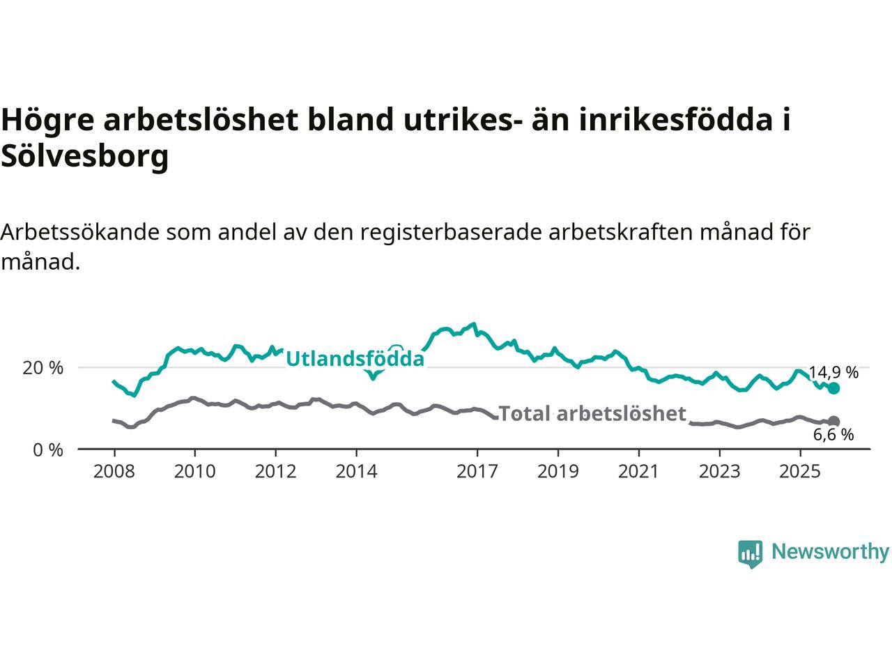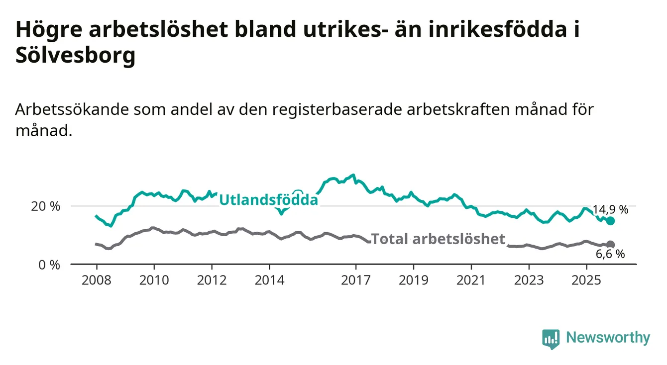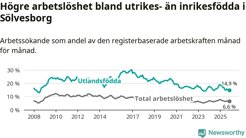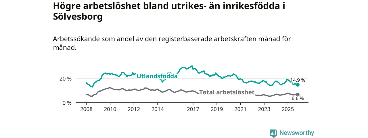 Skillnaden i arbetslöshet mellan utrikesfödda och hela befolkningen är 8,3 procentenheter i Sölvesborg. Det är en betydligt mindre skillnad än för ett år sedan (−2,0 procentenheter).
