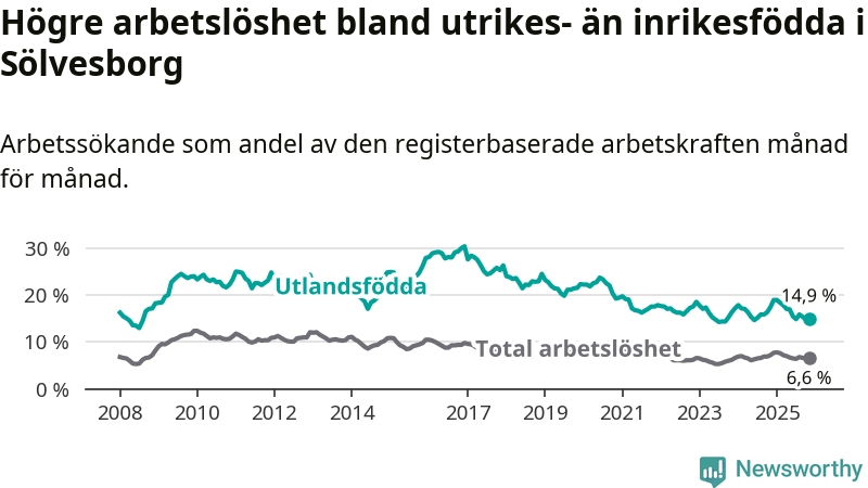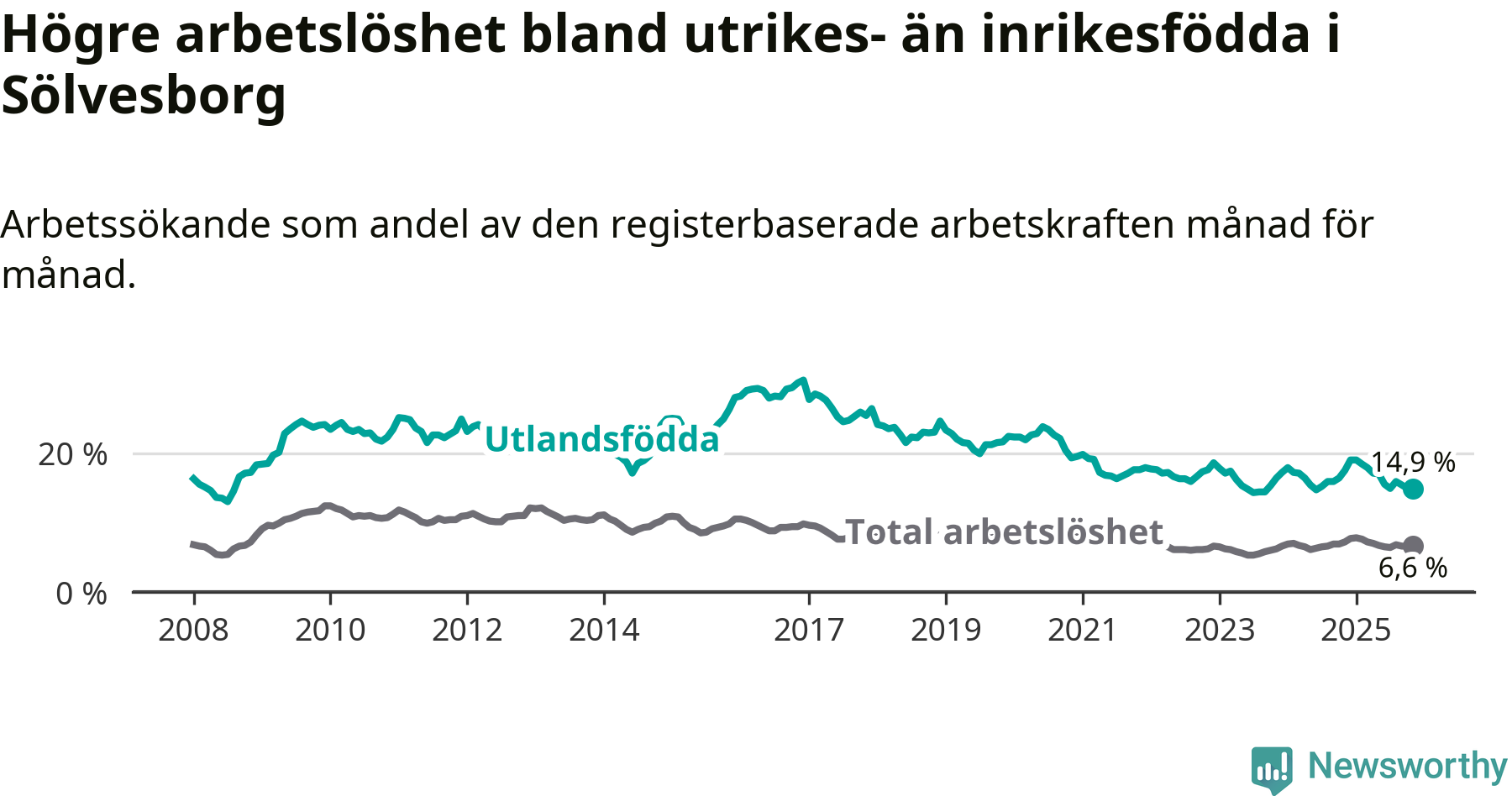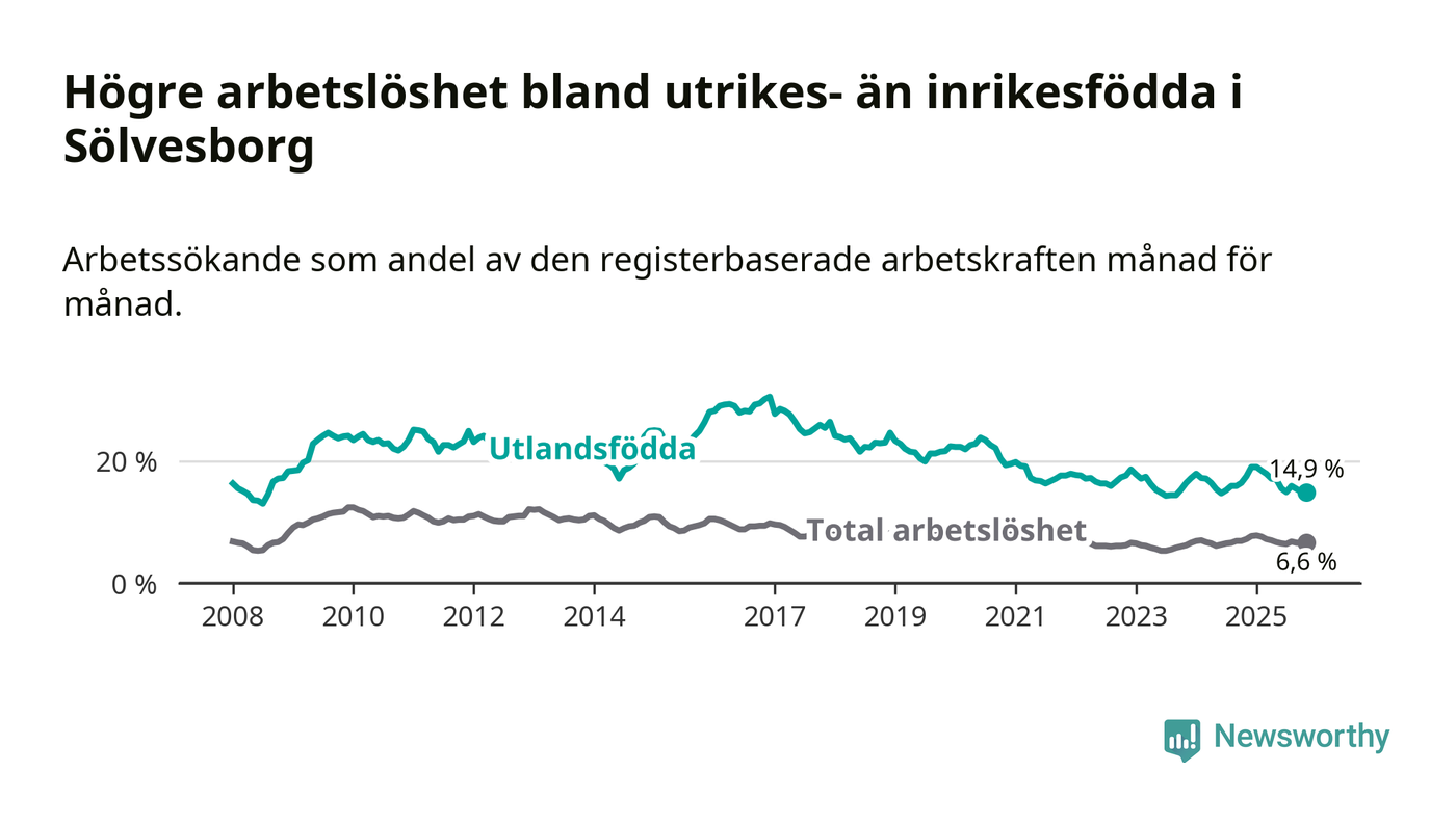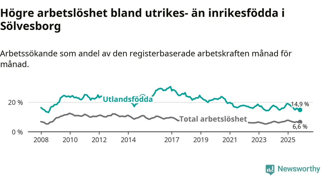 Skillnaden i arbetslöshet mellan utrikesfödda och hela befolkningen är 8,3 procentenheter i Sölvesborg. Det är en betydligt mindre skillnad än för ett år sedan (−2,0 procentenheter).
