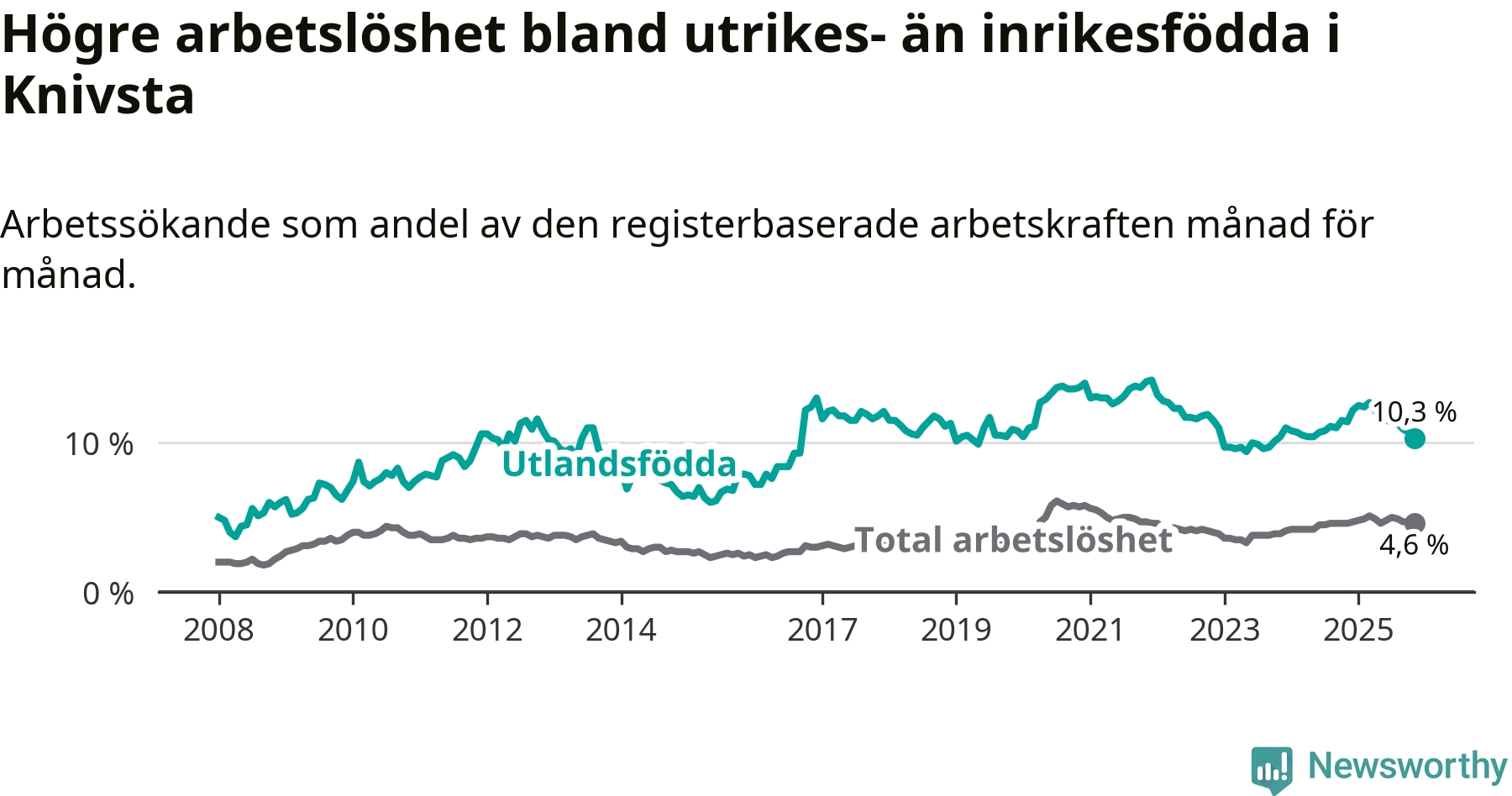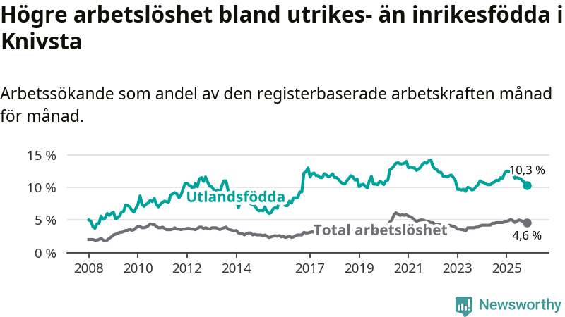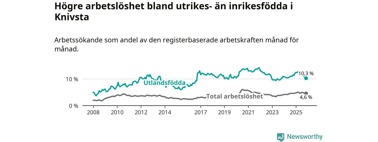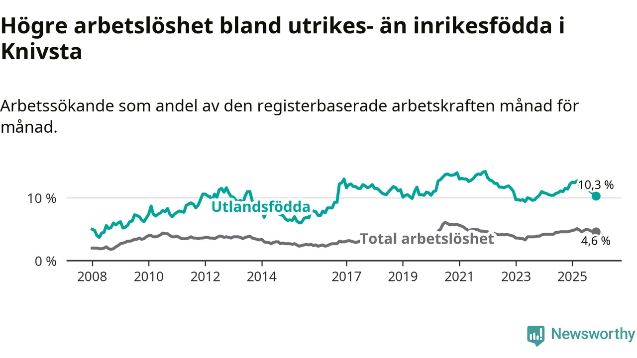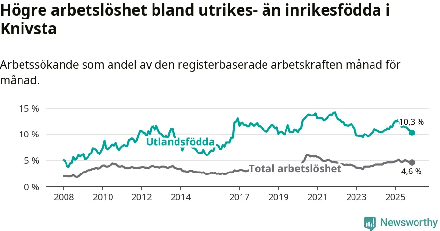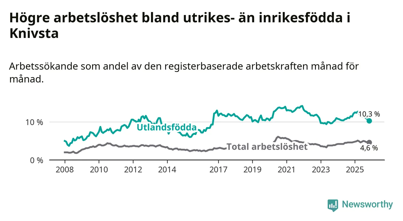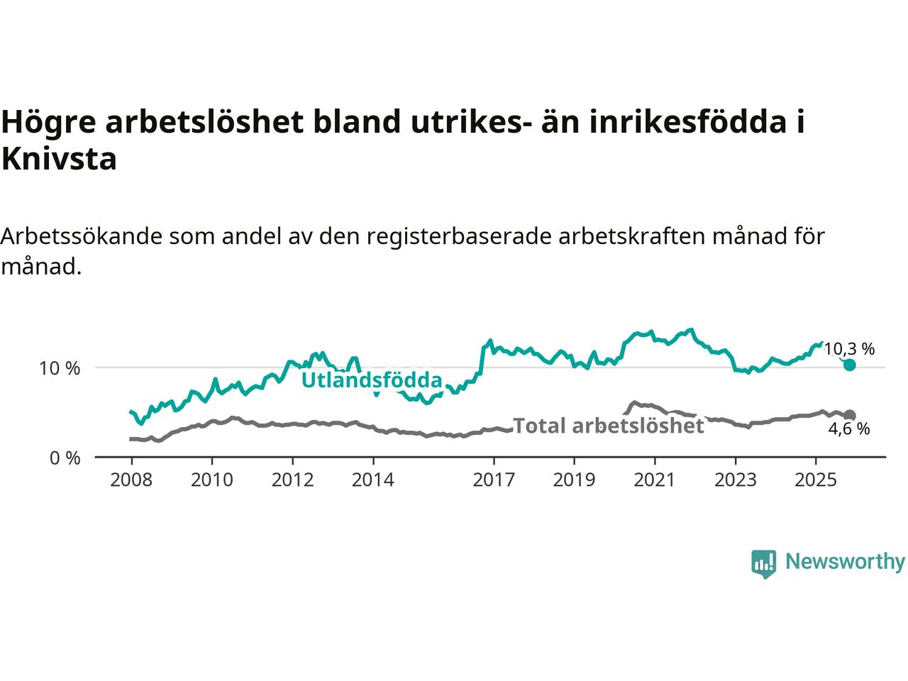 Skillnaden i arbetslöshet mellan utrikesfödda och hela befolkningen är 5,7 procentenheter i Knivsta. Det är en mindre skillnad än för ett år sedan (−1,1 procentenheter).