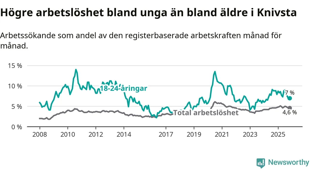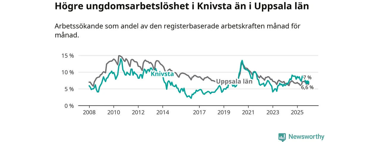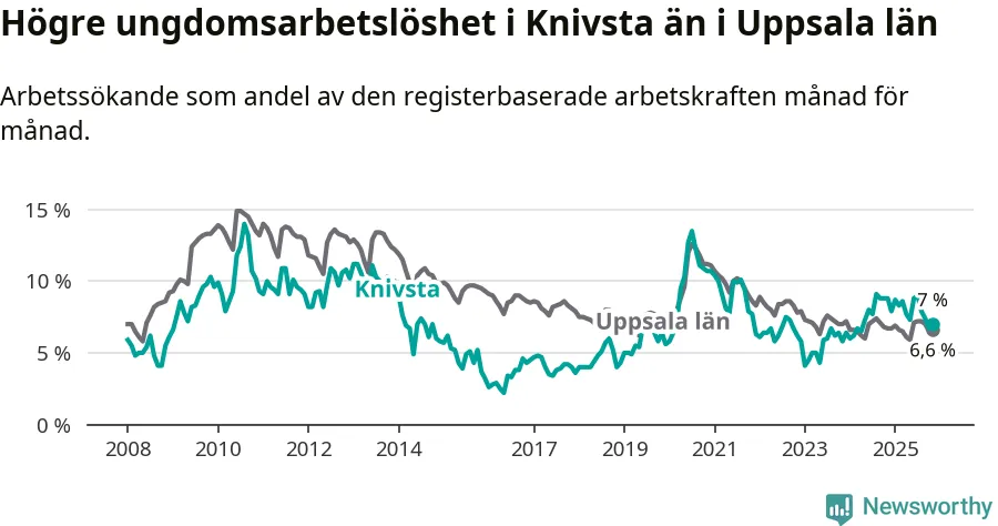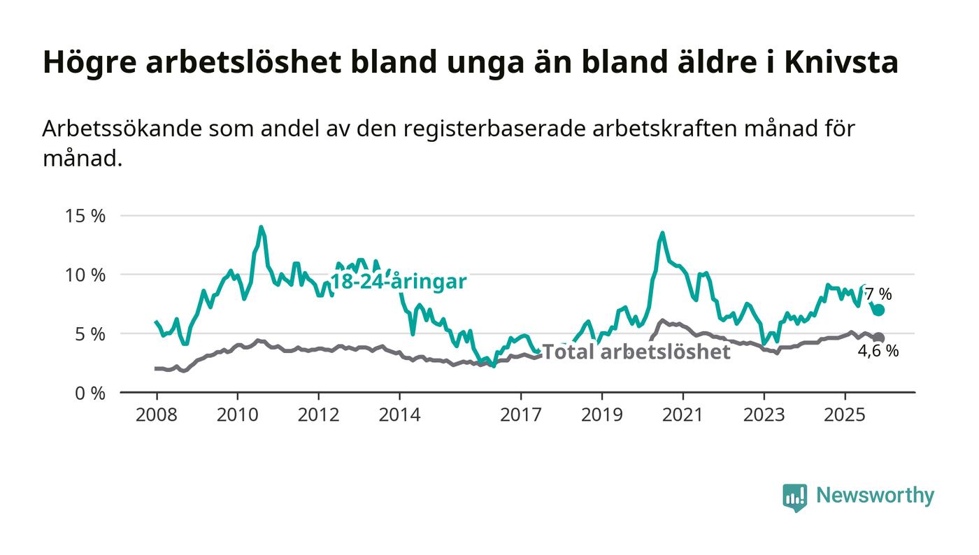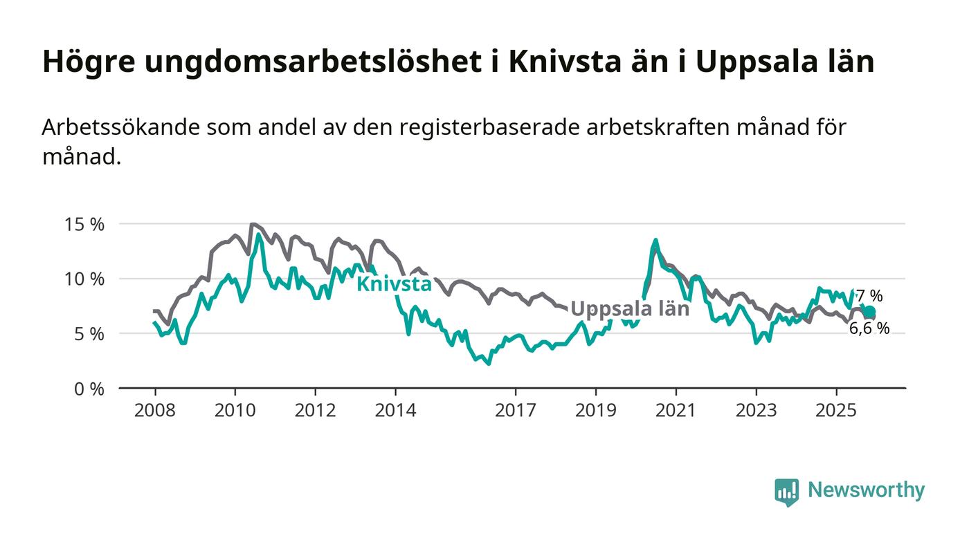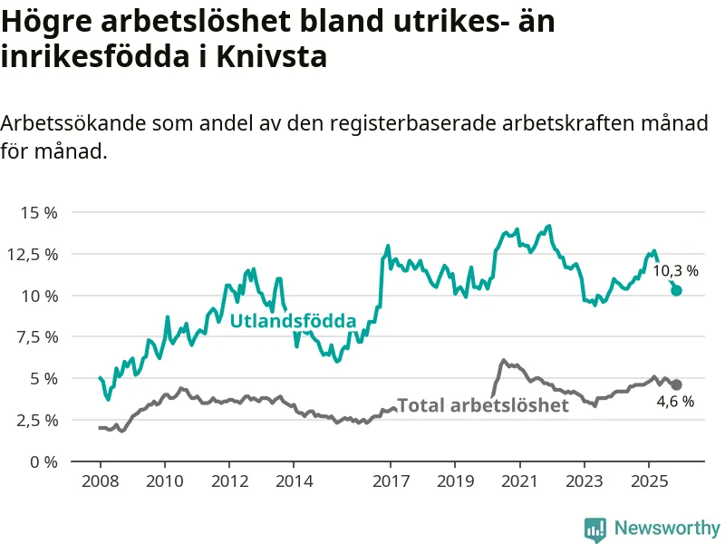 Skillnaden i arbetslöshet mellan utrikesfödda och hela befolkningen är 5,7 procentenheter i Knivsta. Det är en mindre skillnad än för ett år sedan (−1,1 procentenheter).