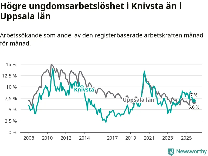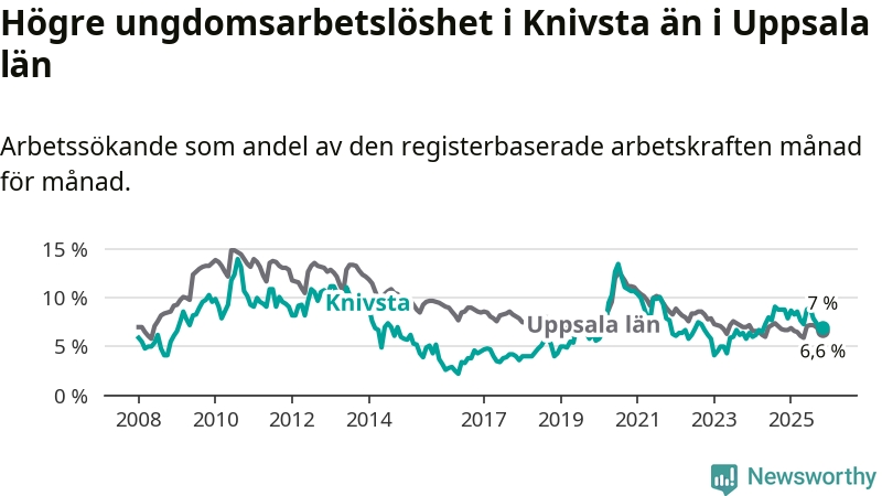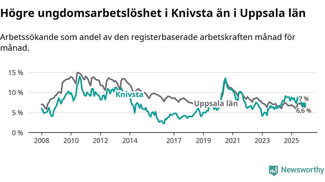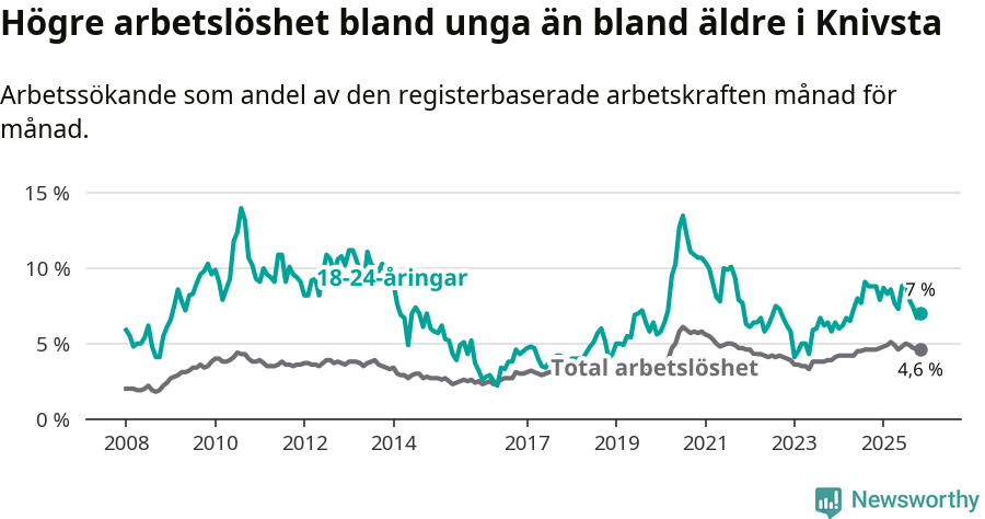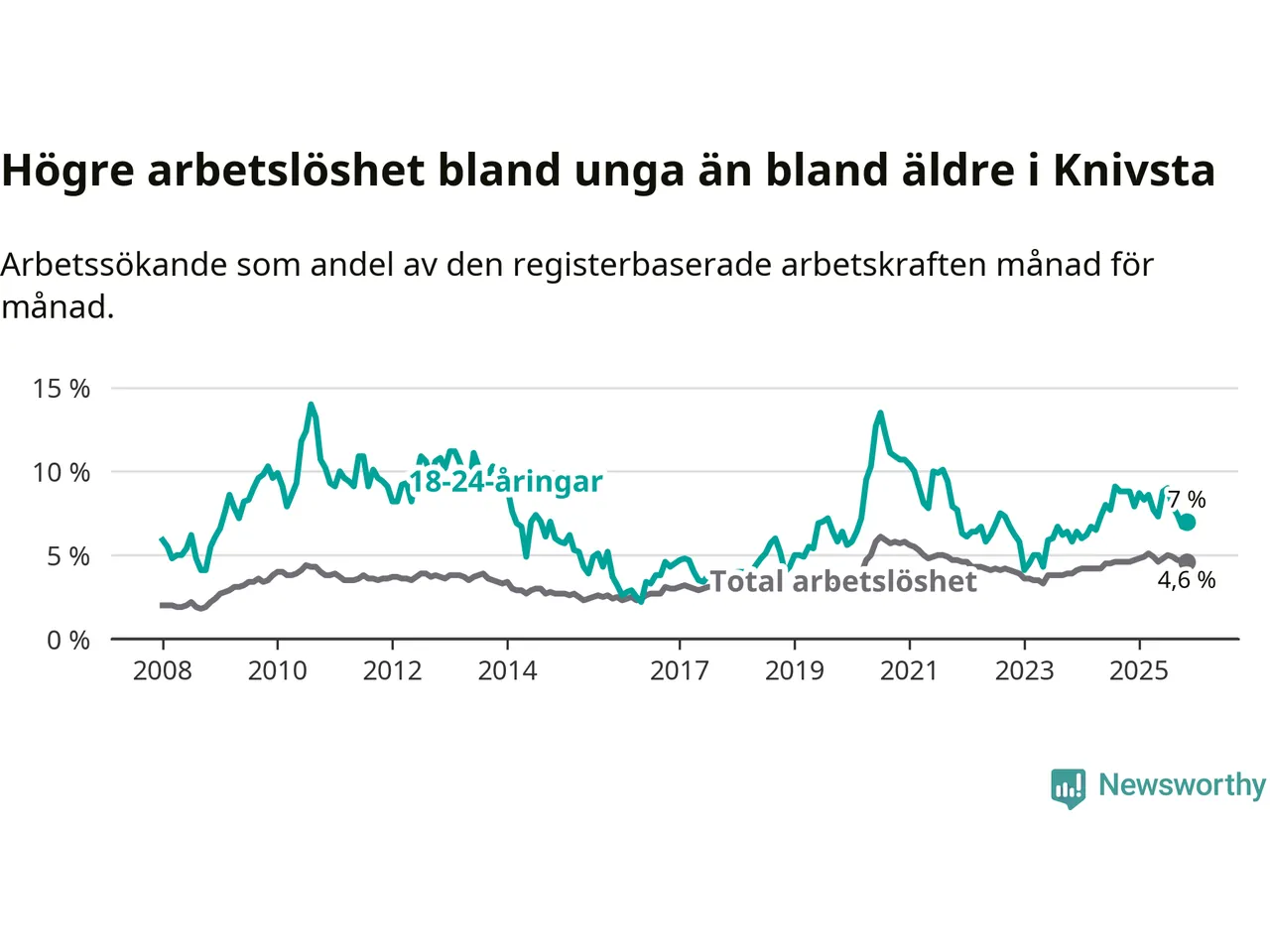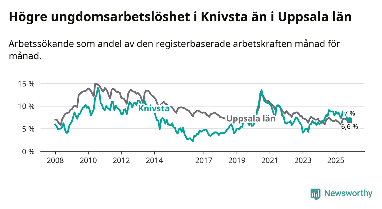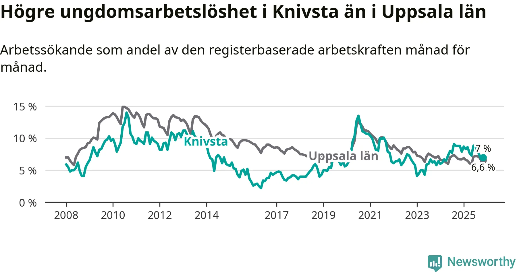 Skillnaden i arbetslöshet mellan utrikesfödda och hela befolkningen är 5,7 procentenheter i Knivsta. Det är en mindre skillnad än för ett år sedan (−1,1 procentenheter).