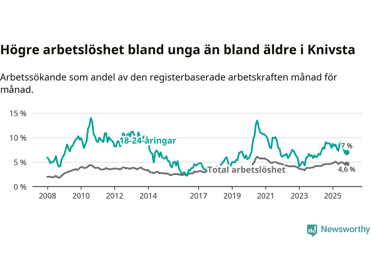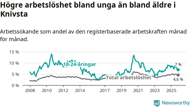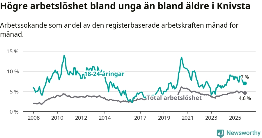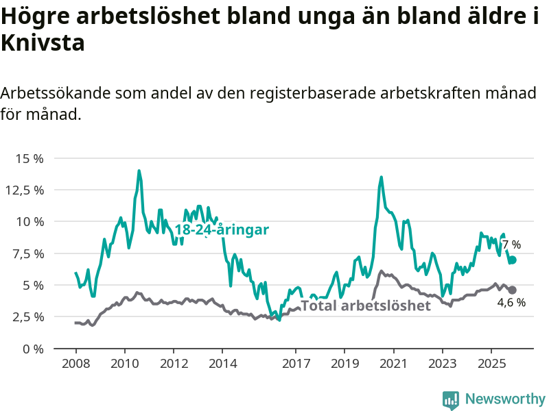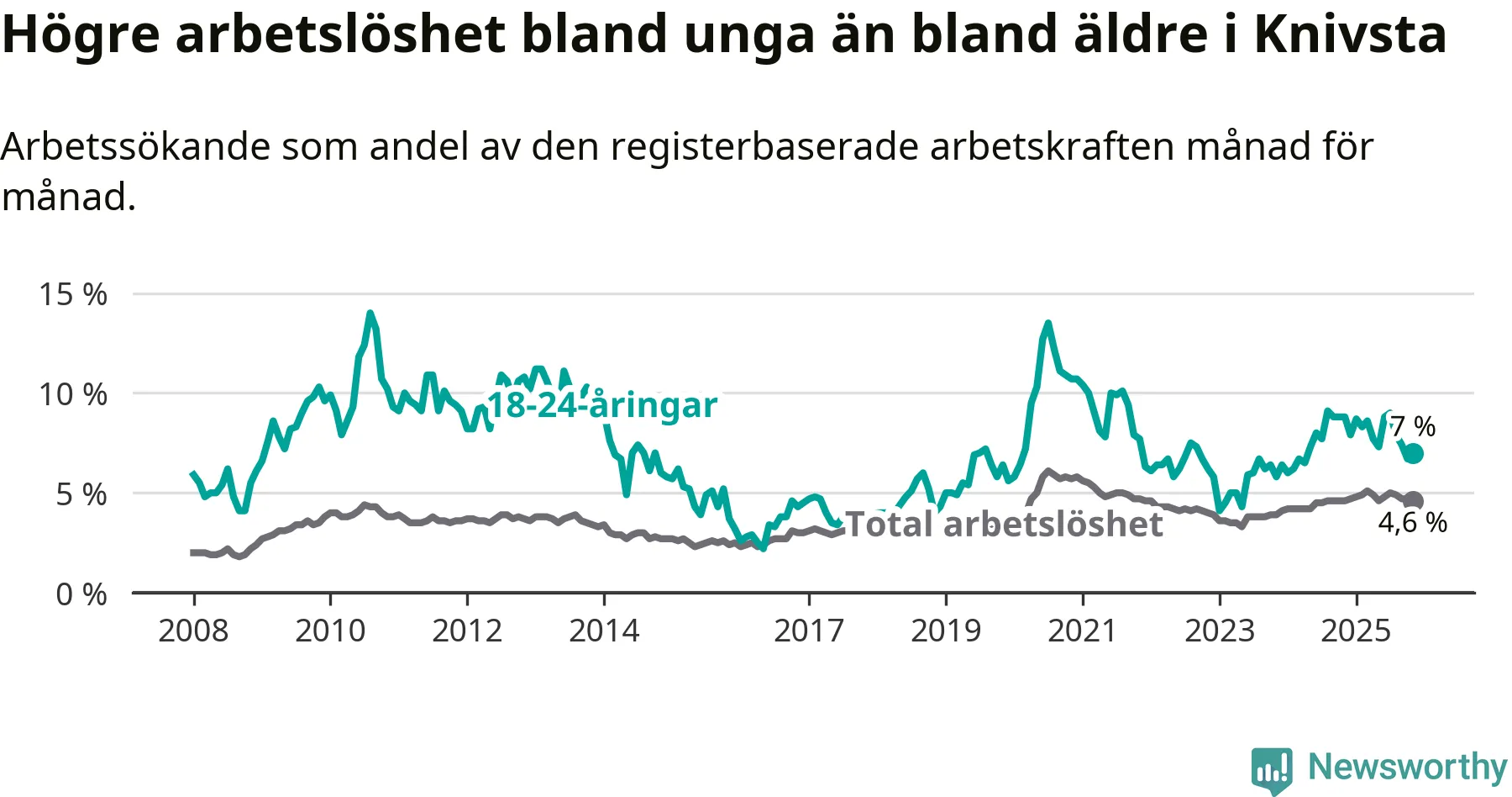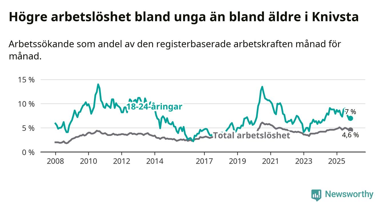 I november var 7,0 procent av 18–24-åringarna inskrivna som arbetssökande (motsvarande 79 personer). Mäter vi antalet inskrivna ser vi en minskning med 17 personer på ett års sikt.