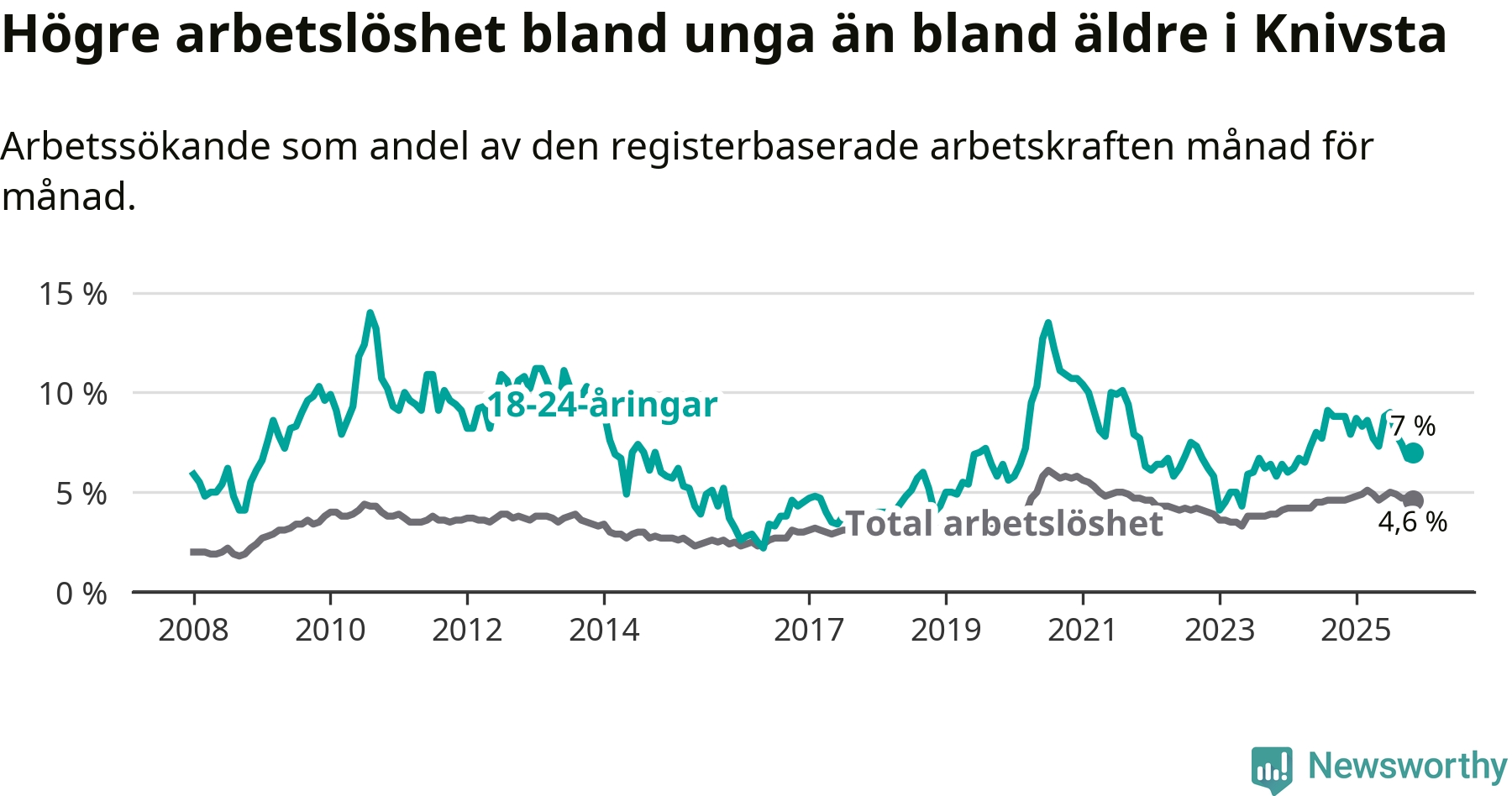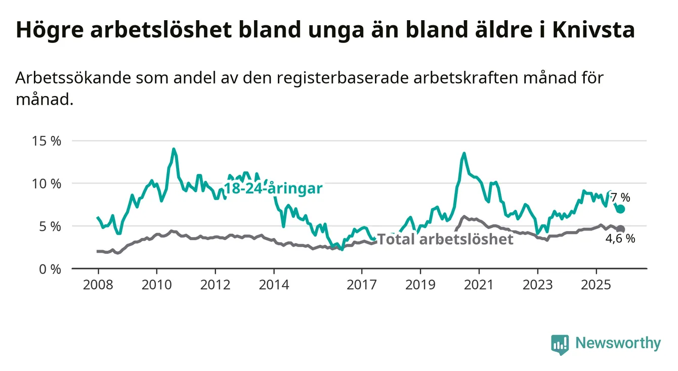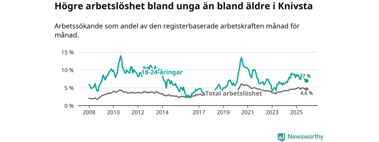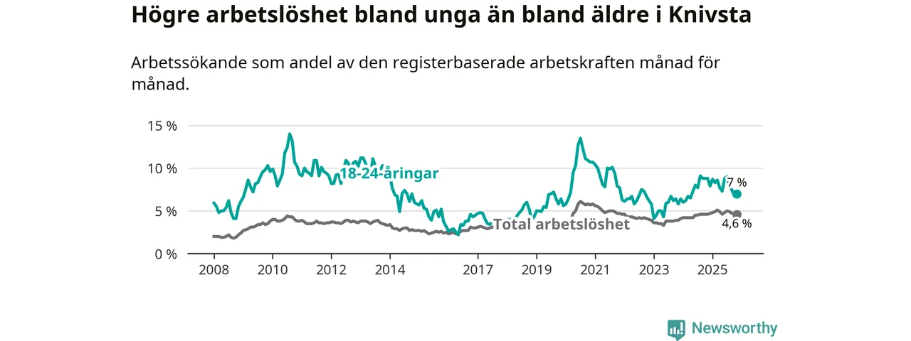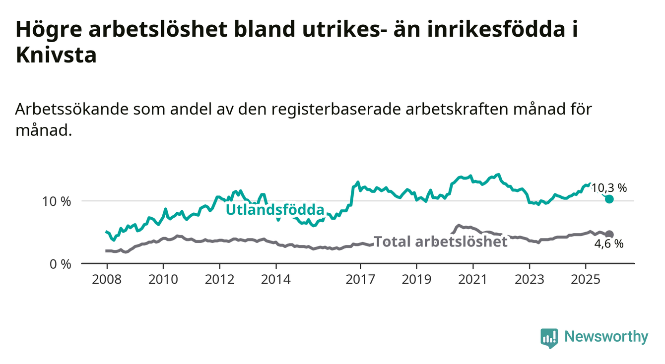 Arbetslösheten bland utlandsfödda var 10,3 procent i Knivsta under november månad, motsvarande 254 av 2 466 personer. Det är 1,1 procentenheter färre än vid samma tidpunkt i fjol (−4 om man räknar personer).