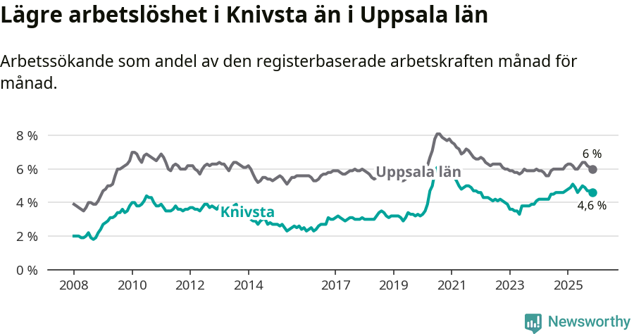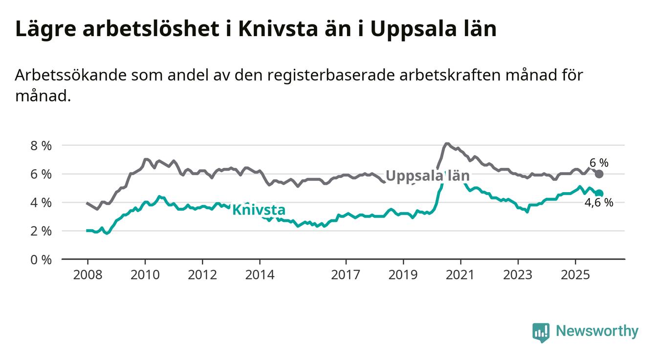 Arbetslösheten i Knivsta ligger under nivån i hela Uppsala län (4,6 procent i kommunen, jämfört med 6,0 procent i hela länet). Östhammar har den lägsta arbetslösheten i länet (3,8 procent), medan Älvkarleby har den högsta (7,6 procent). För att Knivsta skulle komma ner i samma arbetslöshetsnivå som Östhammar skulle 90 personer behöva sysselsättas.