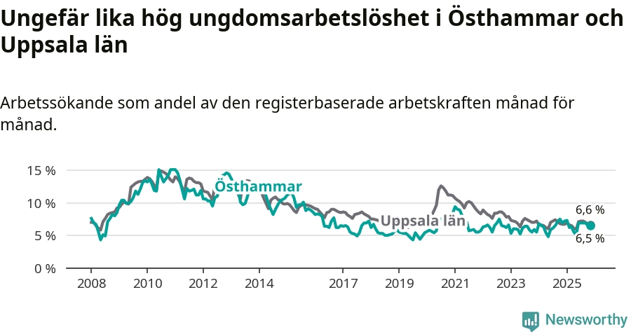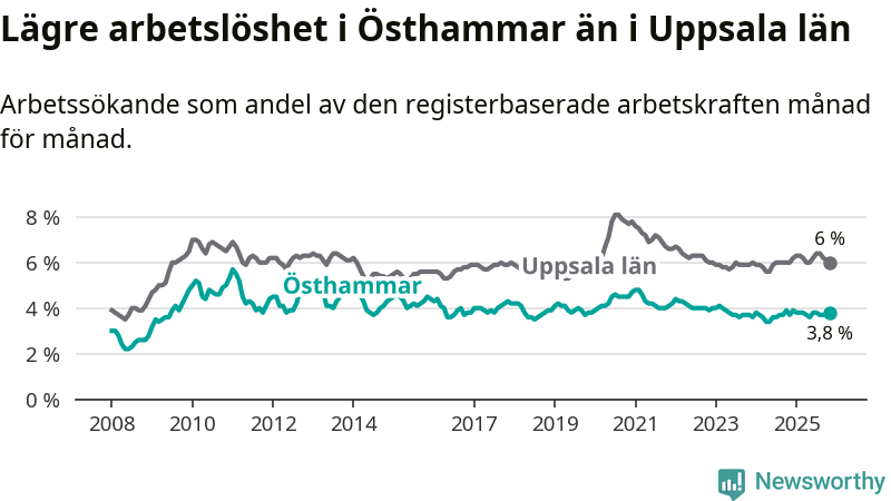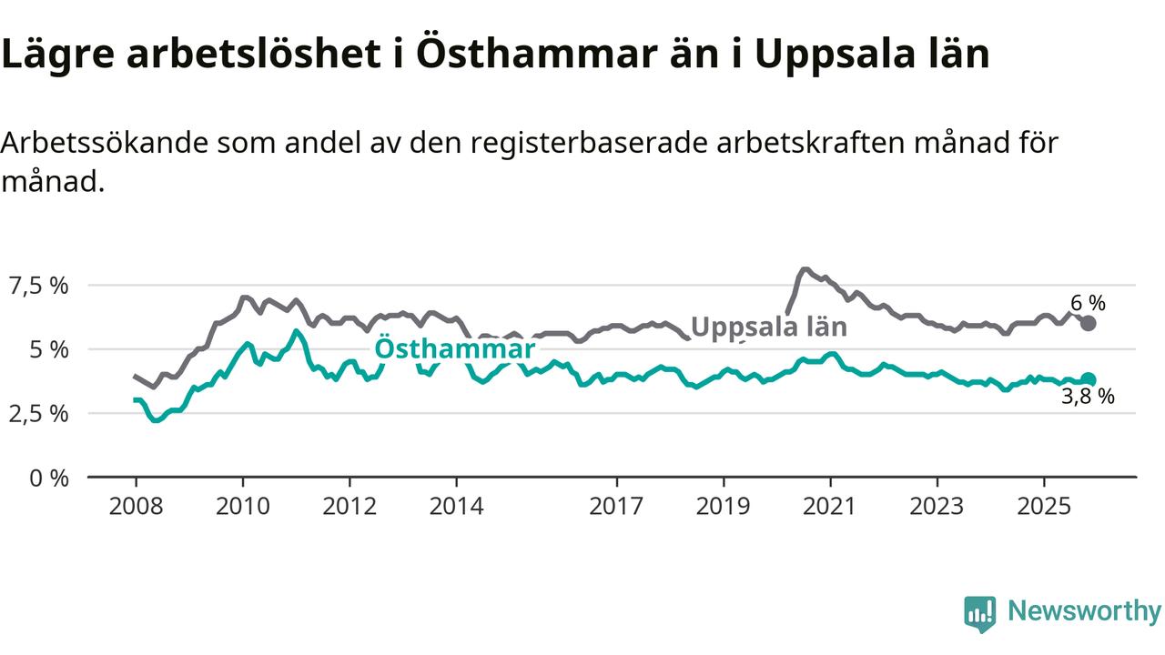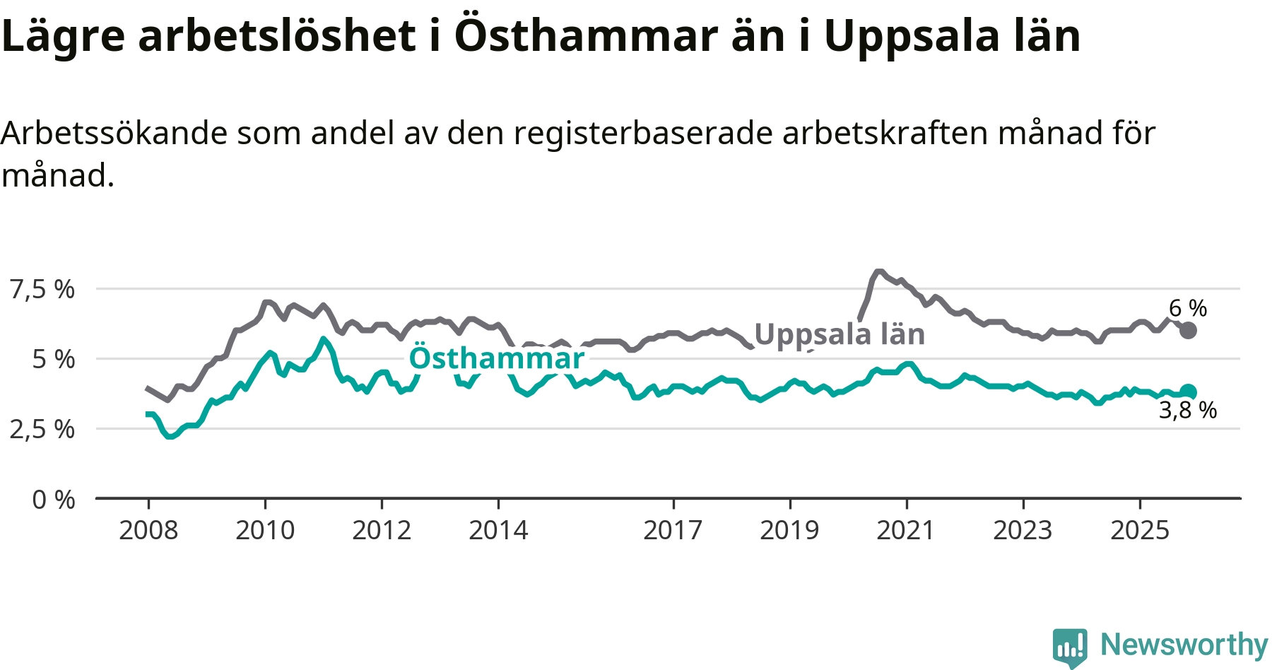 i hela Uppsala län (3,8 procent i kommunen, jämfört med 6,0 procent i hela länet). Östhammar har därmed även den lägsta arbetslöshetsnivån i länet. Älvkarleby har den högsta (7,6 procent).