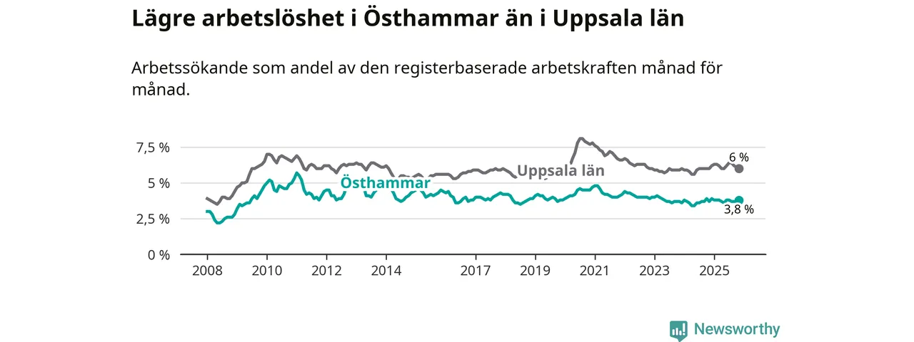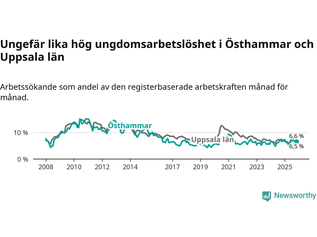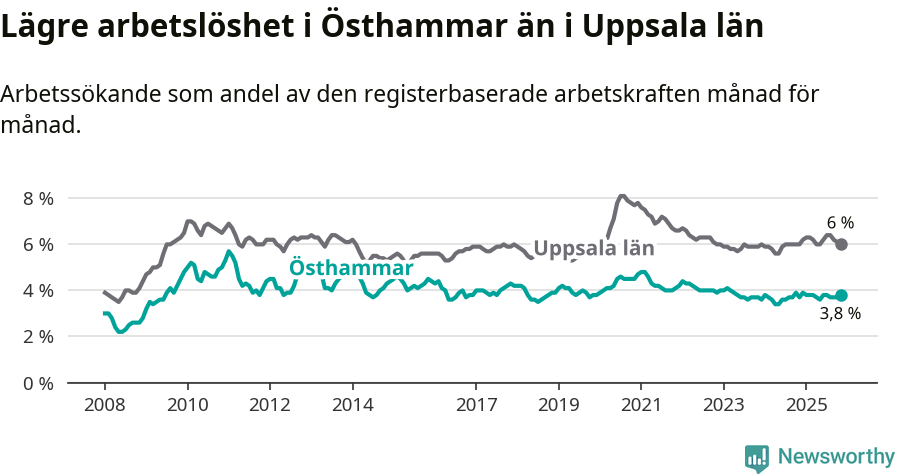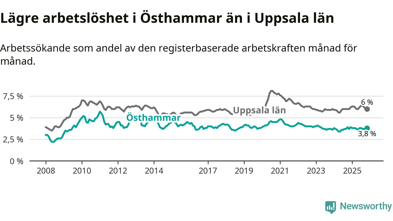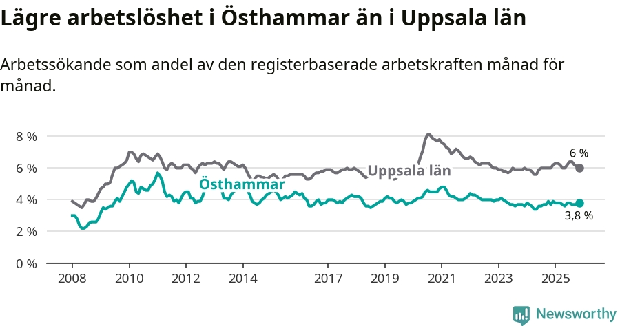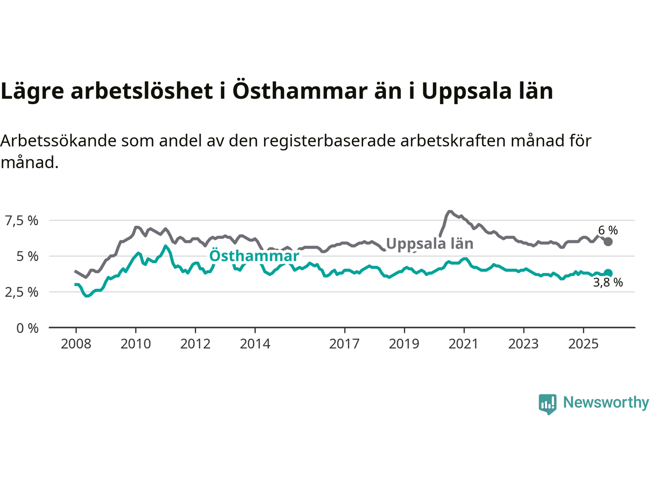 Under november månad rapporterade Östhammars kommun en total arbetslöshet på 3,8 procent. Det är en ökning jämfört med samma tidpunkt i fjol (+0,1 procentenheter). I Uppsala län däremot står arbetslösheten stilla.