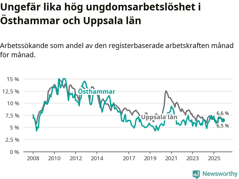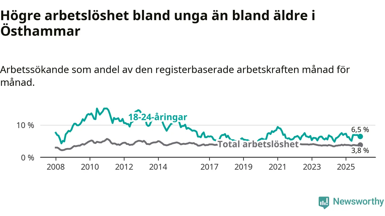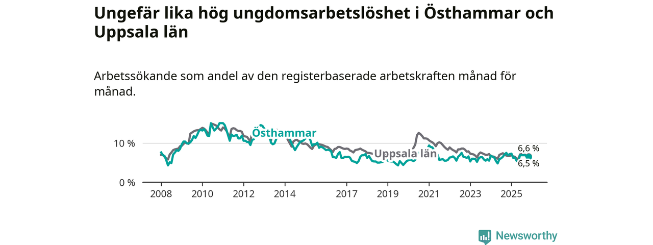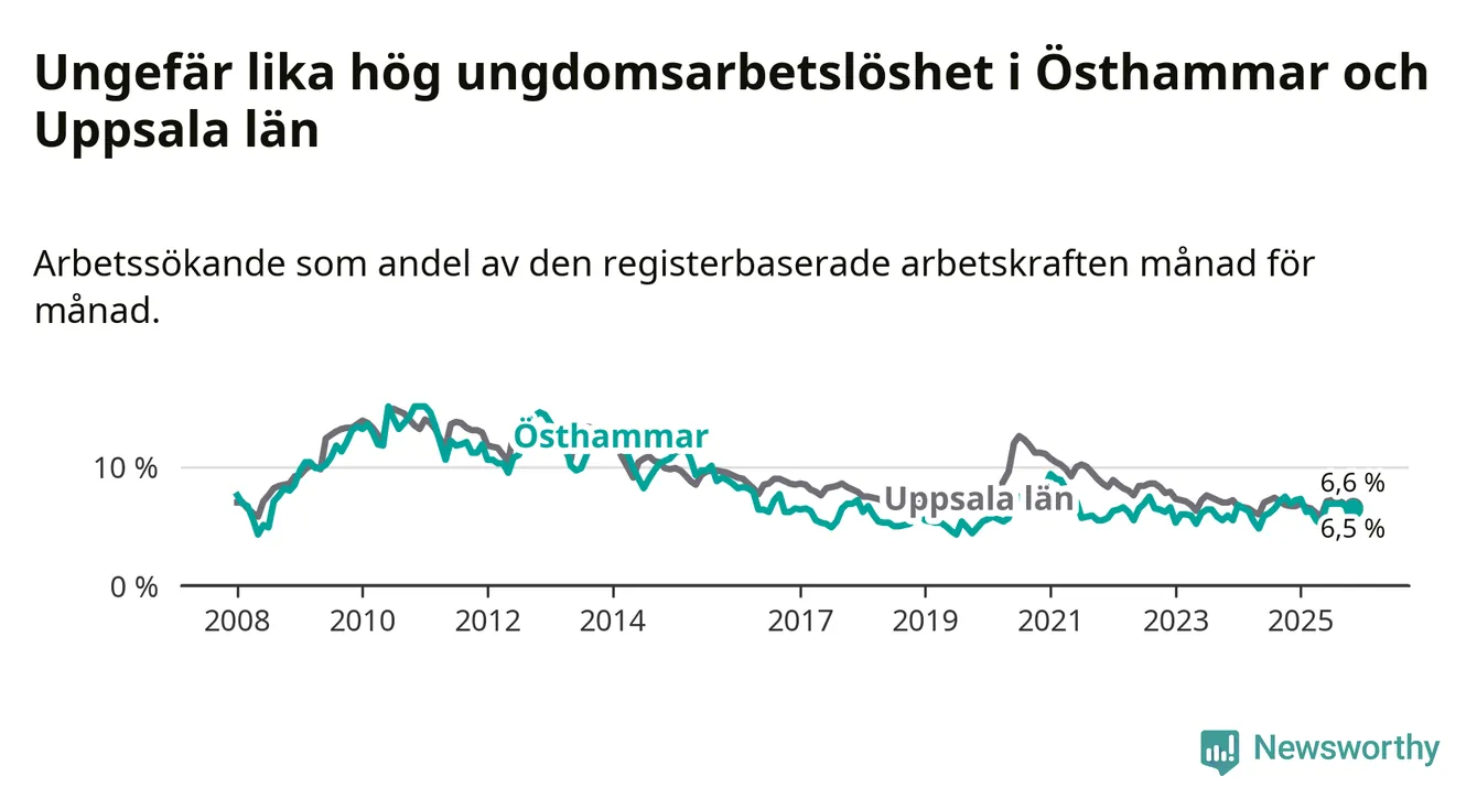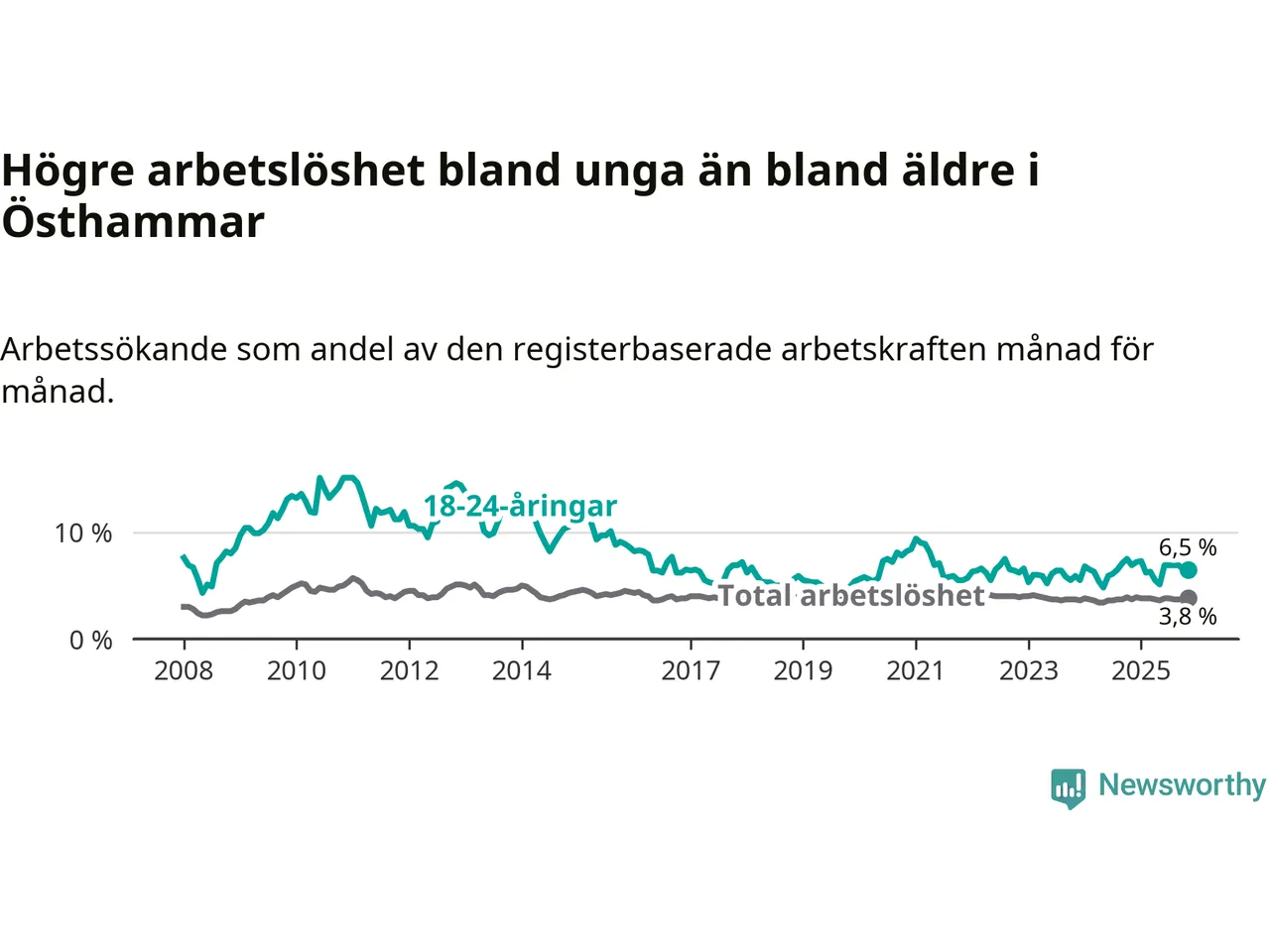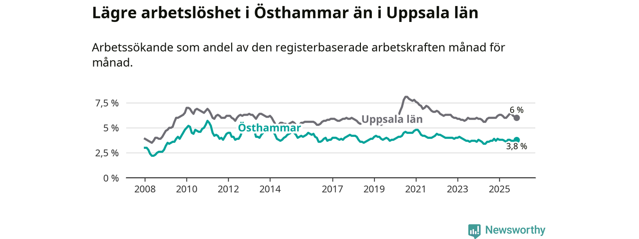 Under november månad rapporterade Östhammars kommun en total arbetslöshet på 3,8 procent. Det är en ökning jämfört med samma tidpunkt i fjol (+0,1 procentenheter). I Uppsala län däremot står arbetslösheten stilla.