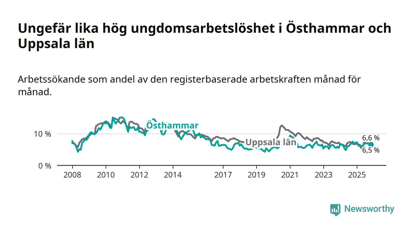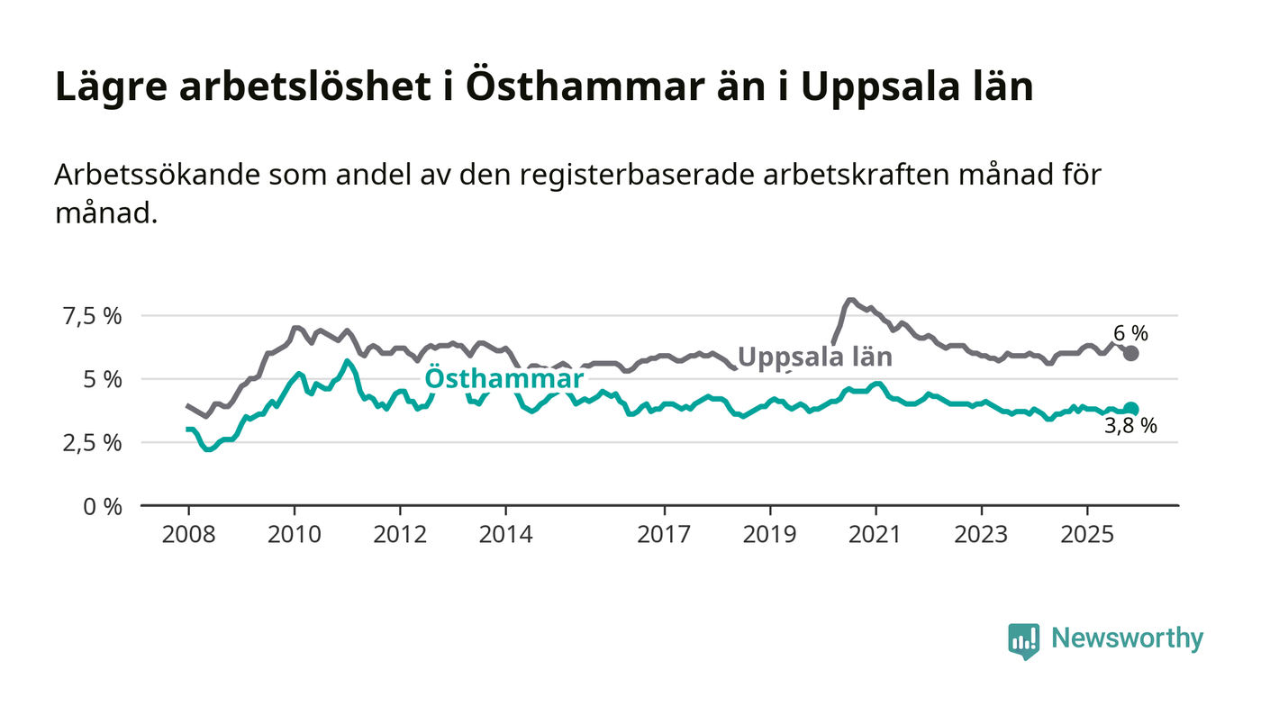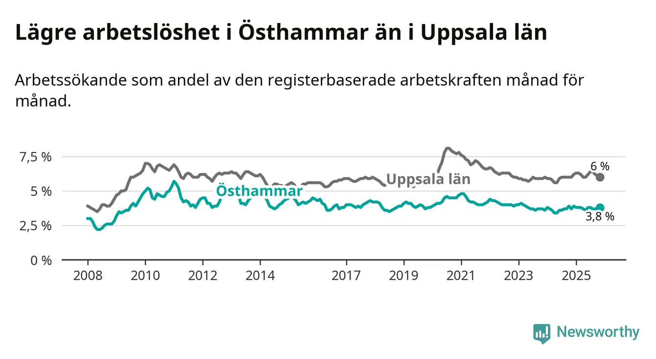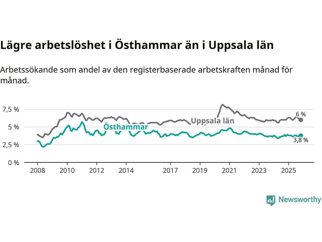 Ny statistik från Arbetsförmedlingen visar på en uppgång i arbetslöshet i Östhammars kommun. I Uppsala däremot står arbetslösheten stilla.
