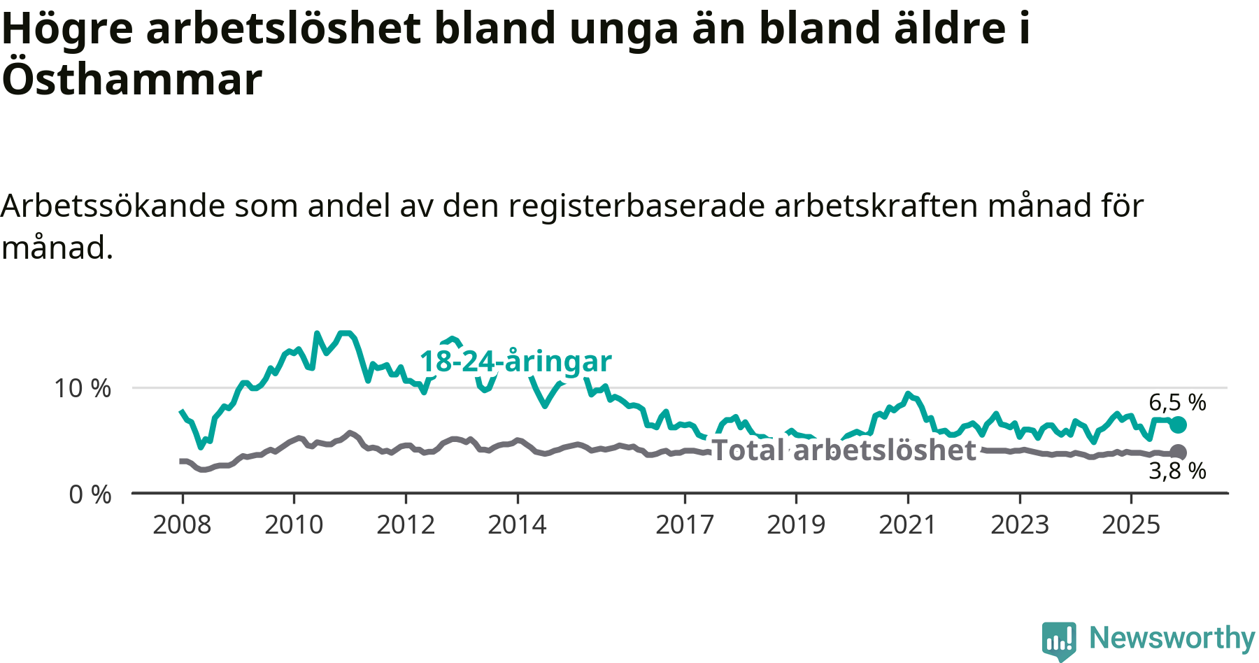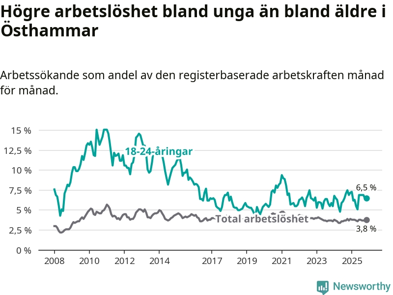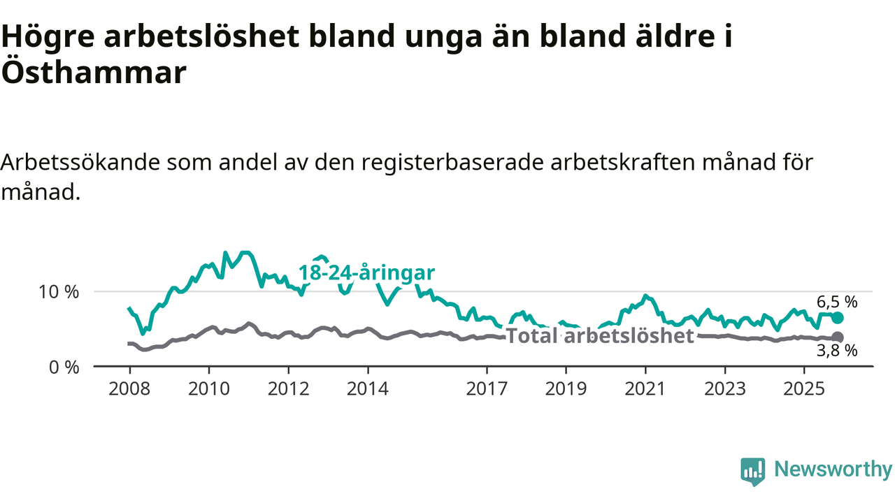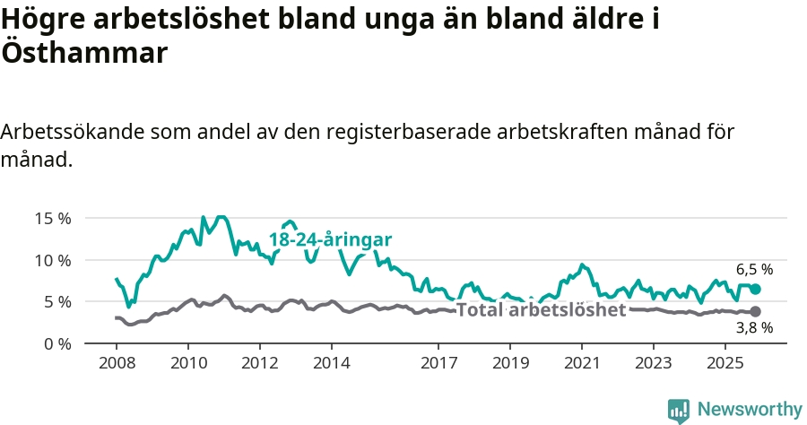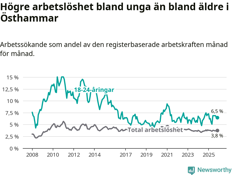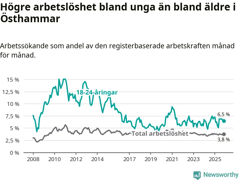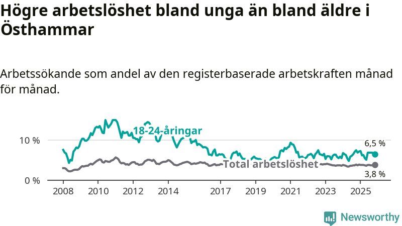 I november var 6,5 procent av 18–24-åringarna inskrivna som arbetssökande (motsvarande 64 personer). Mäter vi antalet inskrivna ser vi en minskning med två personer på ett års sikt.