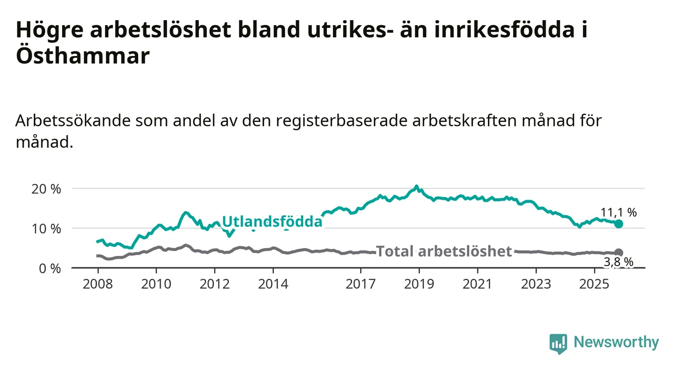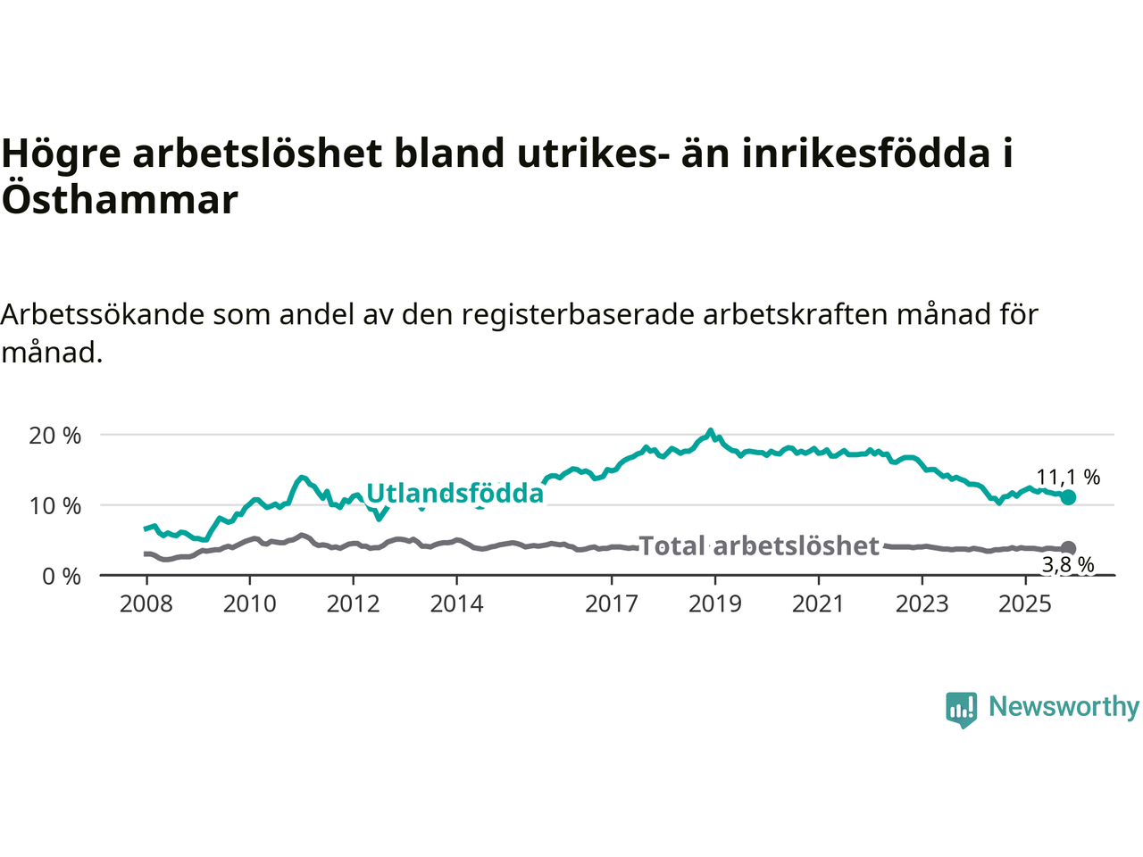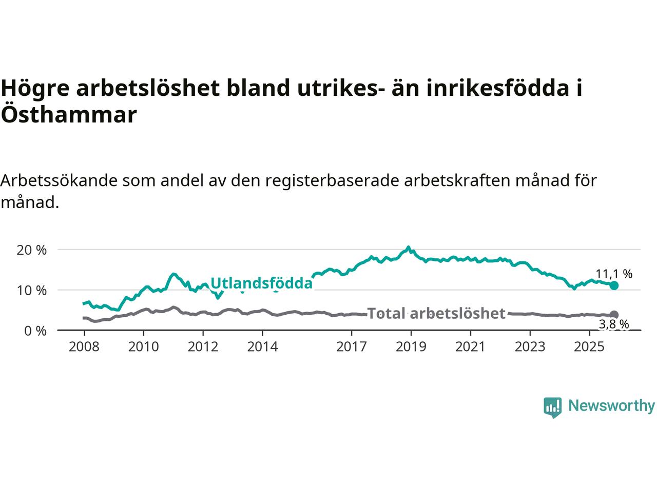 Arbetslösheten bland utlandsfödda var 11,1 procent i Östhammar under november månad, motsvarande 128 av 1 153 personer. Det är 0,1 procentenheter färre än vid samma tidpunkt i fjol (+1 om man räknar personer).