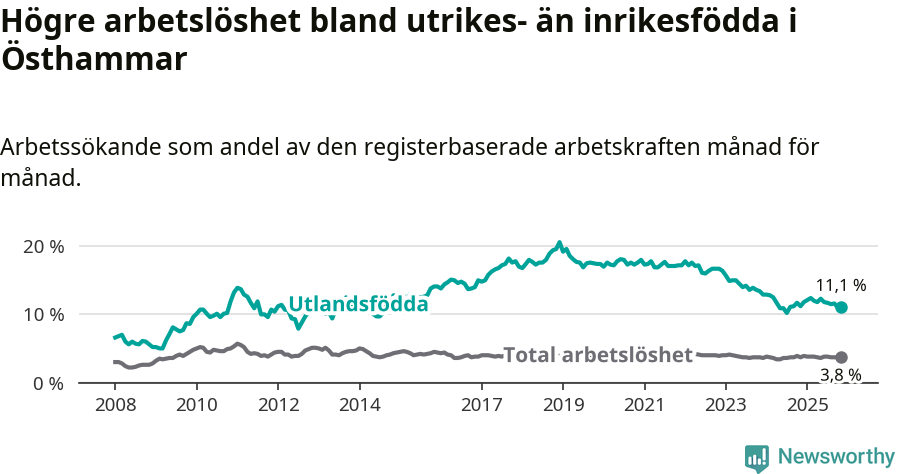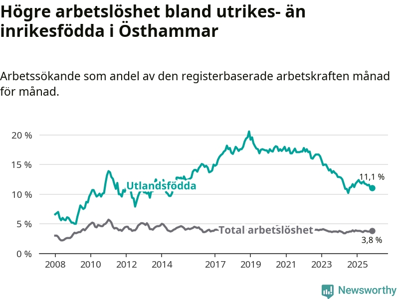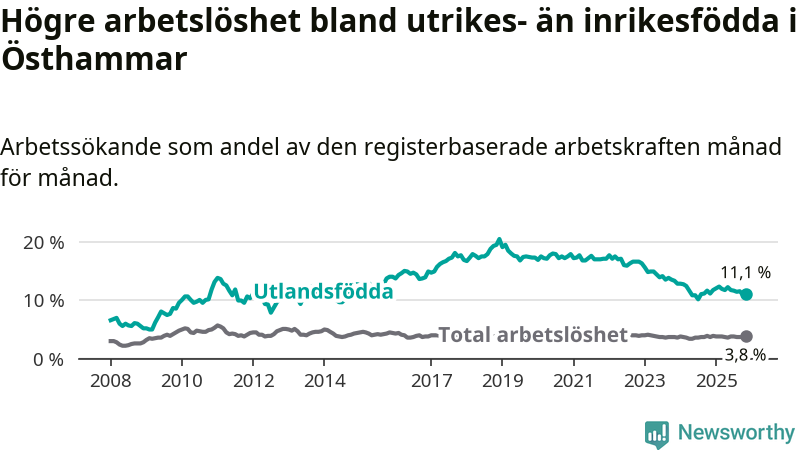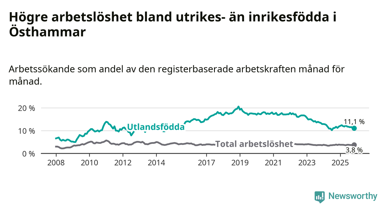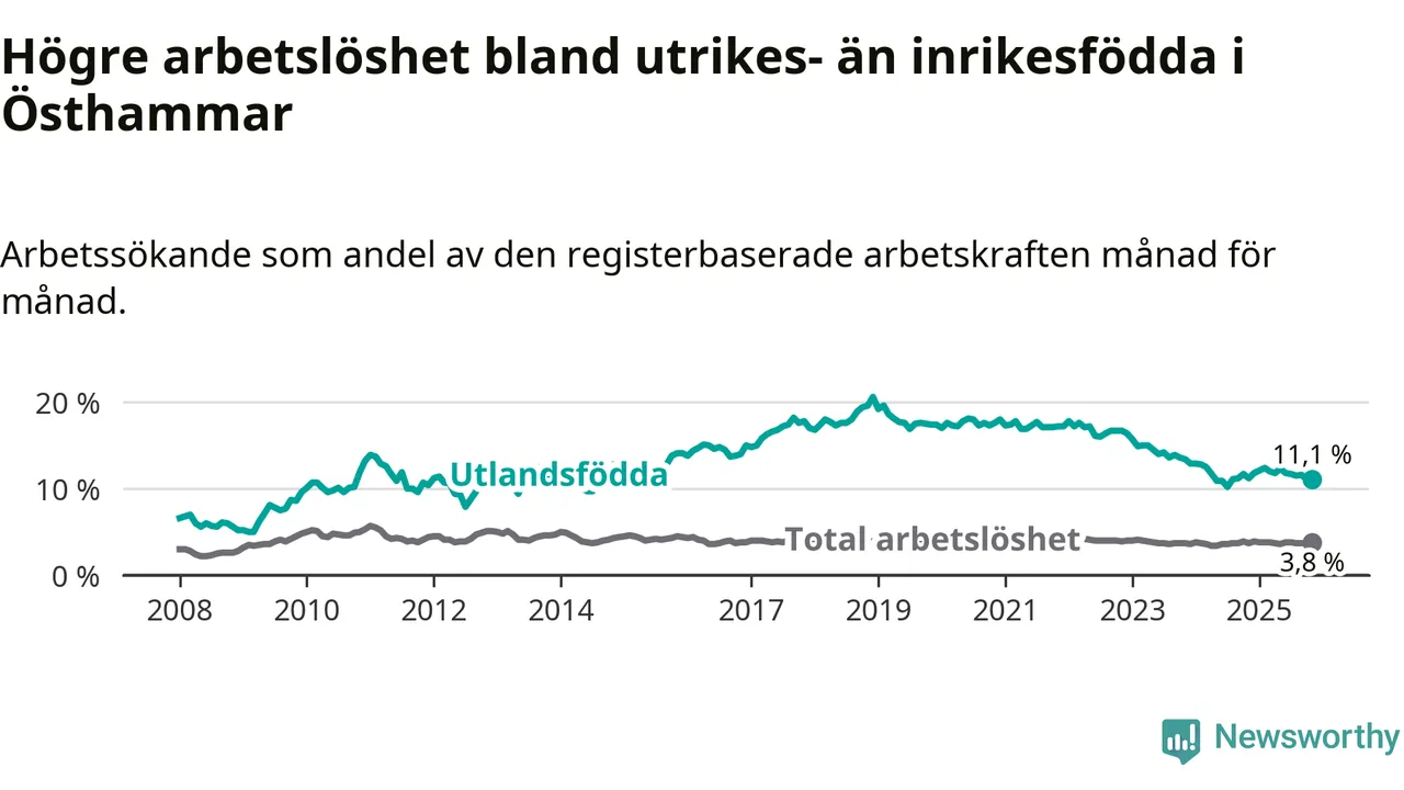 Arbetslösheten bland utlandsfödda var 11,1 procent i Östhammar under november månad, motsvarande 128 av 1 153 personer. Det är 0,1 procentenheter färre än vid samma tidpunkt i fjol (+1 om man räknar personer).