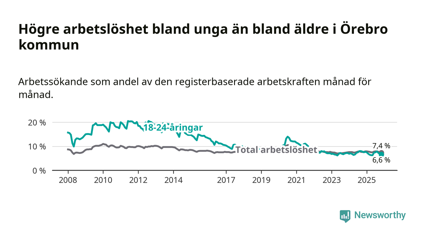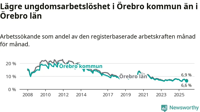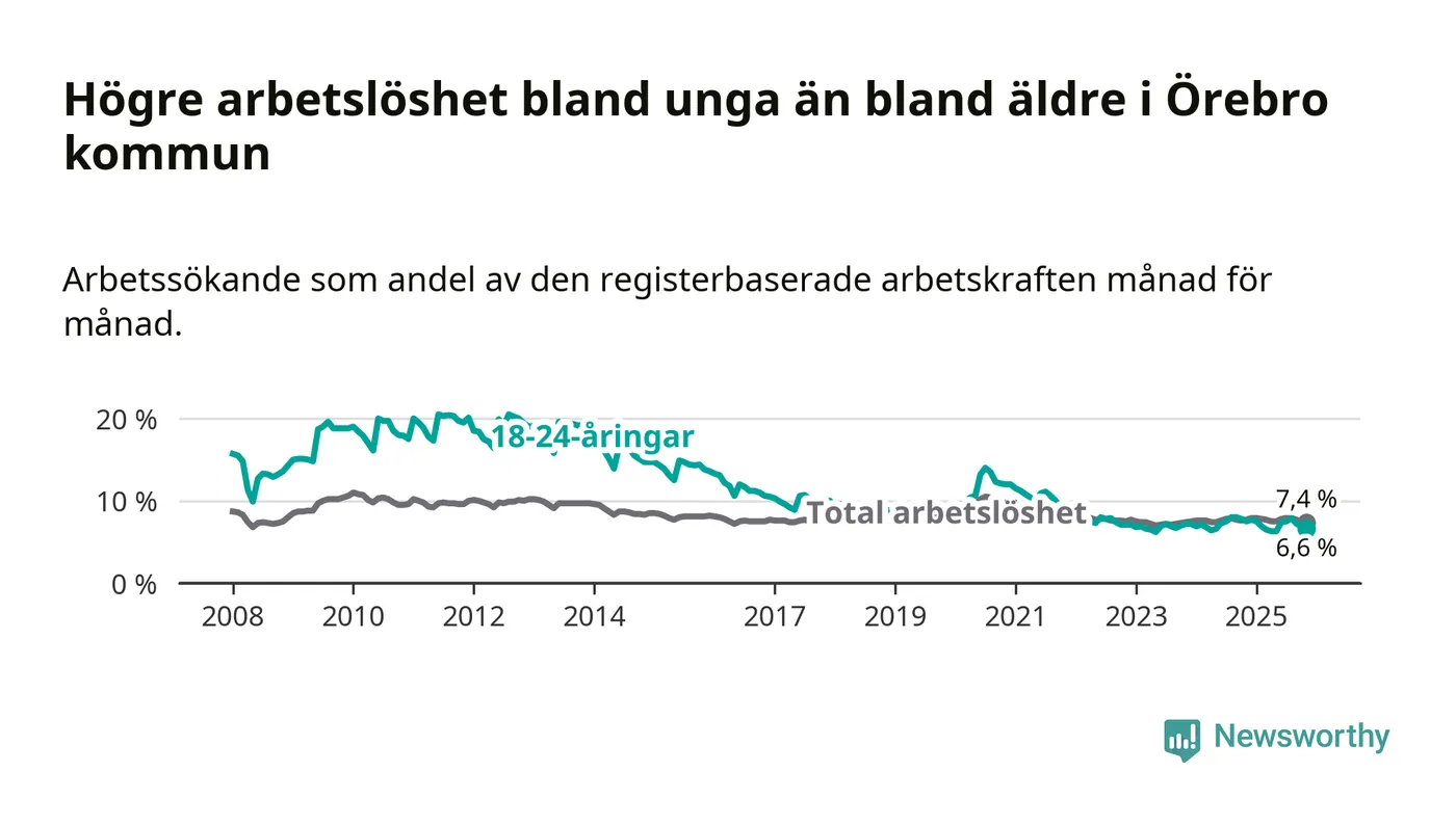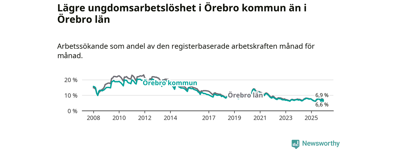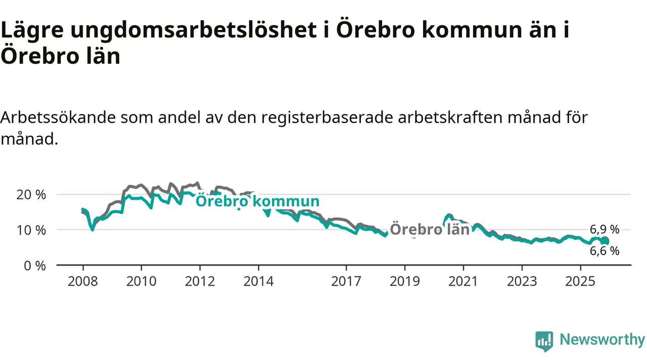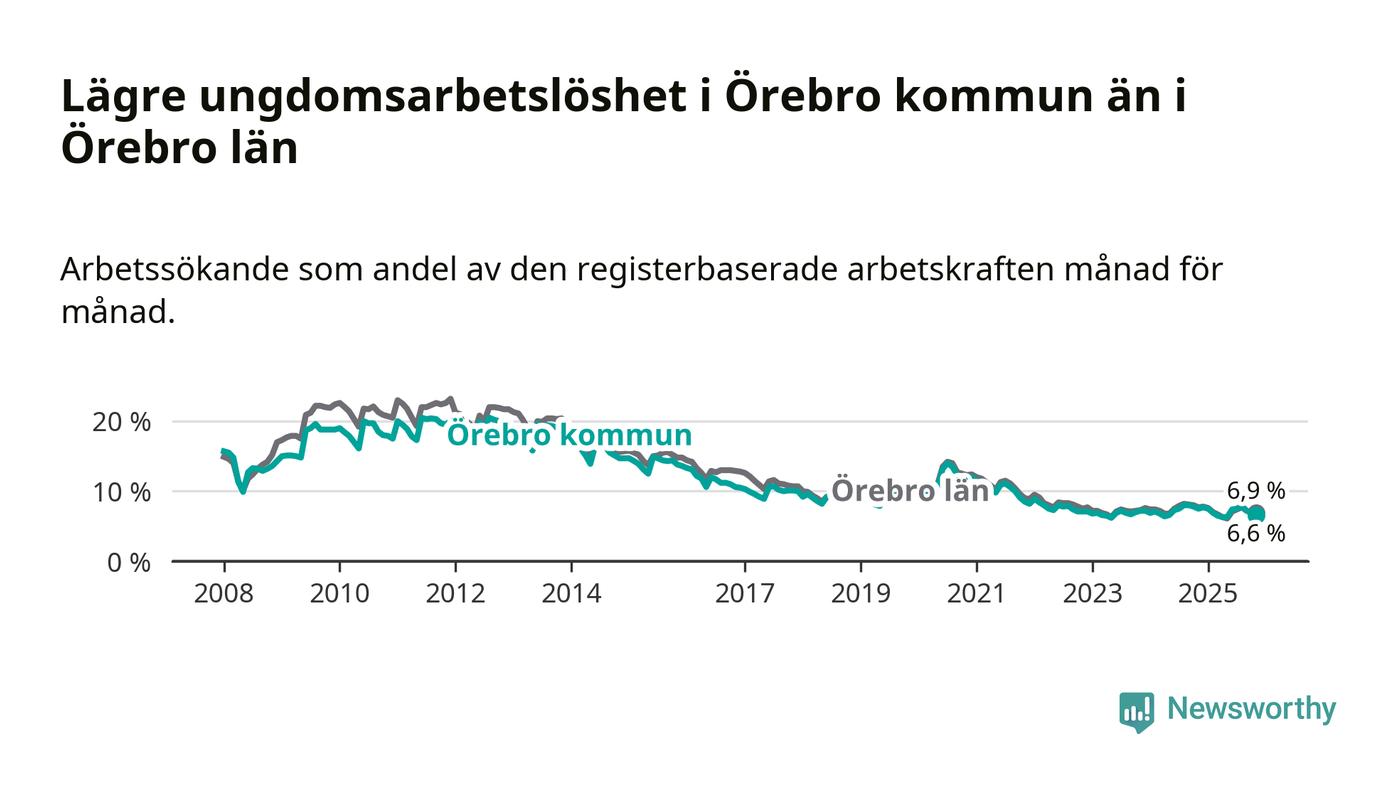 Medan Örebro har högre total arbetslöshet än Örebro, ligger ungdomsarbetslösheten 0,3 procentenheter lägre i Örebro.