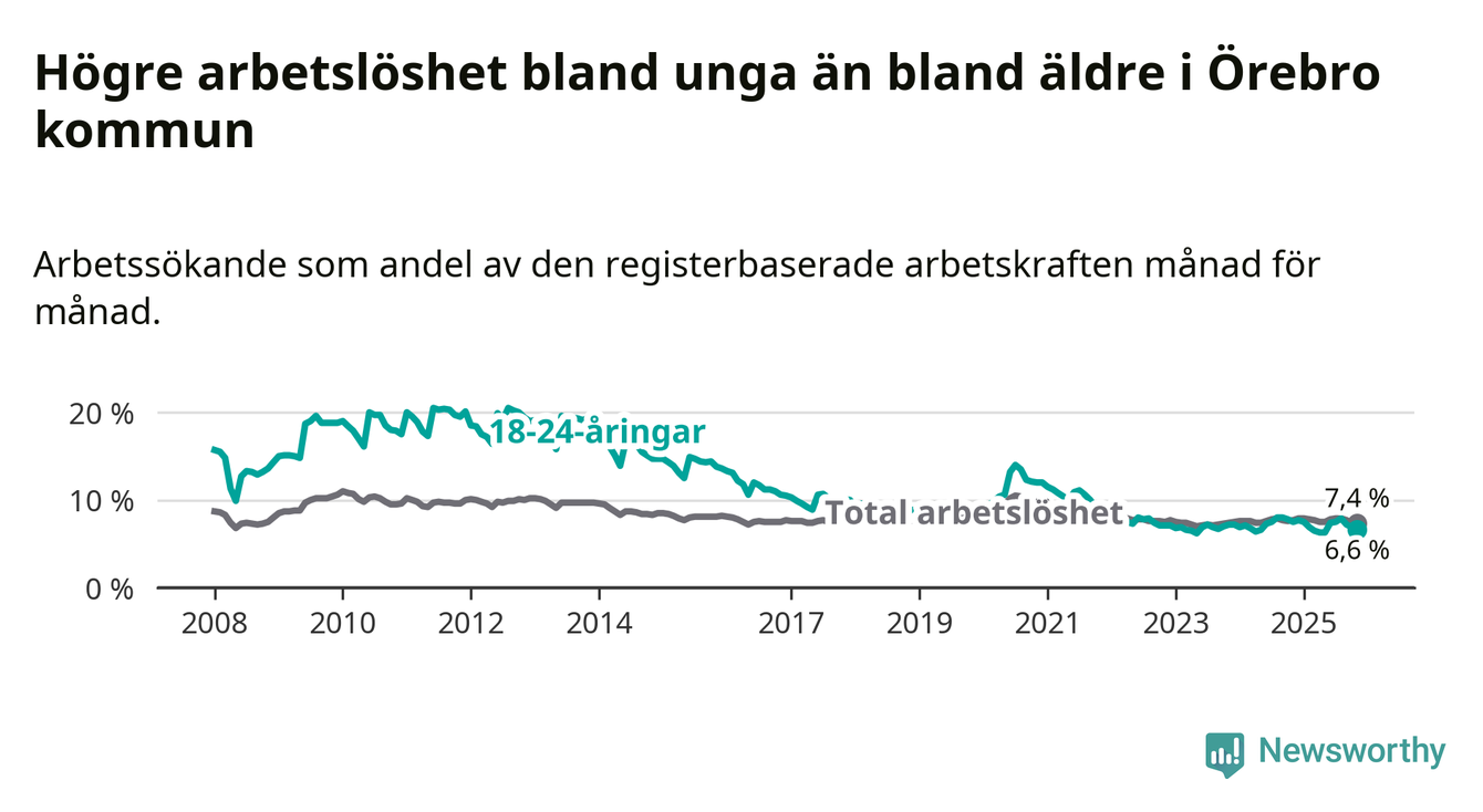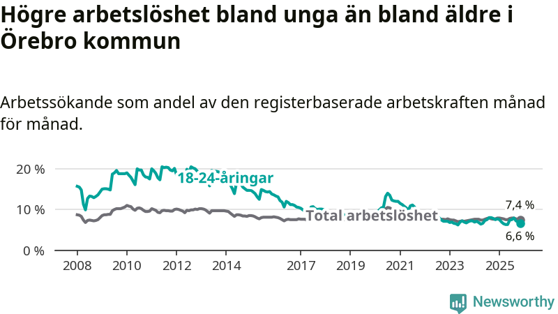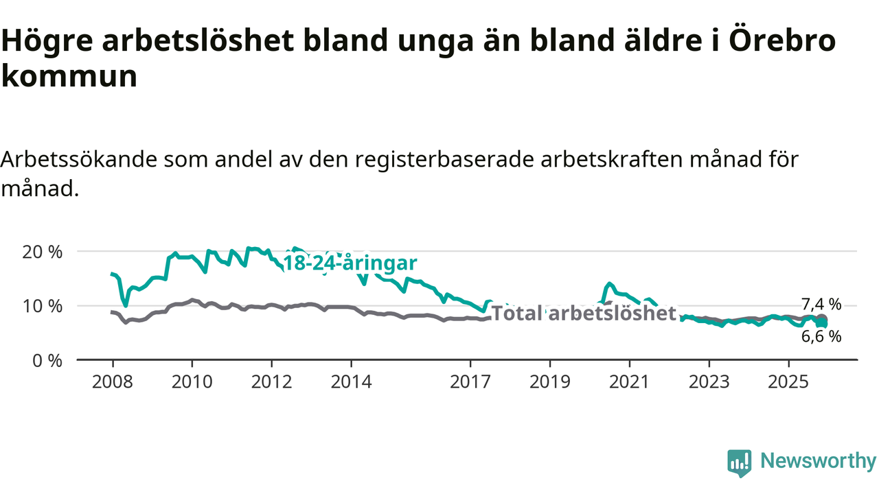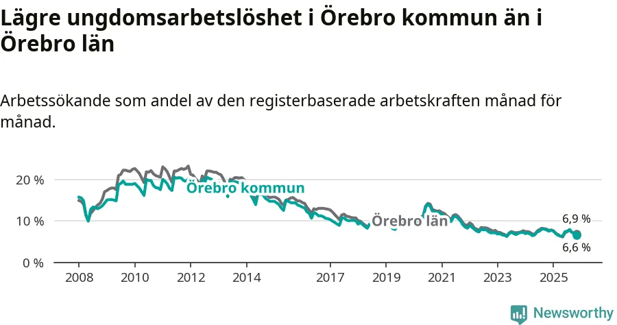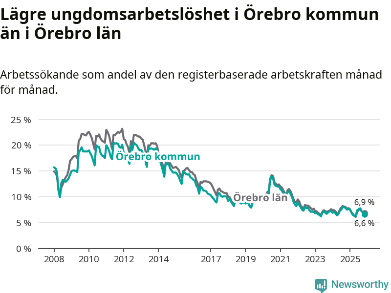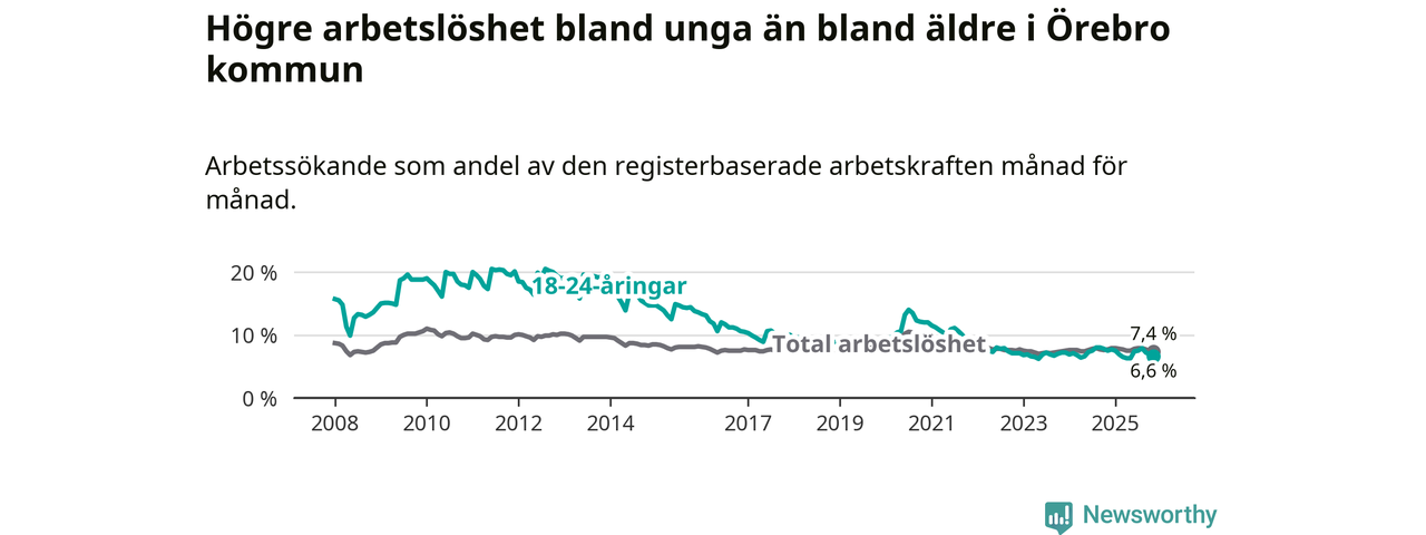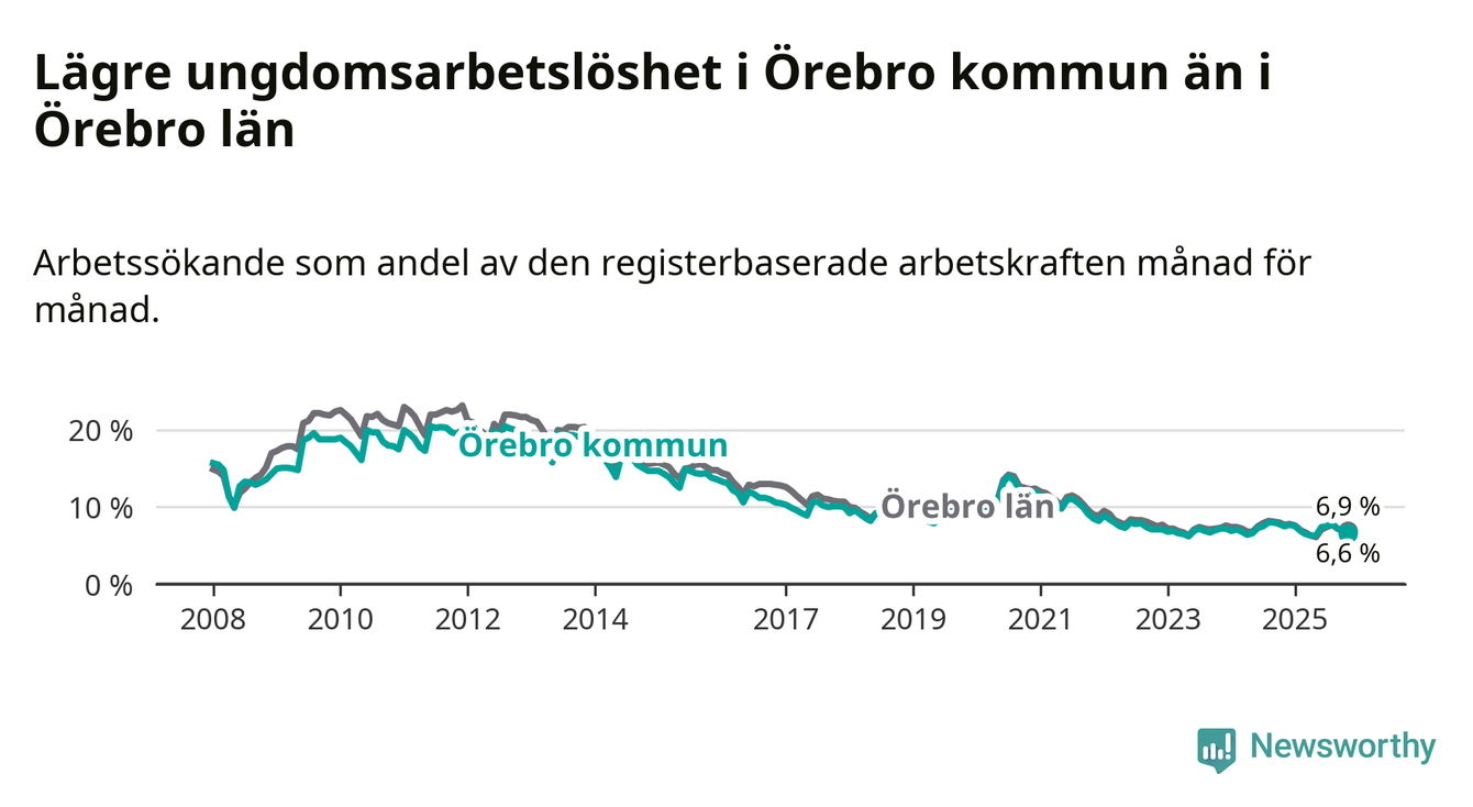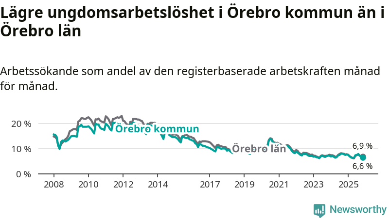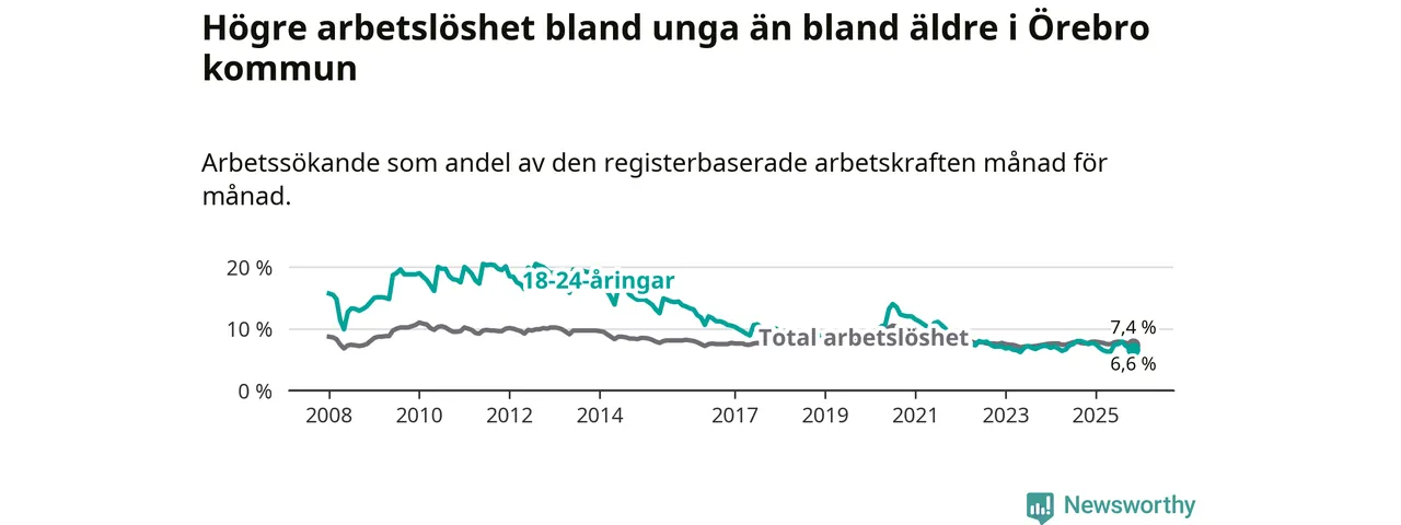 Medan Örebro har högre total arbetslöshet än Örebro, ligger ungdomsarbetslösheten 0,3 procentenheter lägre i Örebro.