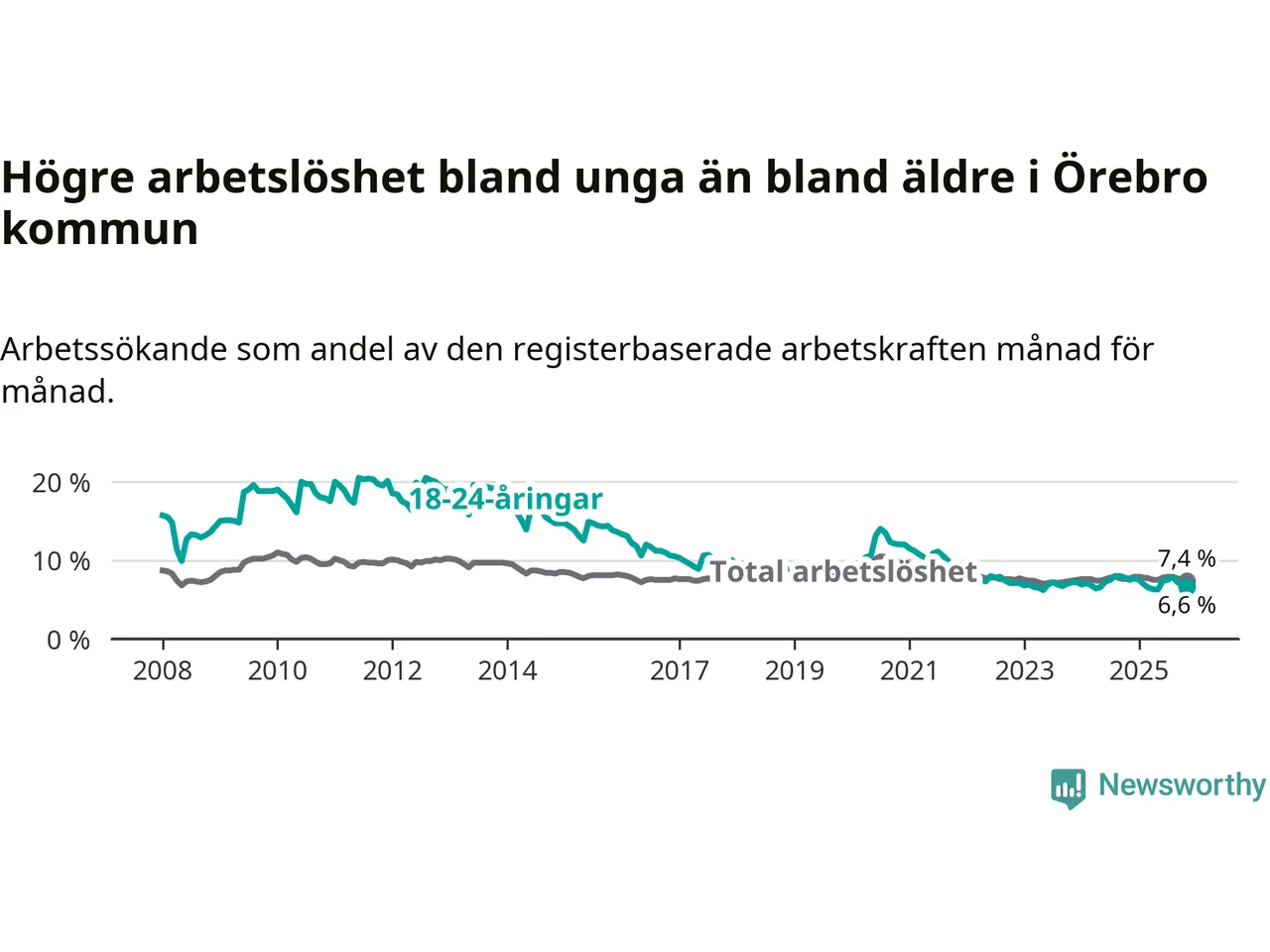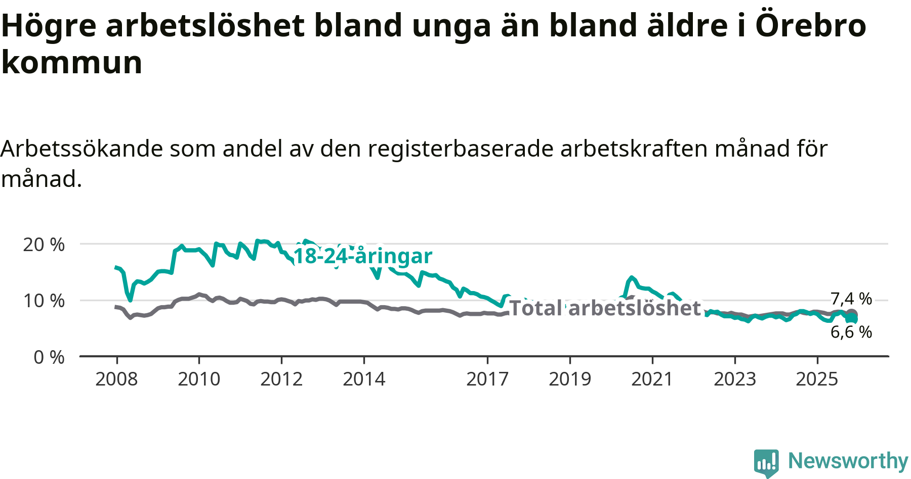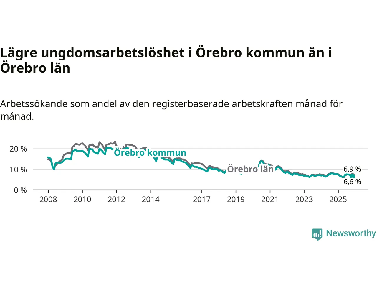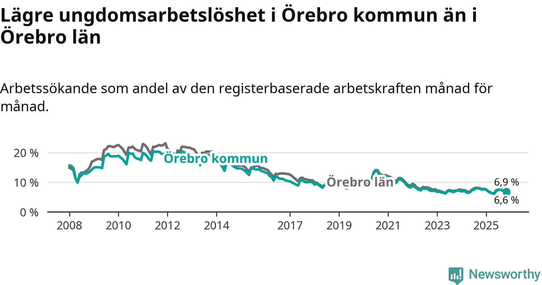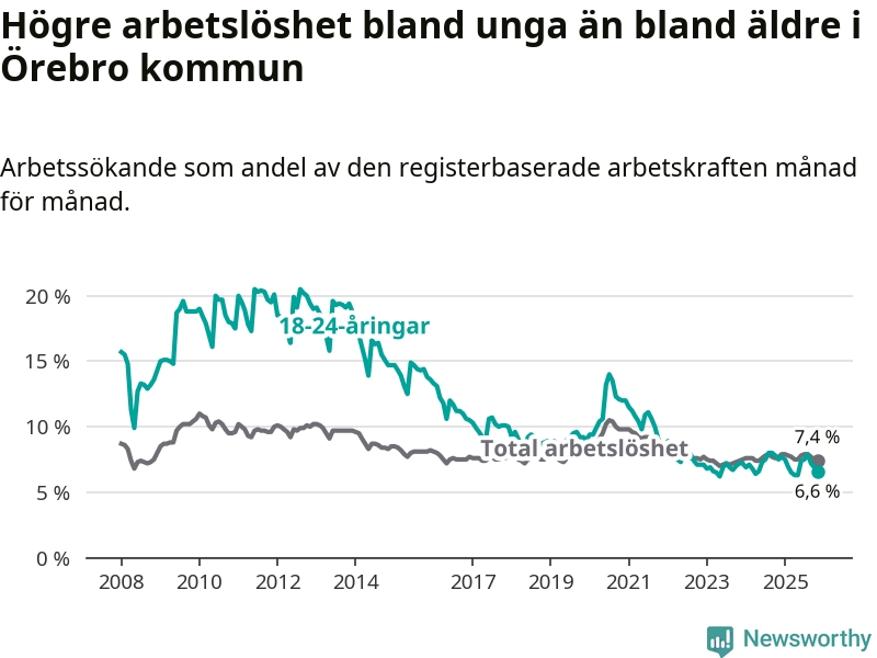 Medan Örebro har högre total arbetslöshet än Örebro, ligger ungdomsarbetslösheten 0,3 procentenheter lägre i Örebro.
