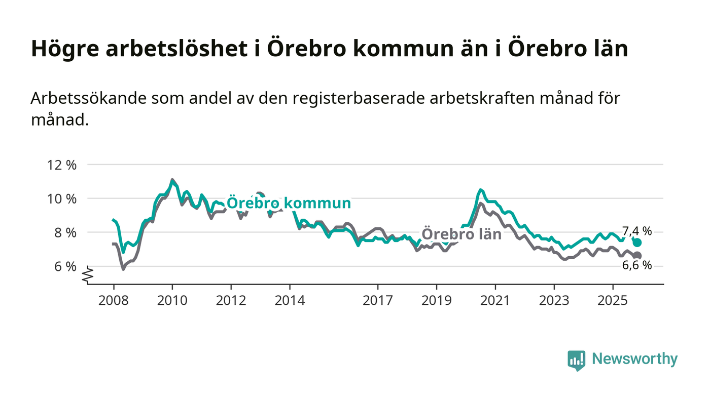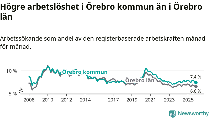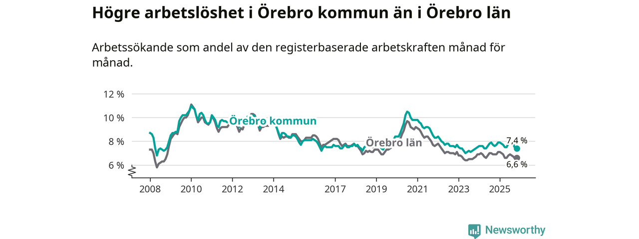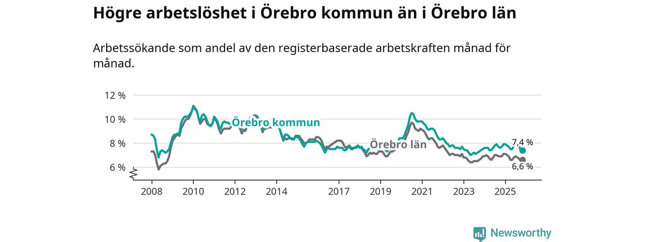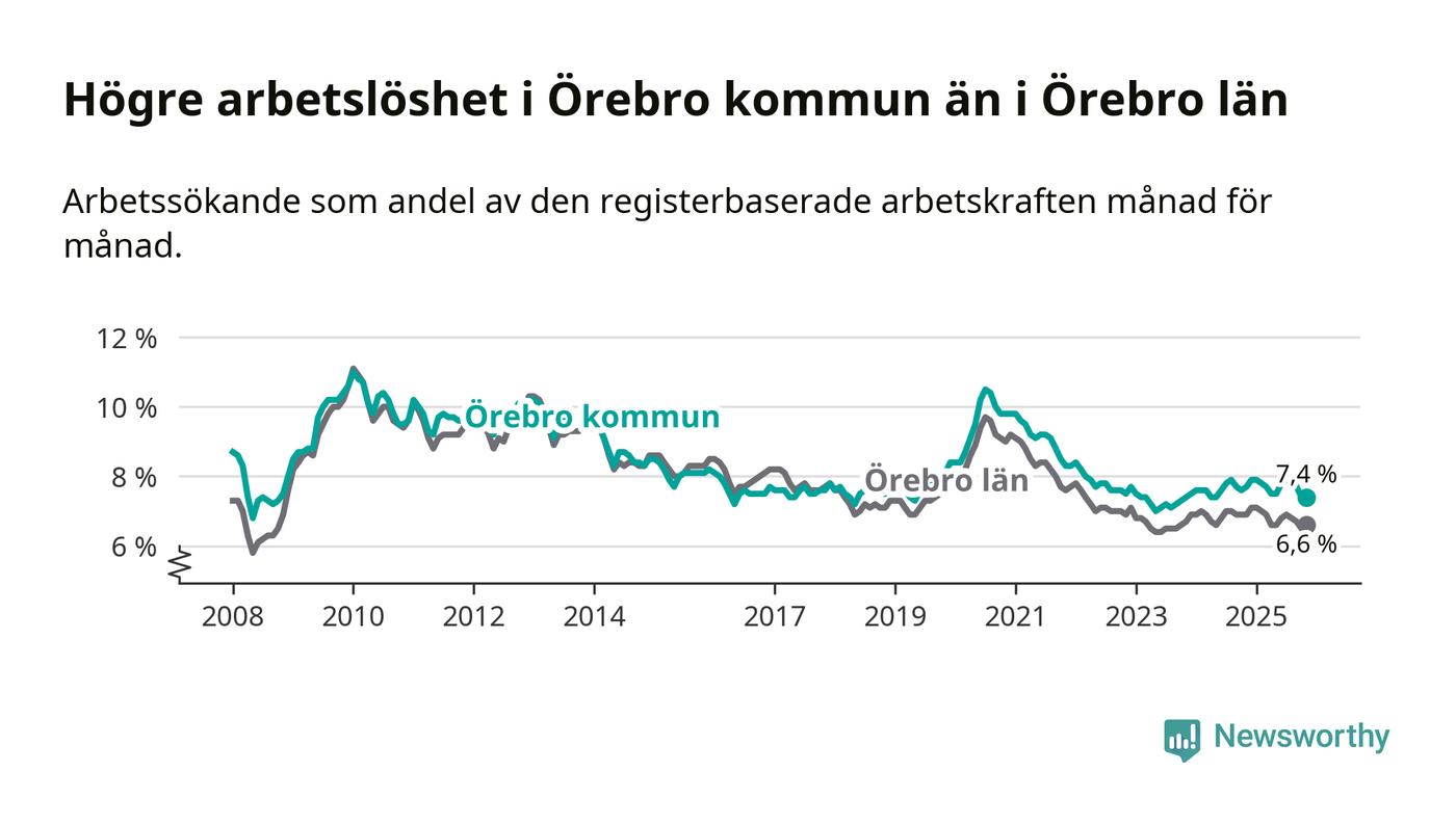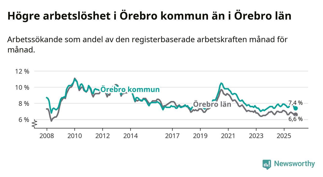 Även om arbetslösheten i Örebro alltså minskar, så ligger den fortfarande över snittet i hela Örebro län (7,4 procent i kommunen, jämfört med 6,6 procent i hela länet). Örebro har därmed även den högsta arbetslöshetsnivån i länet. Askersund har den lägsta (4,1 procent). För att Örebro skulle komma ner i samma arbetslöshetsnivå som Askersund skulle 2 708 personer behöva sysselsättas.
