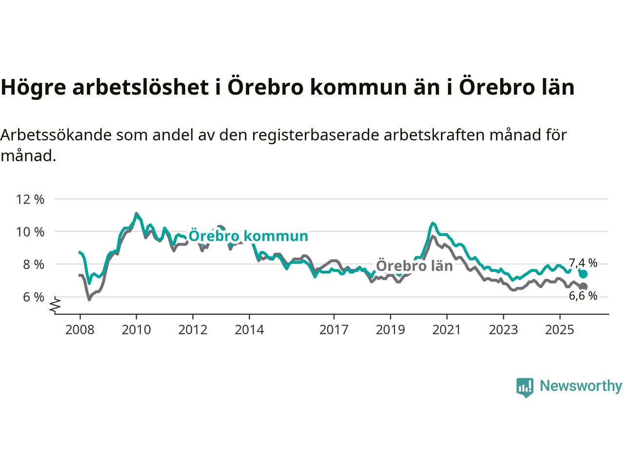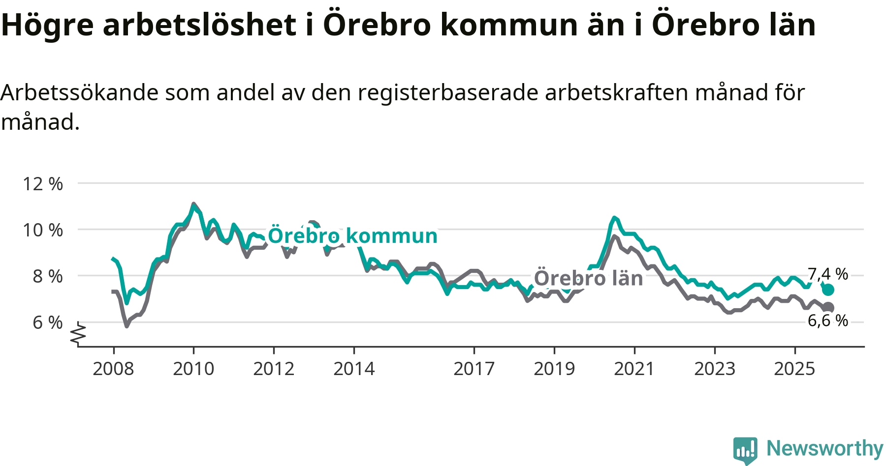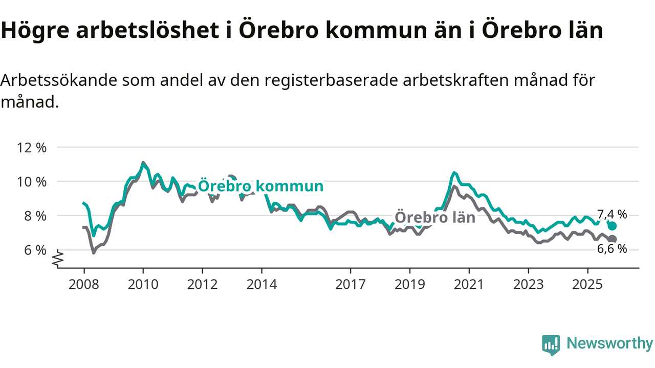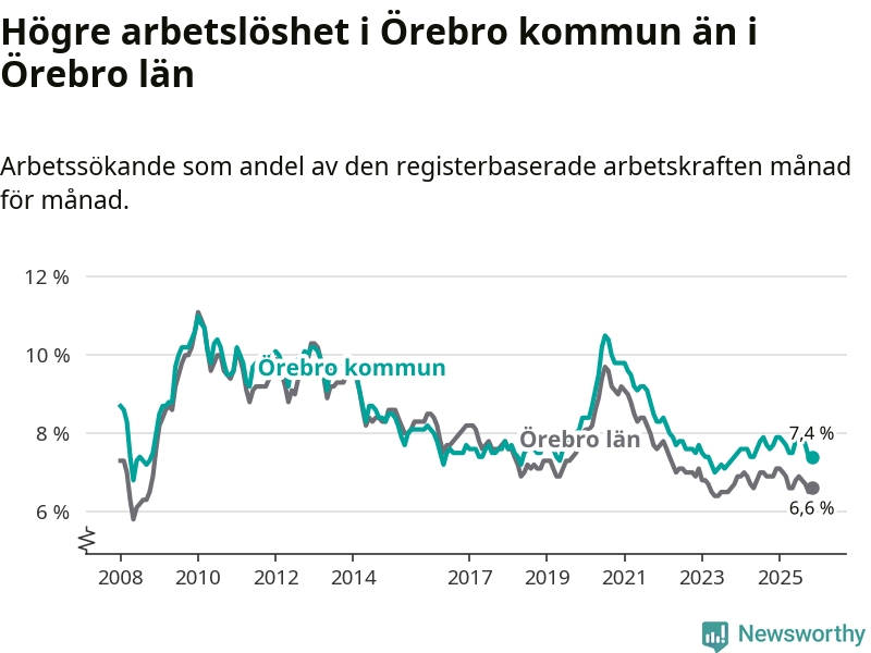 Även om arbetslösheten i Örebro alltså minskar, så ligger den fortfarande över snittet i hela Örebro län (7,4 procent i kommunen, jämfört med 6,6 procent i hela länet). Örebro har därmed även den högsta arbetslöshetsnivån i länet. Askersund har den lägsta (4,1 procent). För att Örebro skulle komma ner i samma arbetslöshetsnivå som Askersund skulle 2 708 personer behöva sysselsättas.
