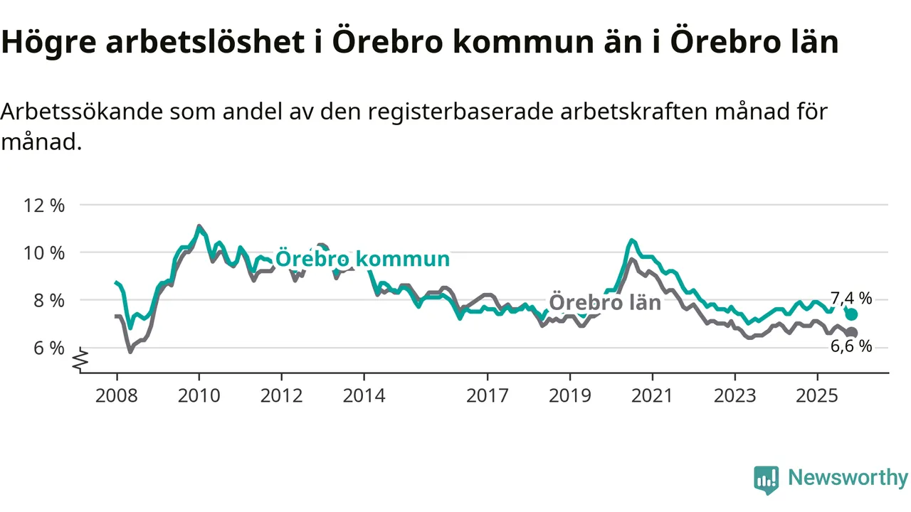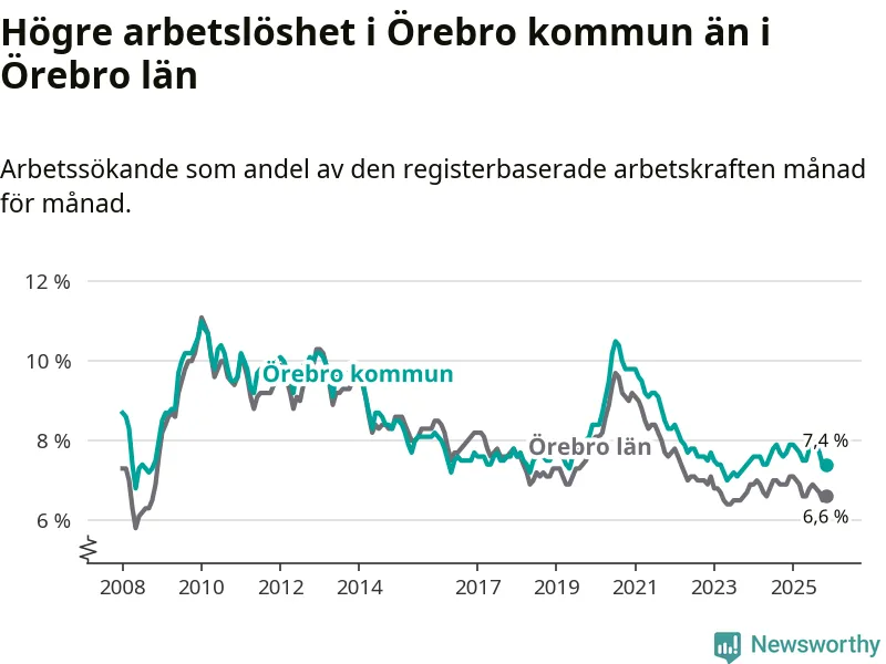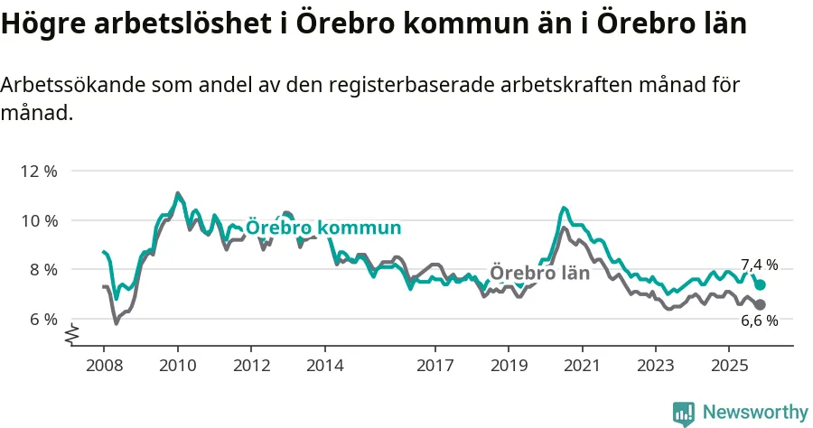 Under november månad rapporterade Örebro kommun en total arbetslöshet på 7,4 procent. Det är en minskning jämfört med samma tidpunkt i fjol (−0,3 procentenheter). Även i Örebro län sjunker arbetslösheten .