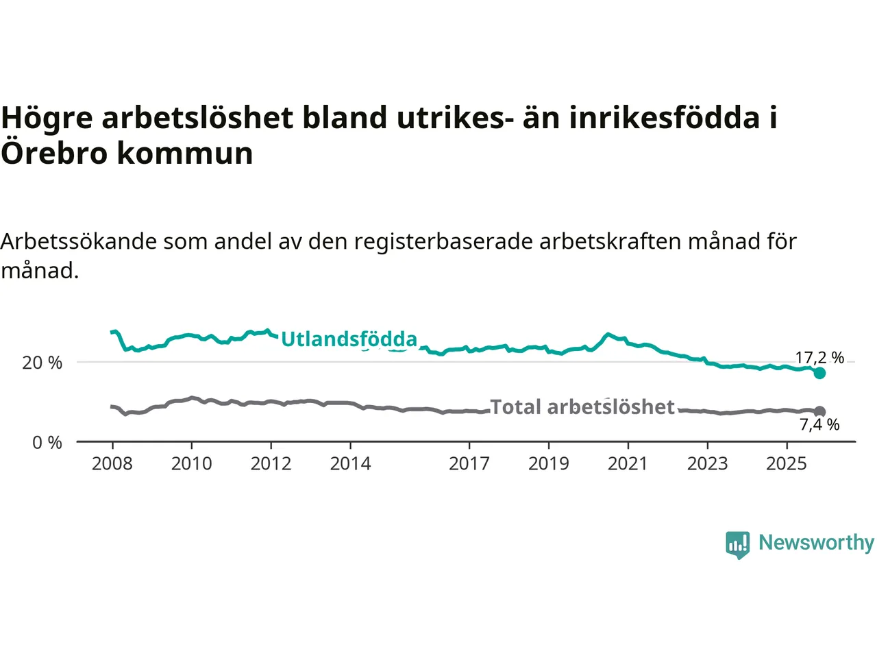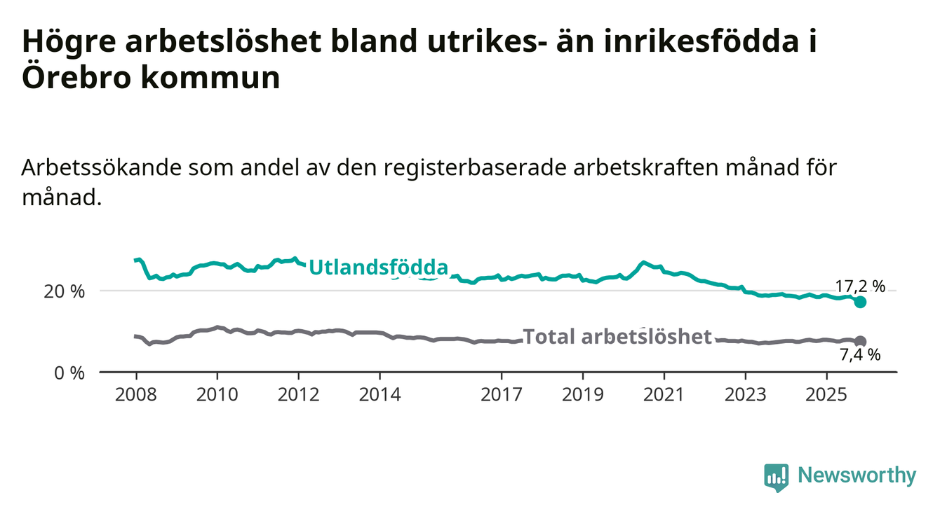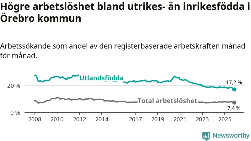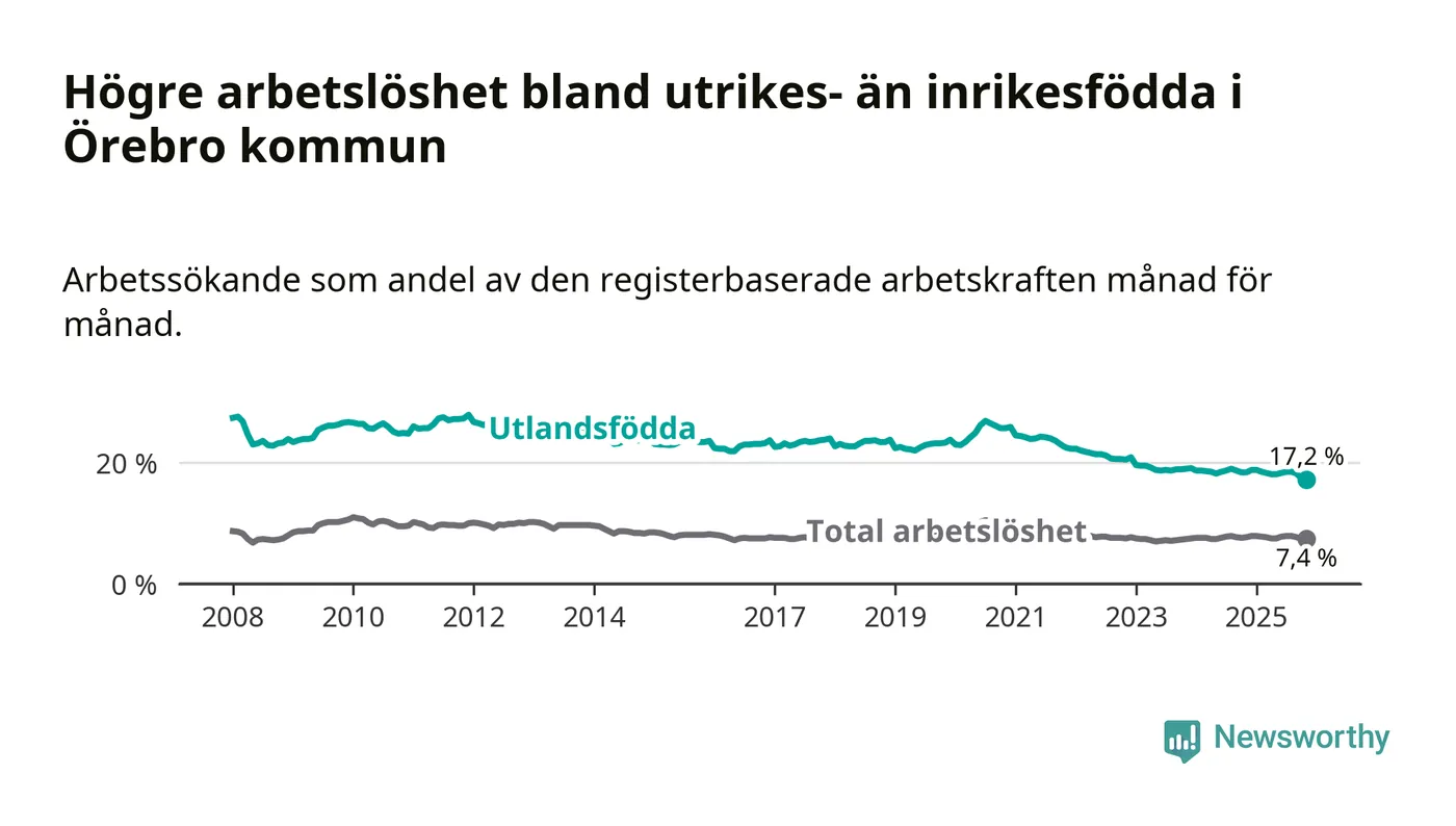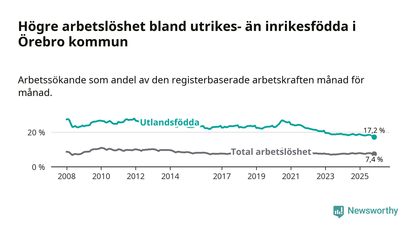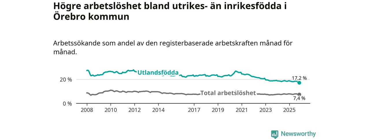 Skillnaden i arbetslöshet mellan utrikesfödda och hela befolkningen är 9,8 procentenheter i Örebro. Det är en mindre skillnad än för ett år sedan (−0,9 procentenheter).