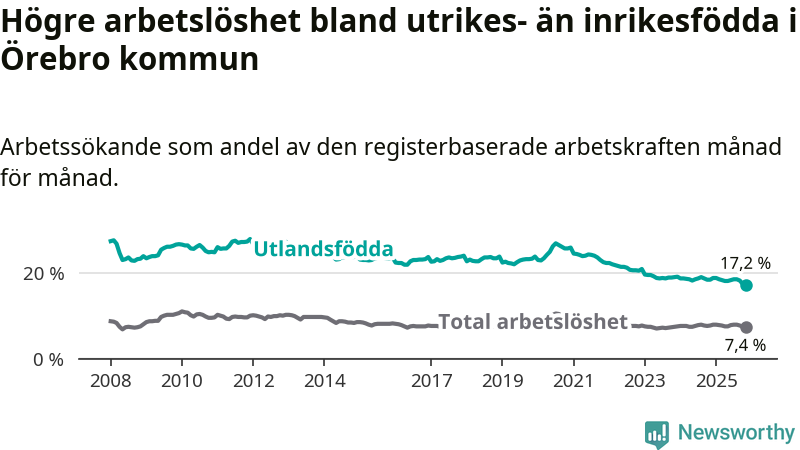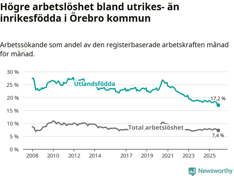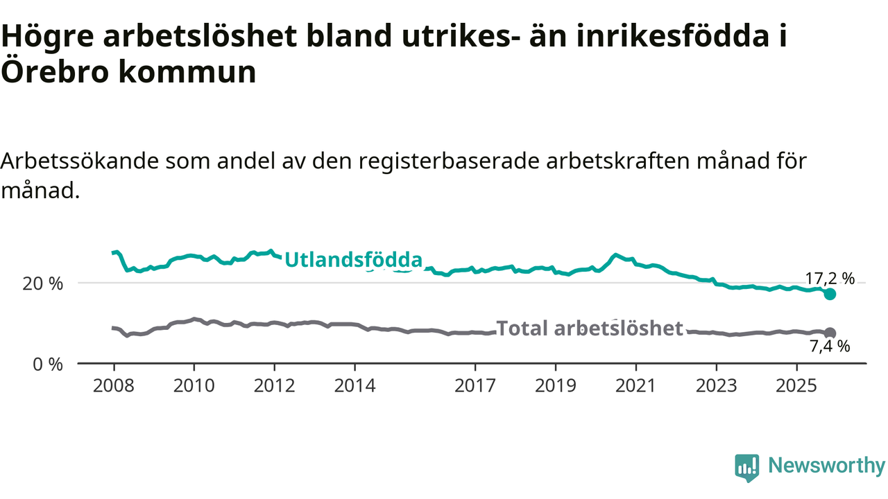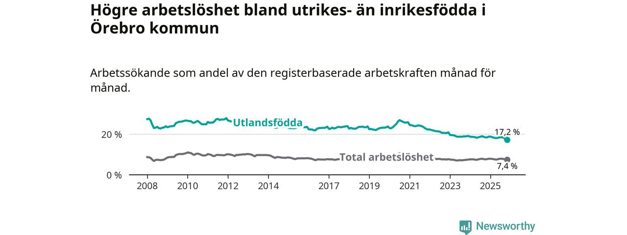 Arbetslösheten bland utlandsfödda var 17,2 procent i Örebro under november månad, motsvarande 3 445 av 20 029 personer. Det är 1,2 procentenheter färre än vid samma tidpunkt i fjol (−193 om man räknar personer). Därmed är de utlandsföddas arbetslöshet lägre än vid samma tidpunkt i fjol för tionde månaden i följd. Sedan januari har arbetslösheten bland utlandsfödda minskat från 18,8 till 17,2 procent. Den nuvarande arbetslöshetsnivån är den lägsta sedan januari 2008.