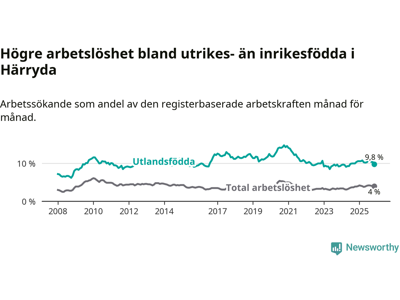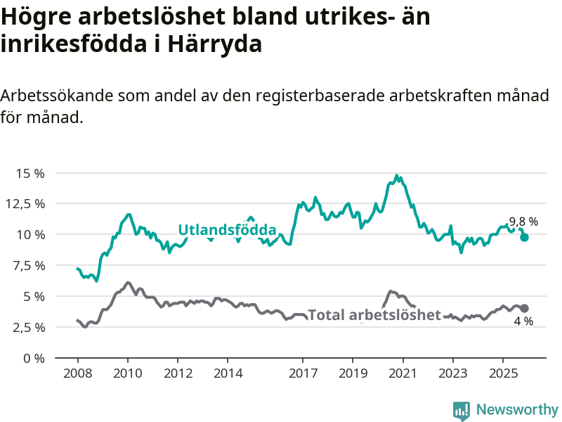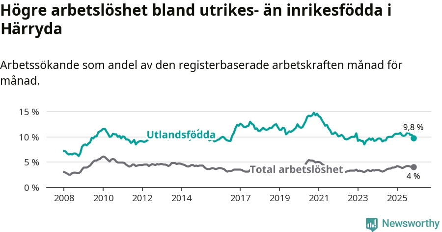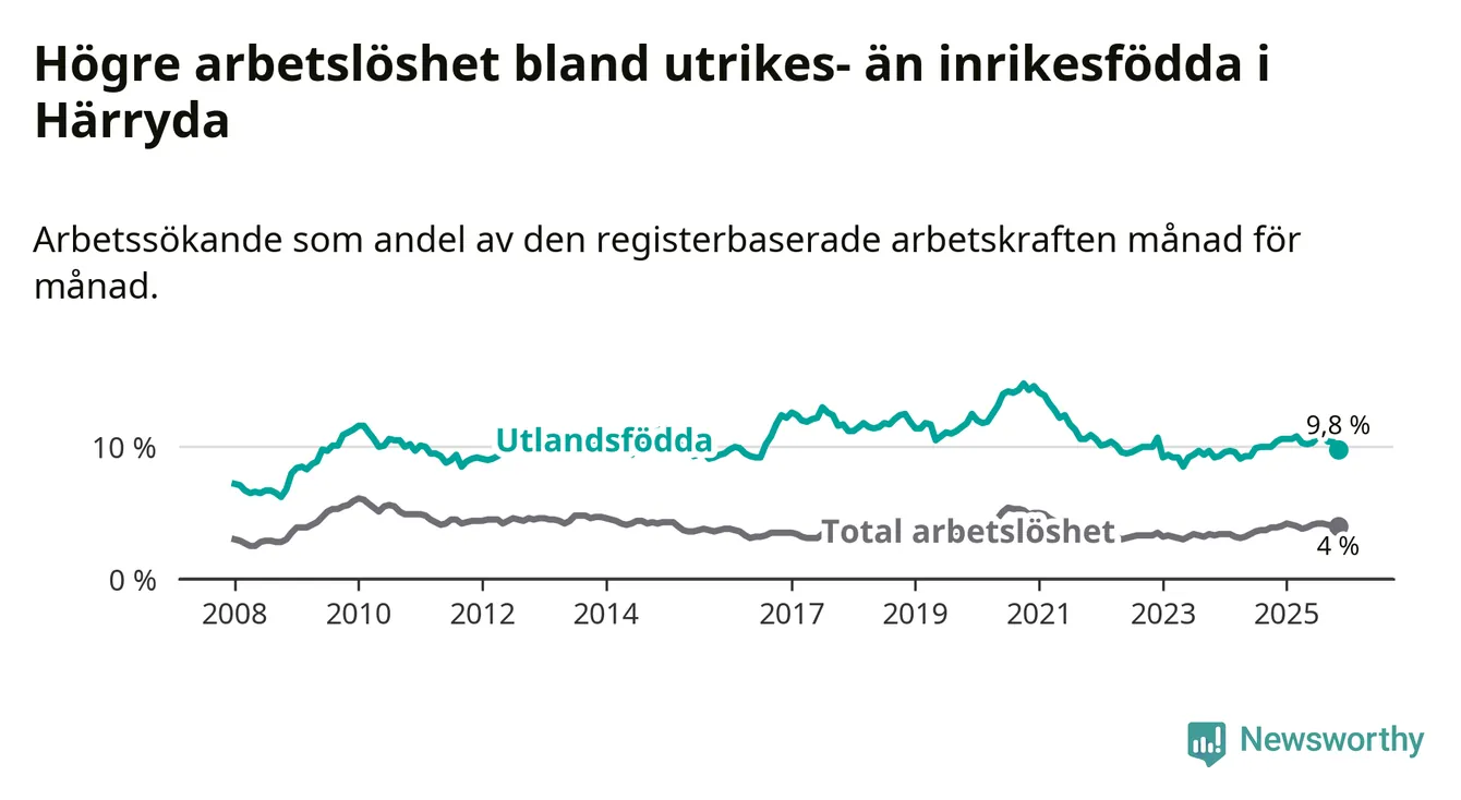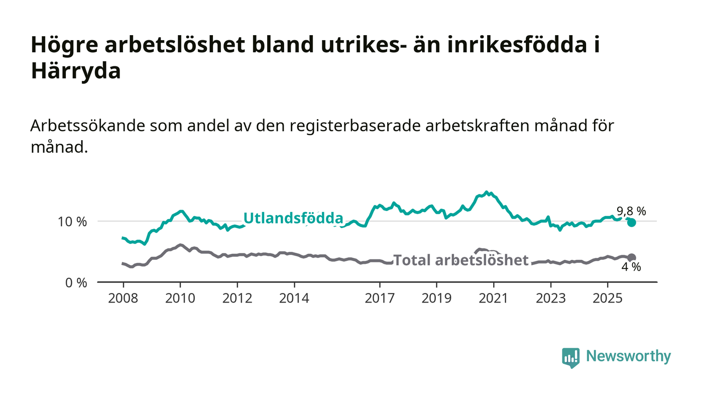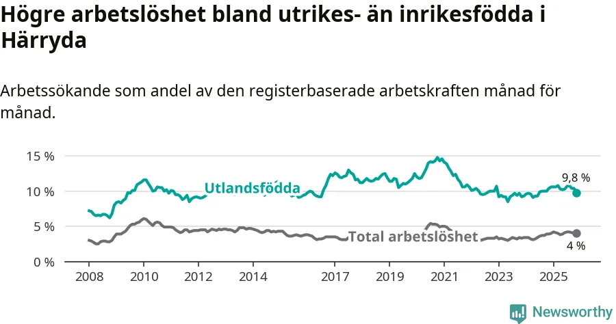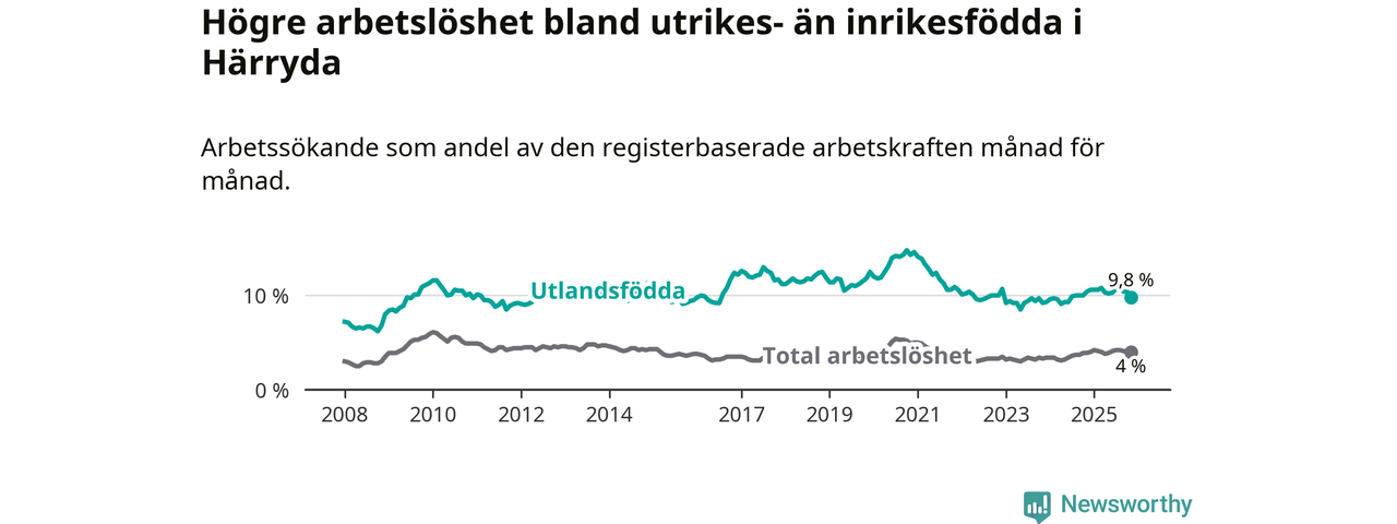 Arbetslösheten bland utlandsfödda var 9,8 procent i Härryda under november månad, motsvarande 323 av 3 296 personer. Det är 0,6 procentenheter färre än vid samma tidpunkt i fjol (−16 om man räknar personer). Den senaste månadens nedgång innebär ett trendbrott. Under de 18 föregående månaderna hade arbetslösheten bland utlandsfödda varit högre än motsvarande tidpunkt året innan.