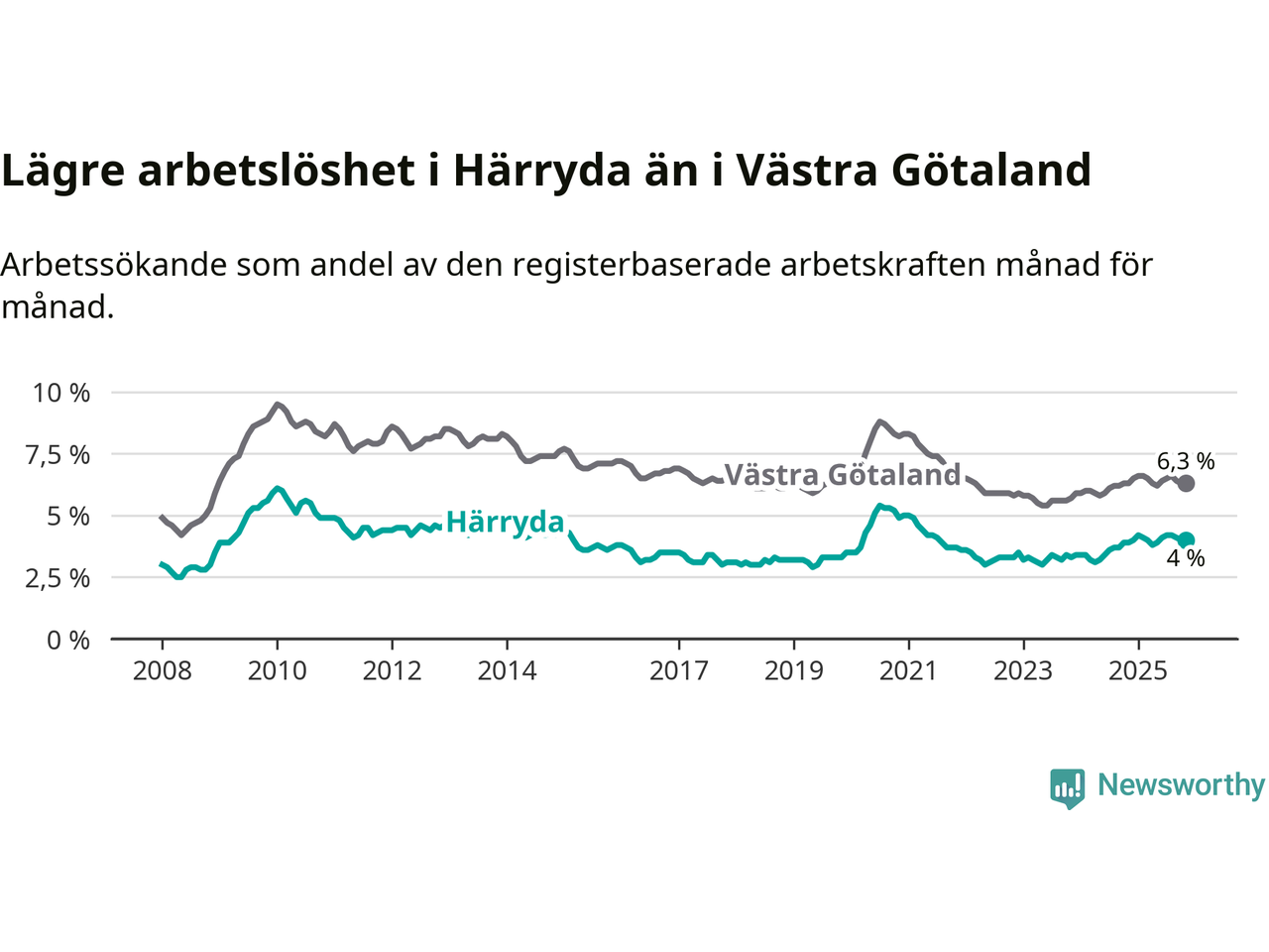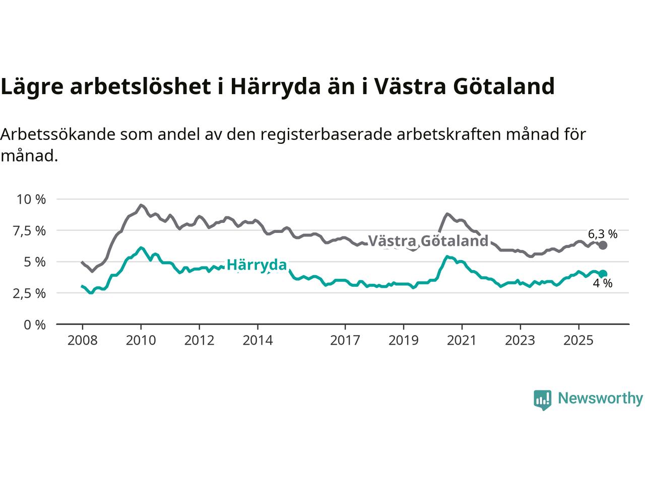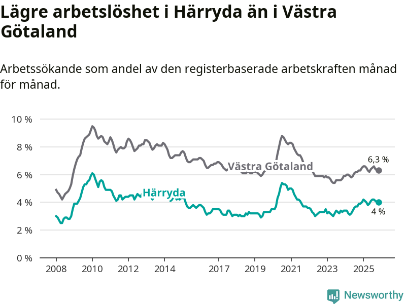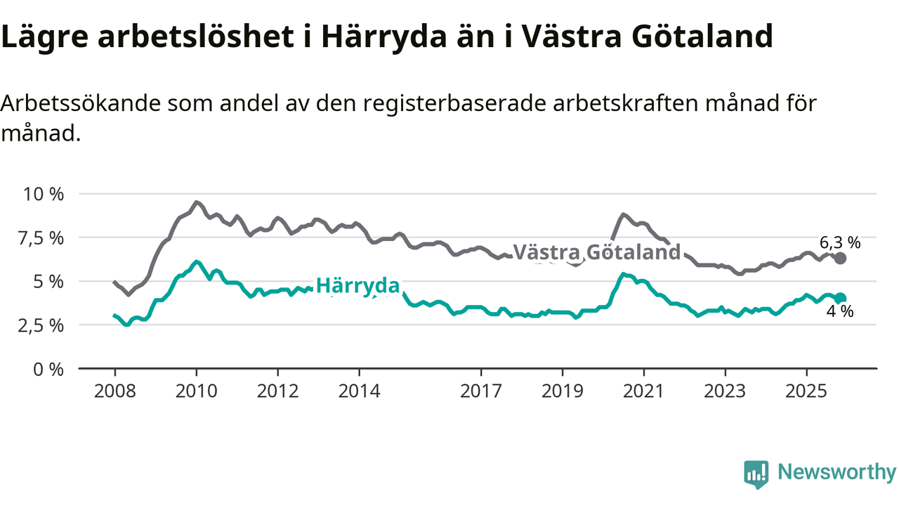 Graf: Arbetslöshet i Härryda kommun och Västra Götalands län