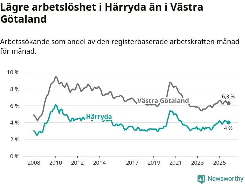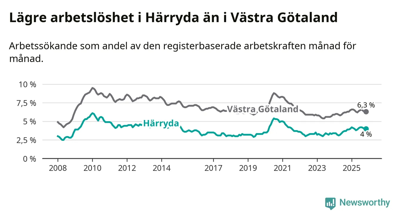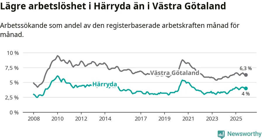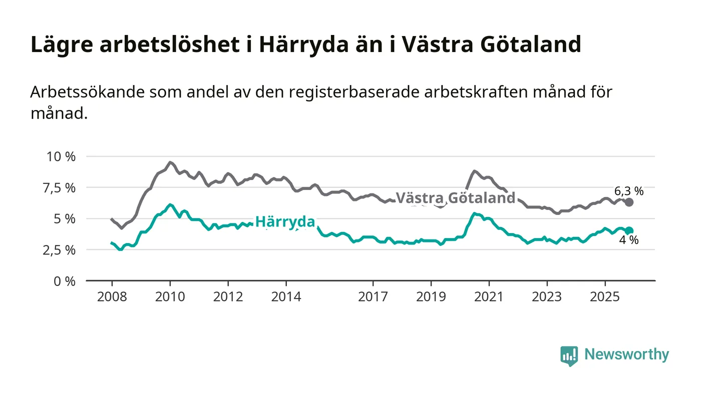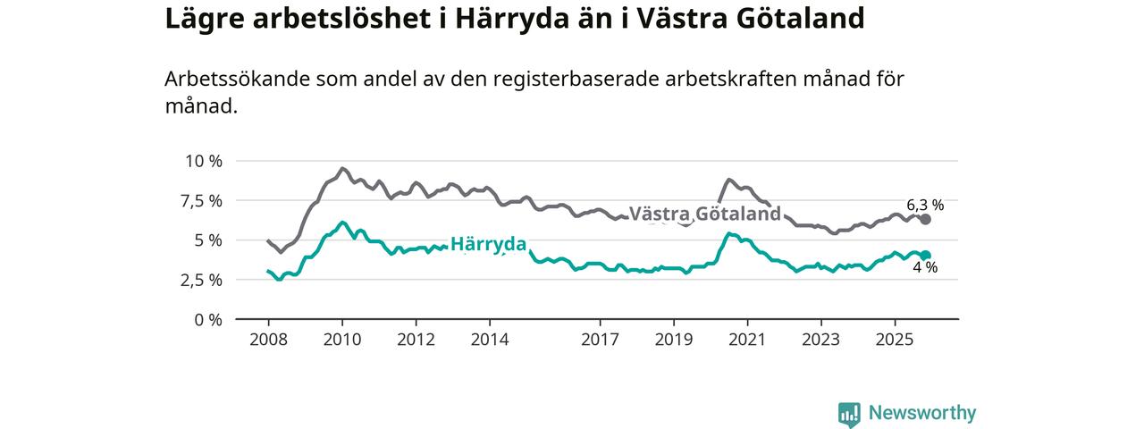 Även om arbetslösheten i Härryda alltså ökar, så ligger den fortfarande under snittet i hela Västra Götalands län (4,0 procent i kommunen, jämfört med 6,3 procent i hela länet). Öckerö har den lägsta arbetslösheten i länet (2,9 procent), medan Gullspång har den högsta (8,6 procent). För att Härryda skulle komma ner i samma arbetslöshetsnivå som Öckerö skulle 228 personer behöva sysselsättas.