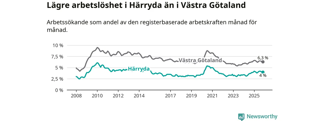 Under november månad rapporterade Härryda kommun en total arbetslöshet på 4,0 procent. Det är en ökning jämfört med samma tidpunkt i fjol (+0,1 procentenheter). I Västra Götalands län däremot står arbetslösheten stilla.