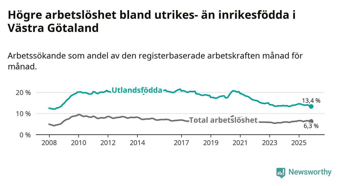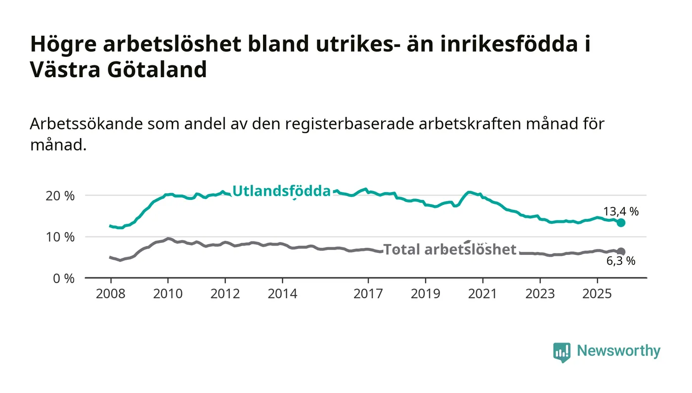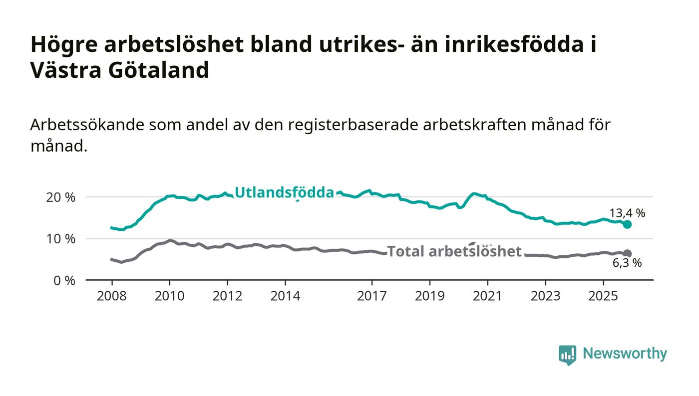 Arbetslösheten bland utlandsfödda var 13,4 procent i Västra Götaland under november månad, motsvarande 29 762 av 222 104 personer. Det är 0,8 procentenheter färre än vid samma tidpunkt i fjol (−1 225 om man räknar personer).