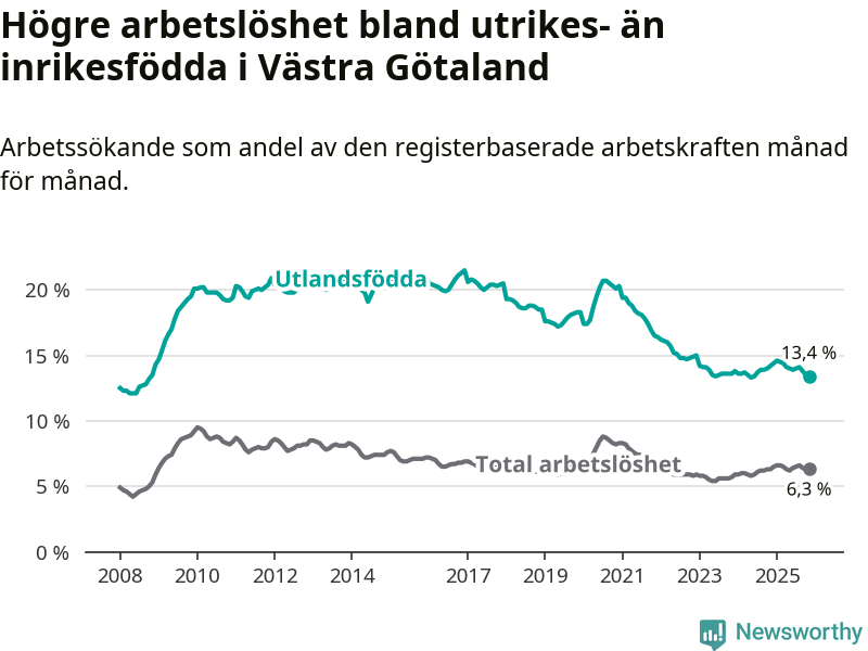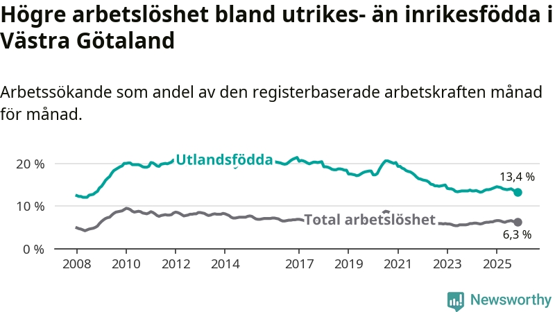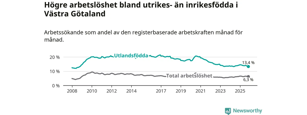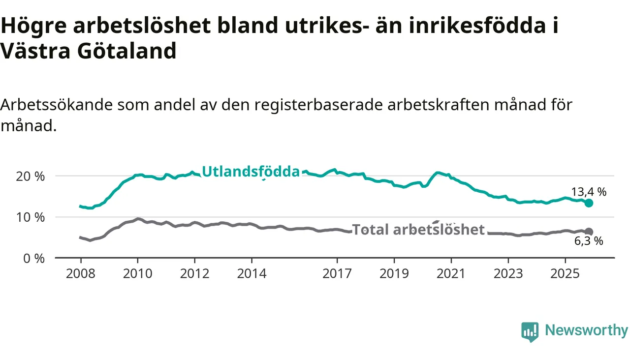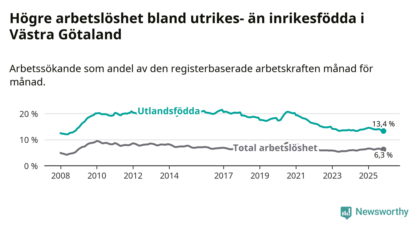 Arbetslösheten bland utlandsfödda var 13,4 procent i Västra Götaland under november månad, motsvarande 29 762 av 222 104 personer. Det är 0,8 procentenheter färre än vid samma tidpunkt i fjol (−1 225 om man räknar personer).