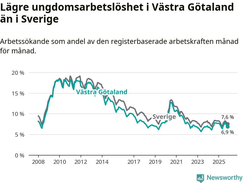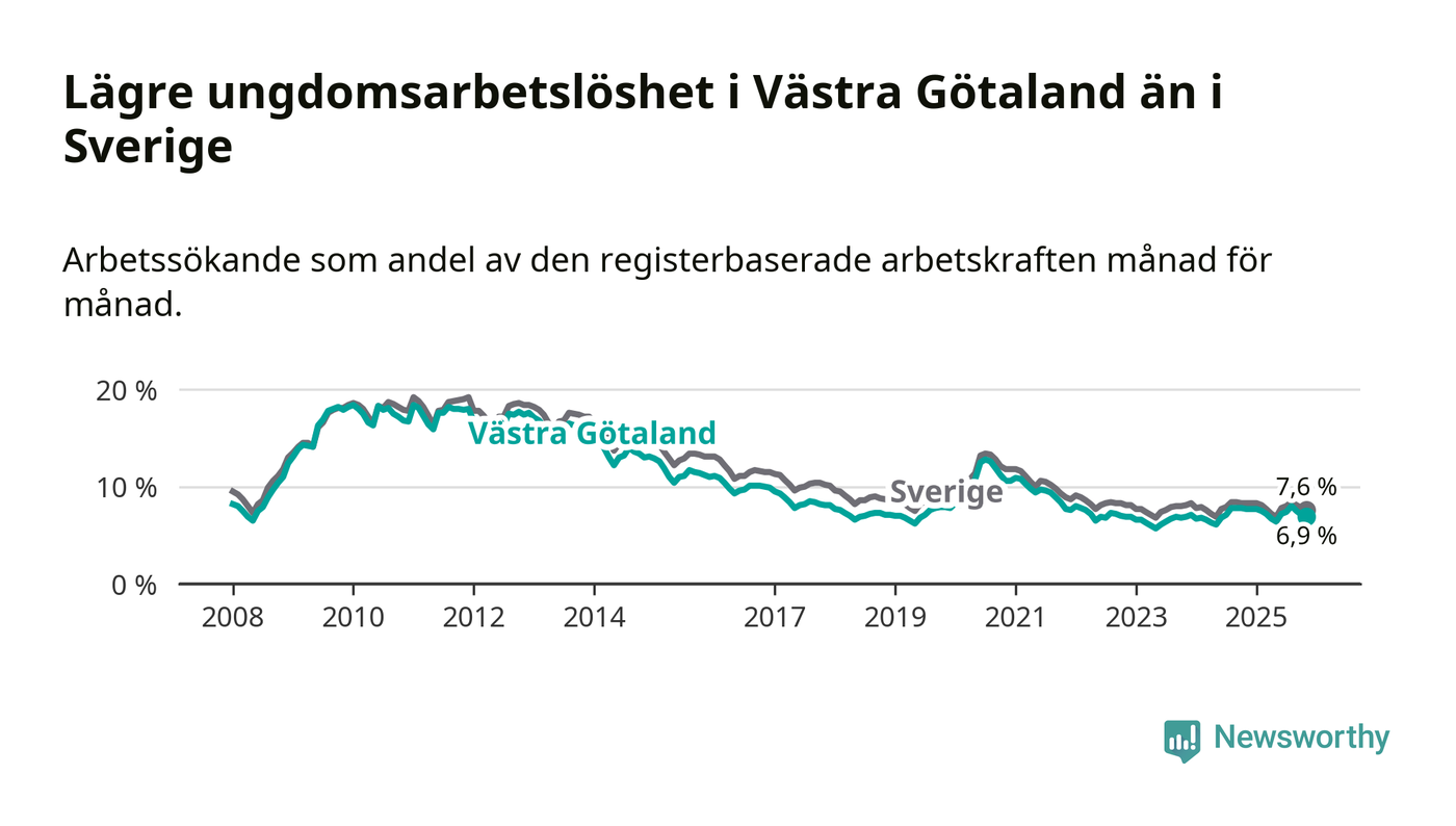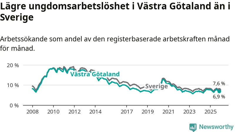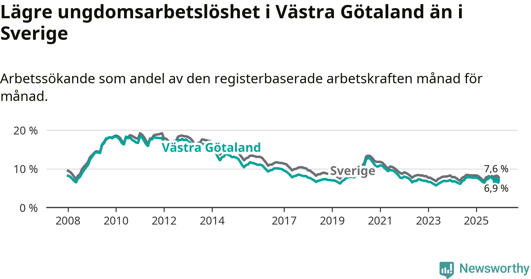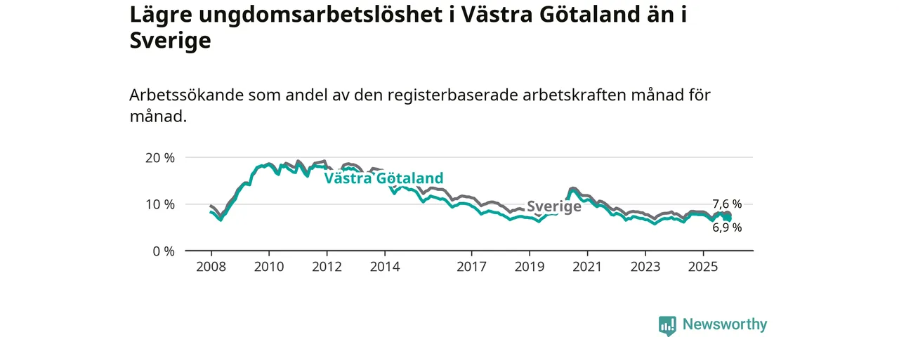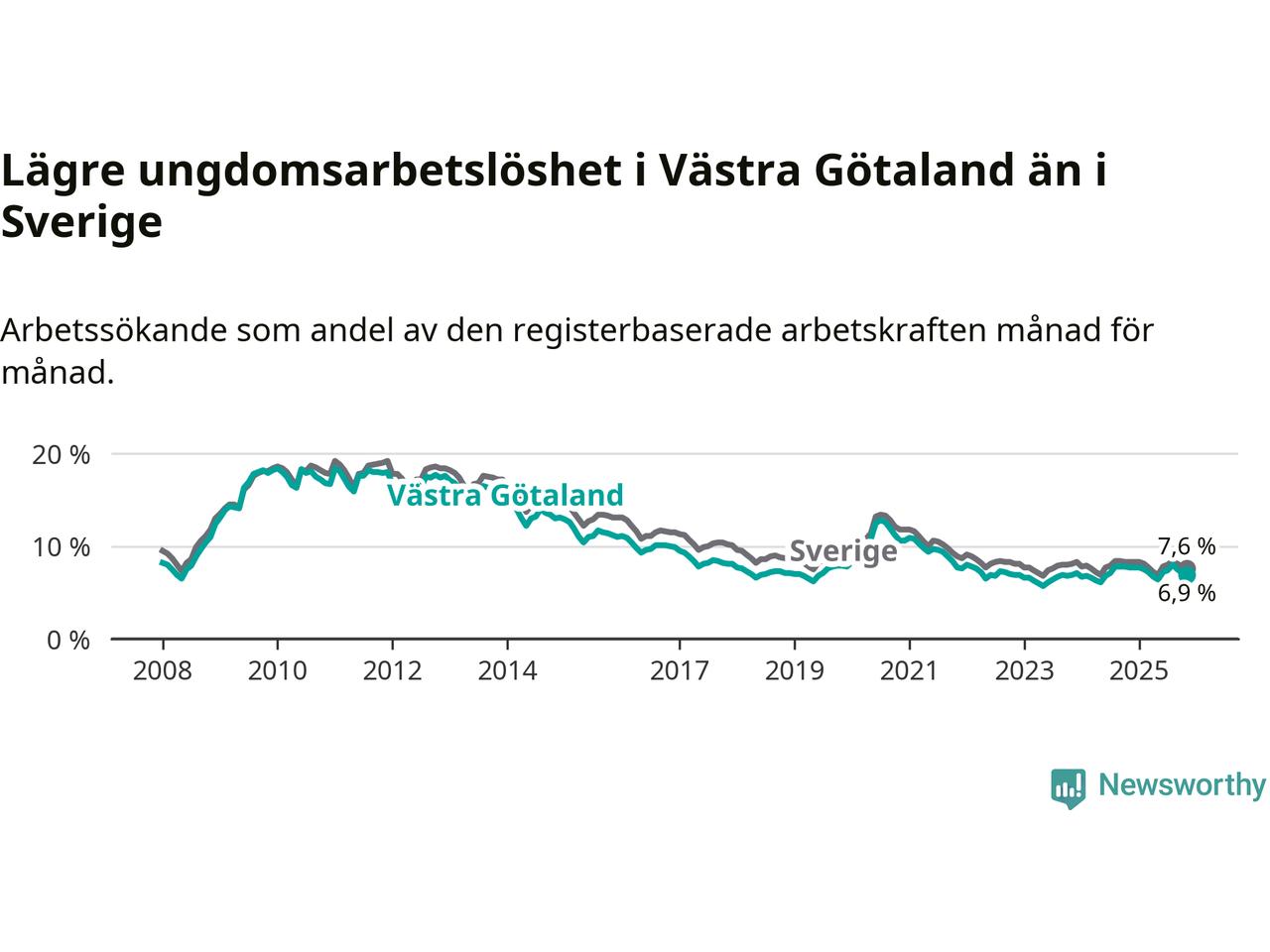 Precis som den totala arbetslösheten ligger ungdomsarbetslösheten i Västra Götaland lägre än i Sverige som helhet. Skillnaden mellan länet och riket är 0,7 procentenheter.