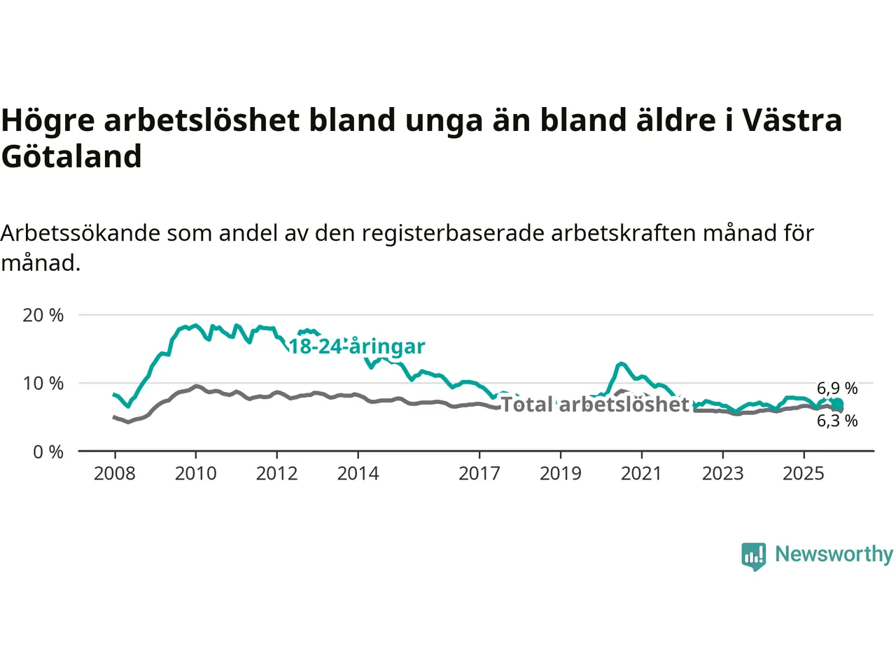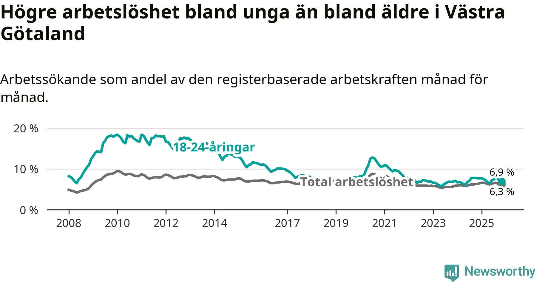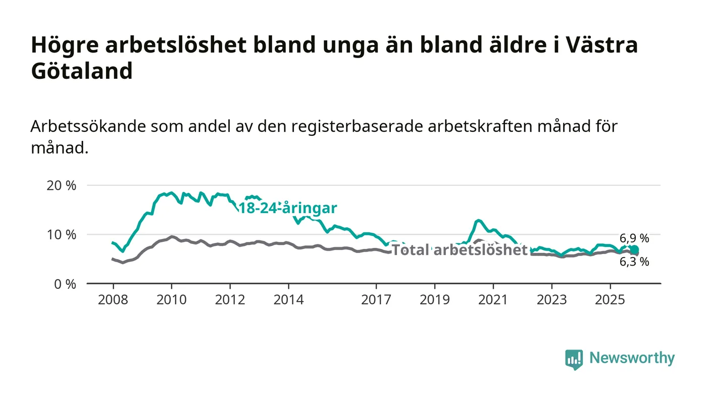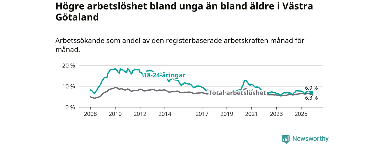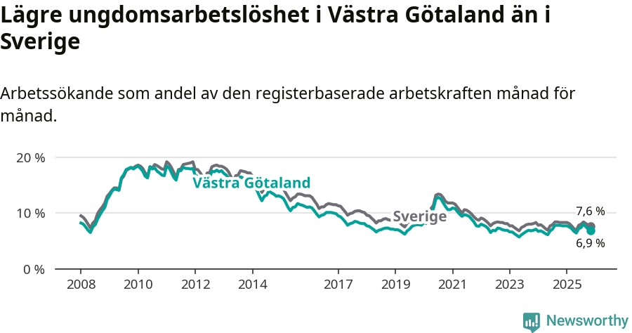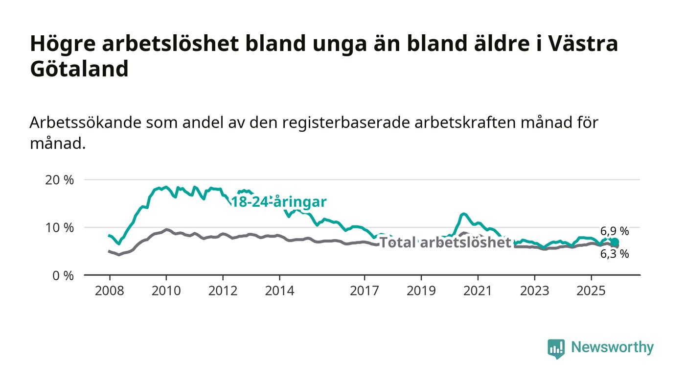 Precis som den totala arbetslösheten ligger ungdomsarbetslösheten i Västra Götaland lägre än i Sverige som helhet. Skillnaden mellan länet och riket är 0,7 procentenheter.