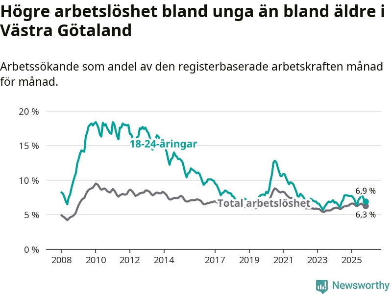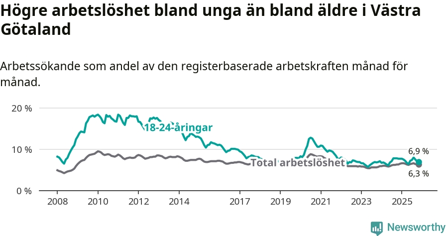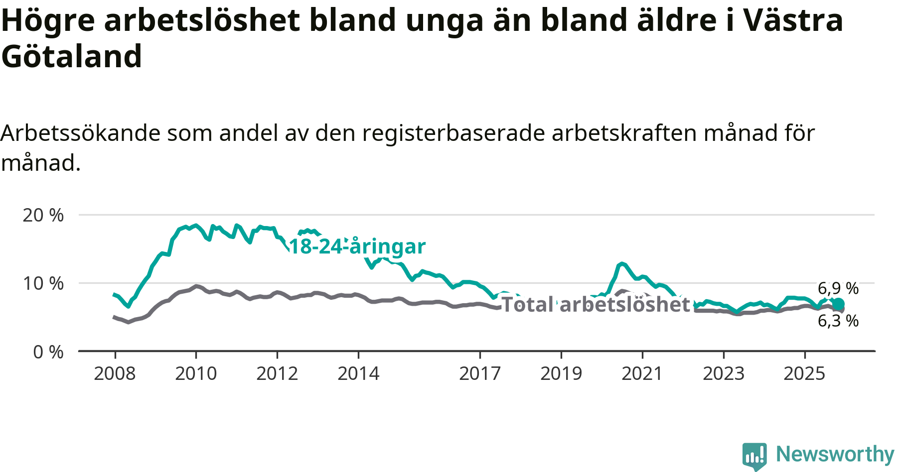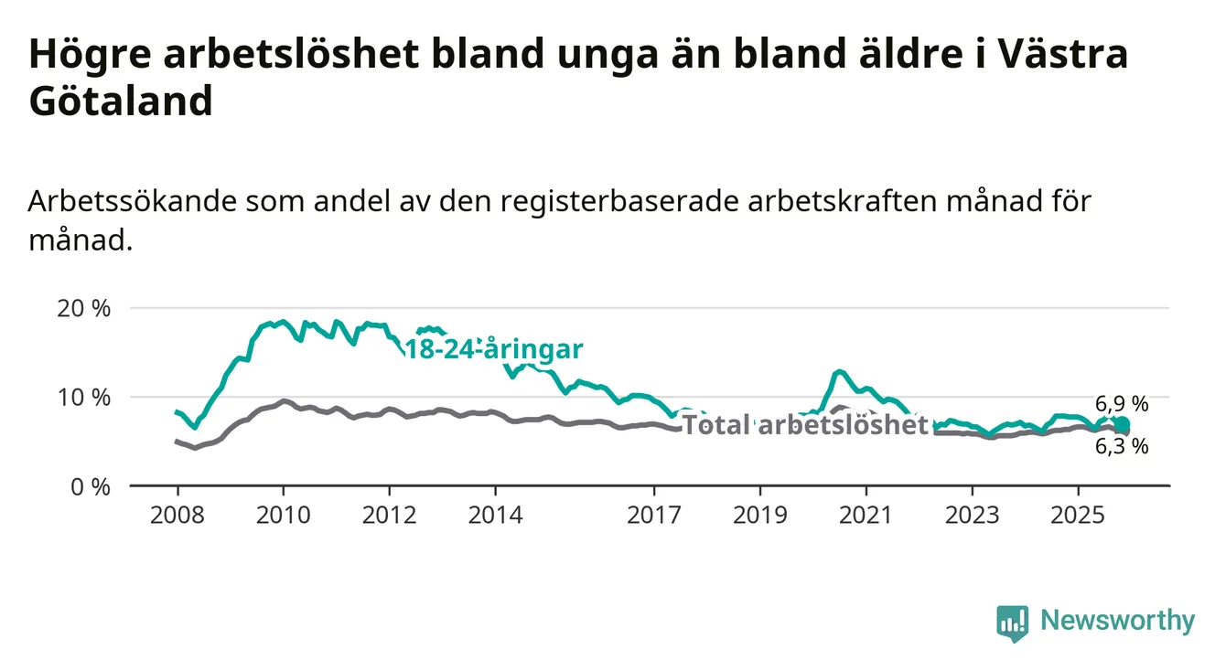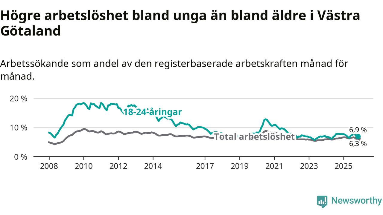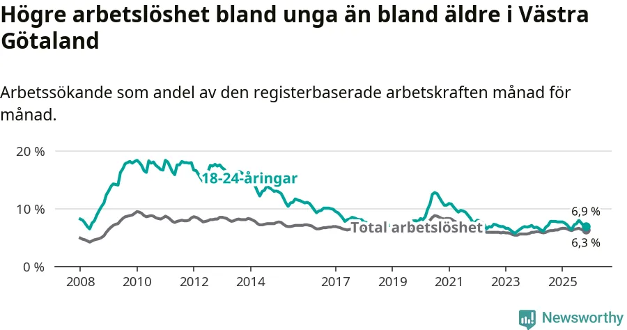 Precis som den totala arbetslösheten ligger ungdomsarbetslösheten i Västra Götaland lägre än i Sverige som helhet. Skillnaden mellan länet och riket är 0,7 procentenheter.