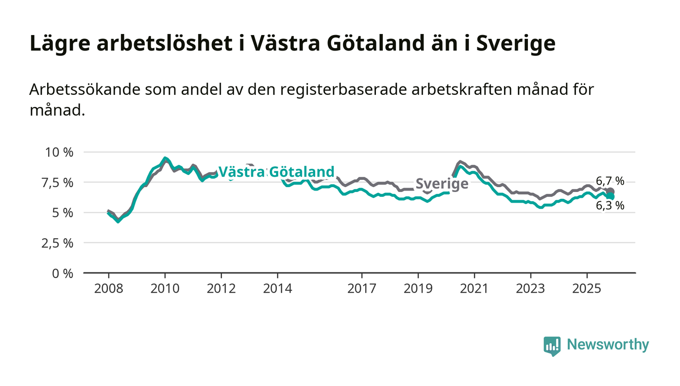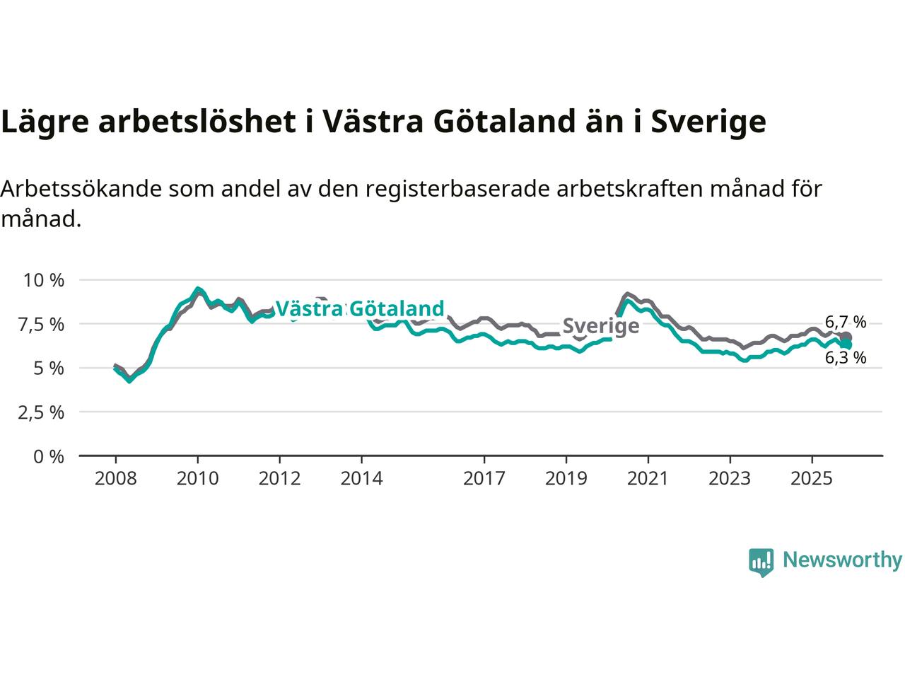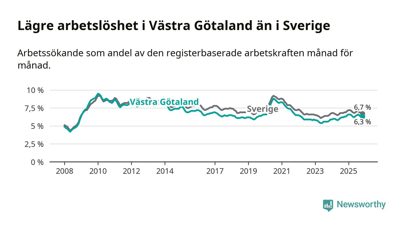 Arbetslösheten i Västra Götaland ligger under nivån i hela Sverige (6,3 procent i länet, jämfört med 6,7 procent i hela riket). Norrbotten har den lägsta arbetslösheten i riket (3,8 procent), medan Skåne har den högsta (8,8 procent). För att Västra Götaland skulle komma ner i samma arbetslöshetsnivå som Norrbotten skulle 22 318 personer behöva sysselsättas.