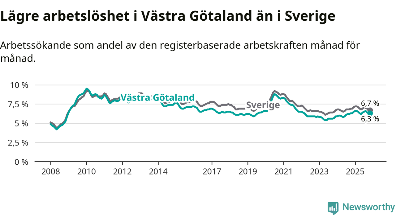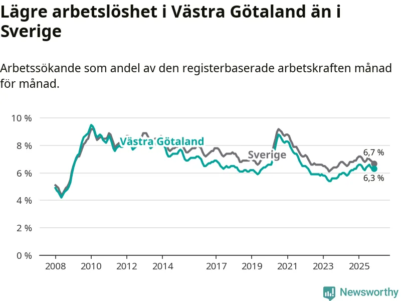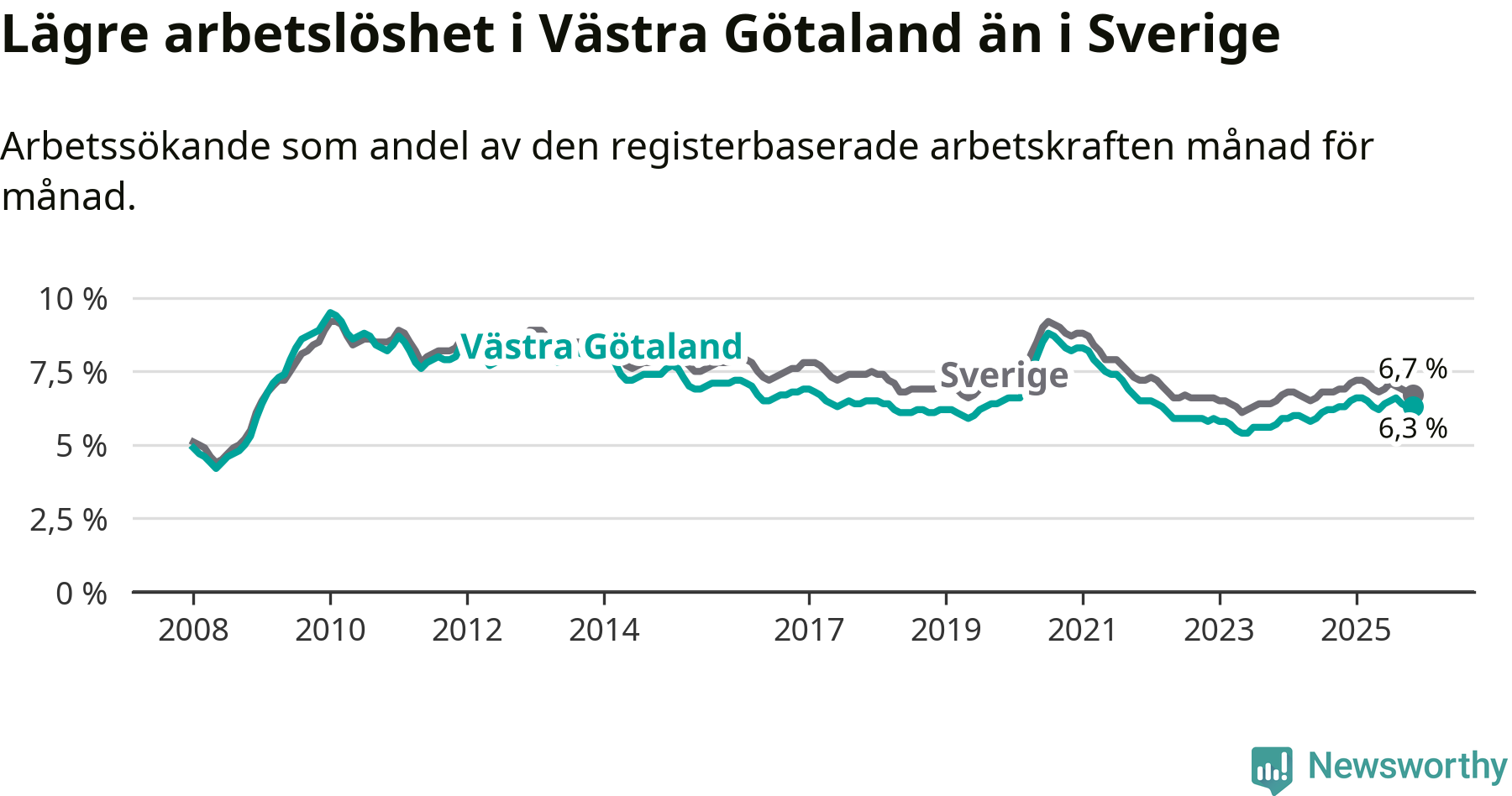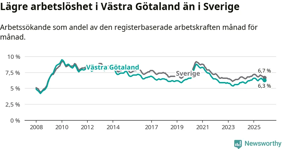 Arbetslösheten i Västra Götaland ligger under nivån i hela Sverige (6,3 procent i länet, jämfört med 6,7 procent i hela riket). Norrbotten har den lägsta arbetslösheten i riket (3,8 procent), medan Skåne har den högsta (8,8 procent). För att Västra Götaland skulle komma ner i samma arbetslöshetsnivå som Norrbotten skulle 22 318 personer behöva sysselsättas.