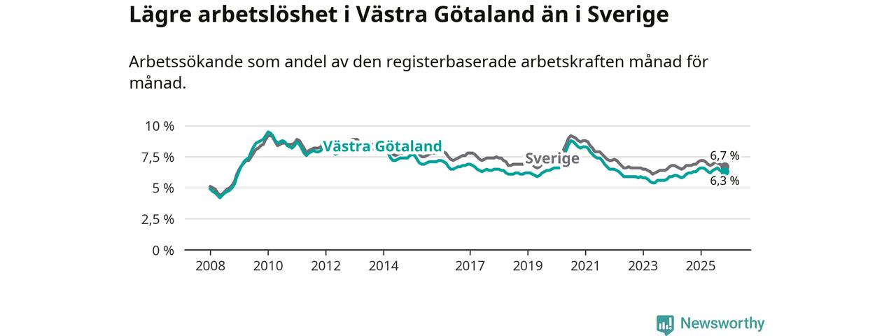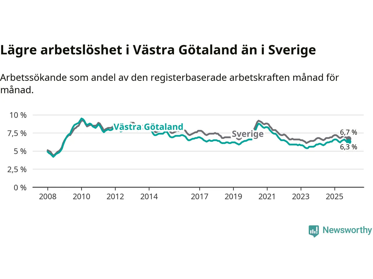 Västra Götaland går därmed mot strömmen i förhållande till andra län i Sverige. I de flesta andra län i riket går arbetslösheten nedåt. Störst är minskningen i Gävleborg, där arbetslösheten sjunker med 0,7 procentenheter.