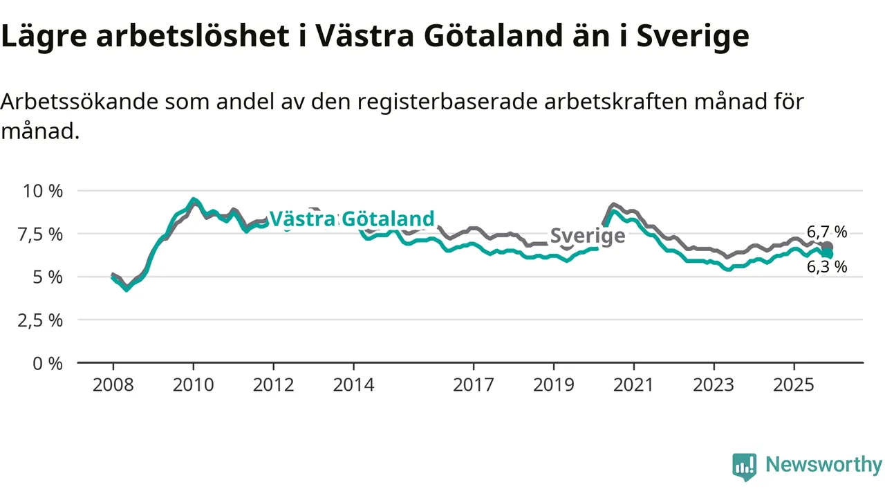 Under november månad rapporterade Västra Götalands län en total arbetslöshet på 6,3 procent. Det är i samma nivå som i november i fjol. I Sverige däremot sjunker arbetslösheten