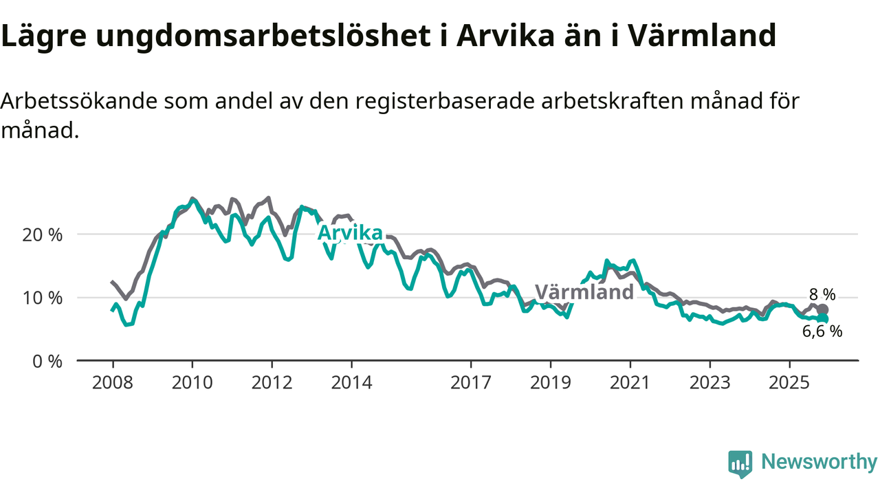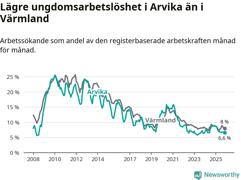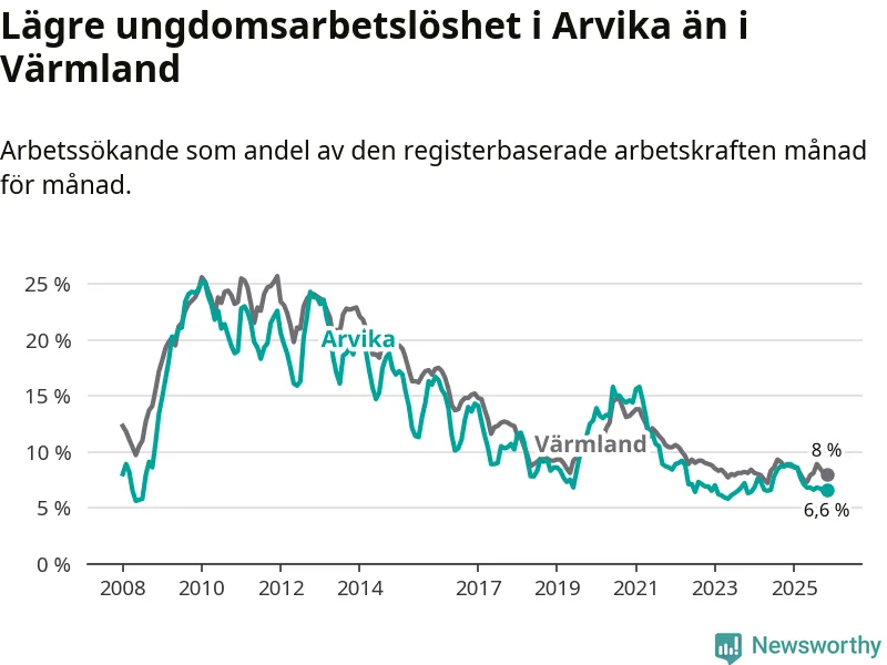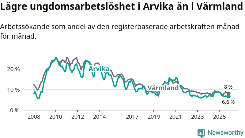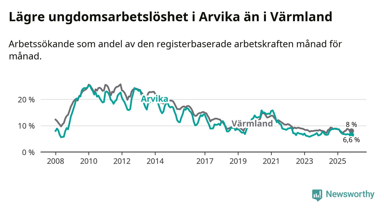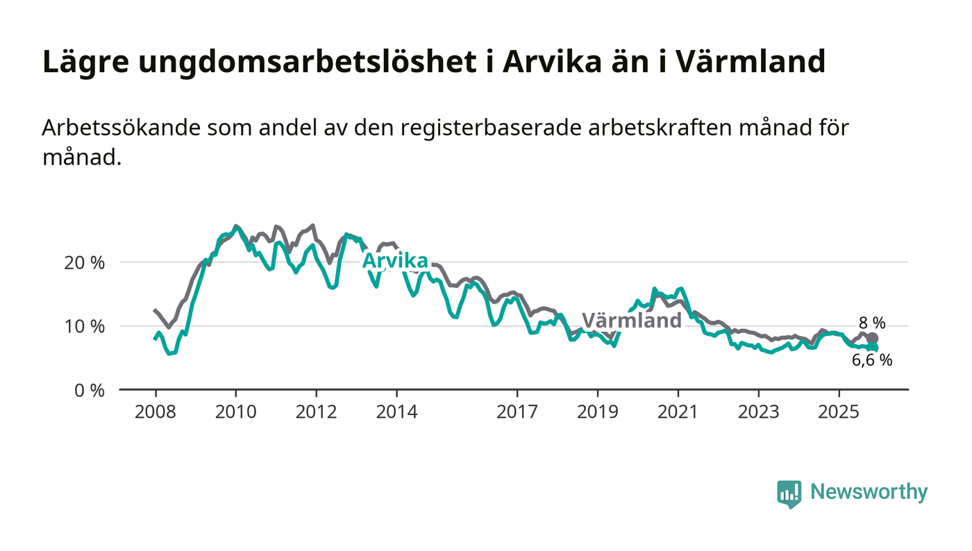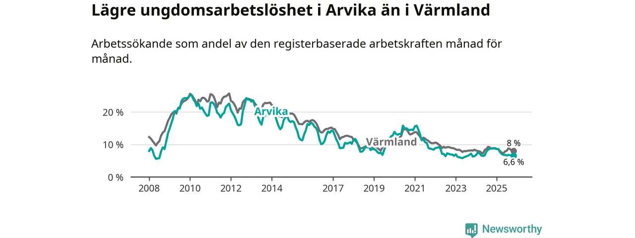 Precis som den totala arbetslösheten ligger ungdomsarbetslösheten i Arvika lägre än i Värmland som helhet. Skillnaden mellan kommunen och länet är 1,4 procentenheter.