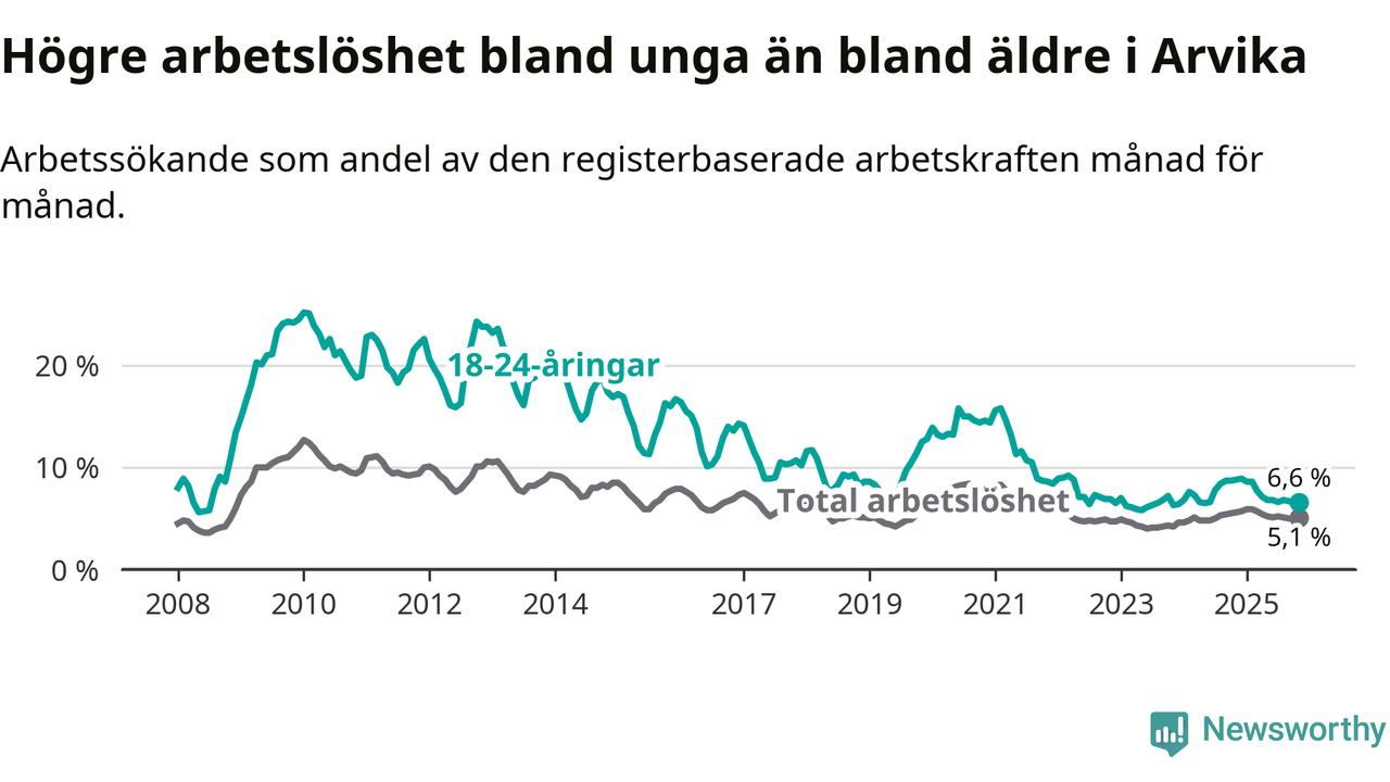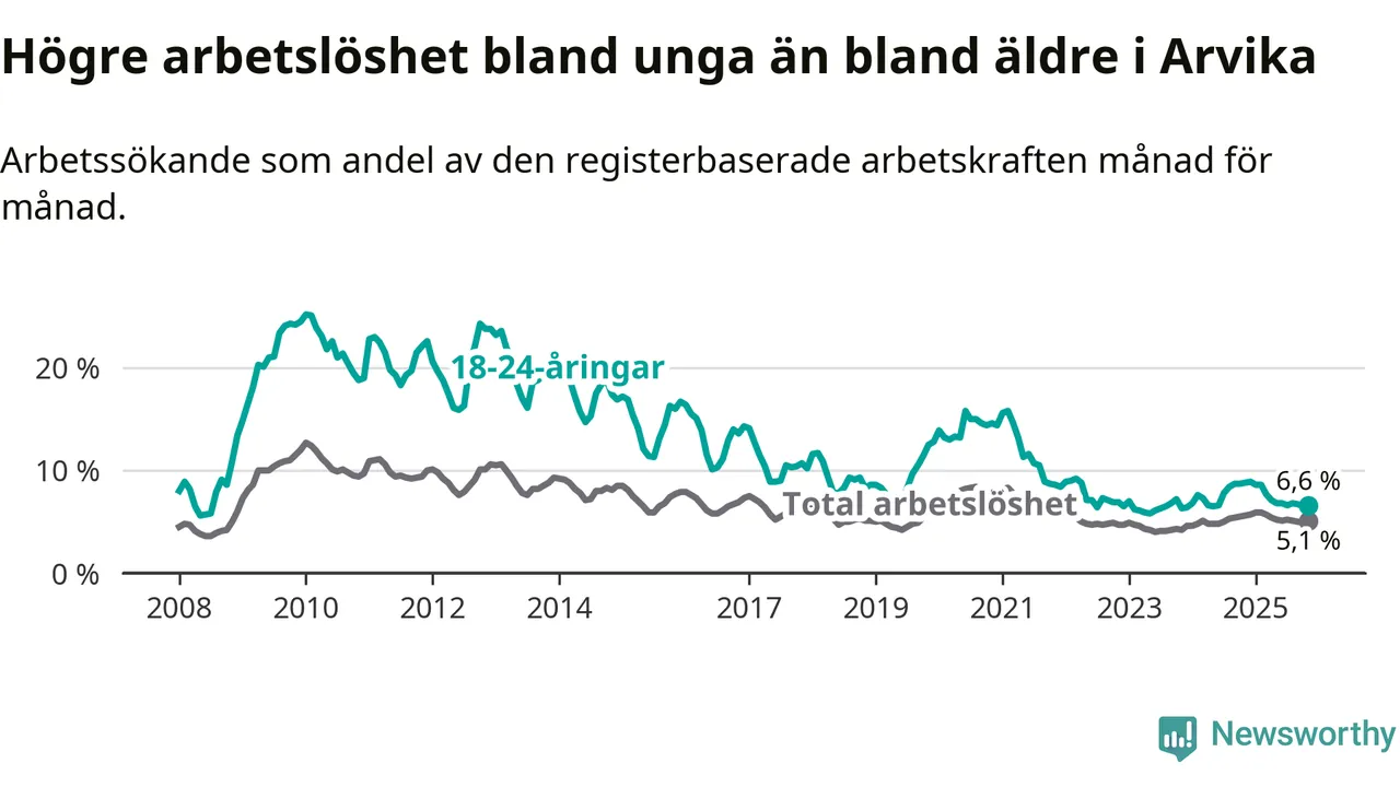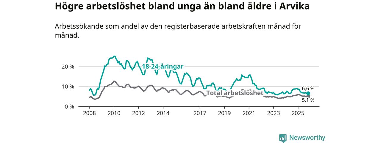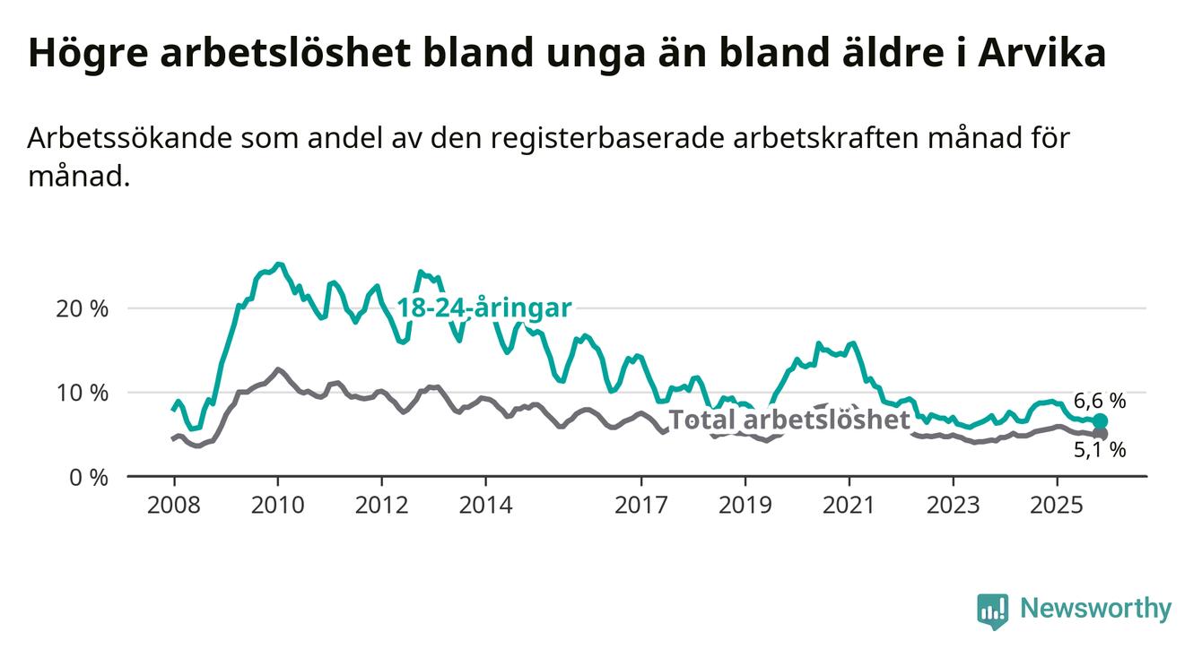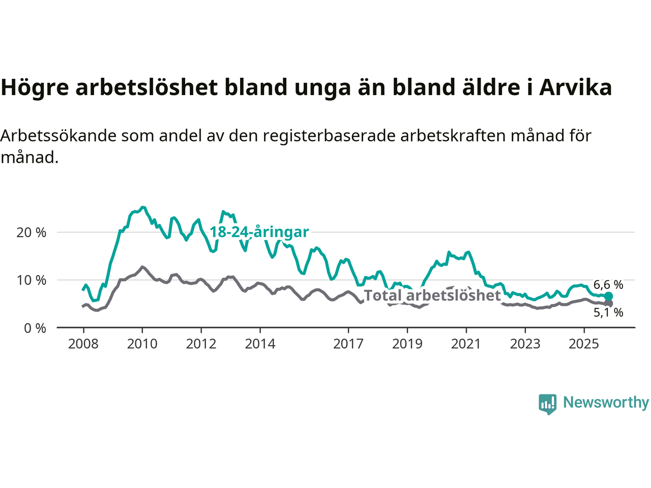 Precis som den totala arbetslösheten ligger ungdomsarbetslösheten i Arvika lägre än i Värmland som helhet. Skillnaden mellan kommunen och länet är 1,4 procentenheter.