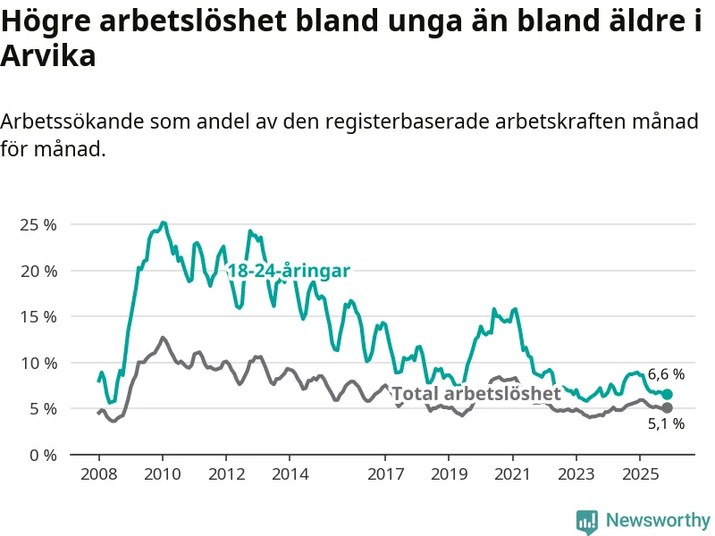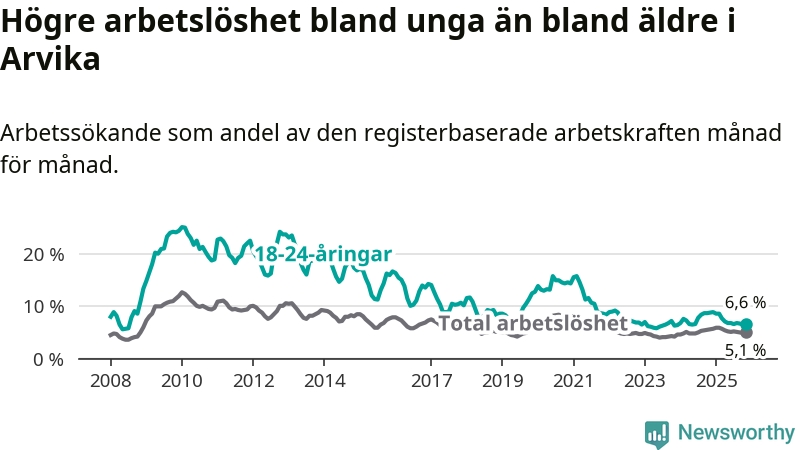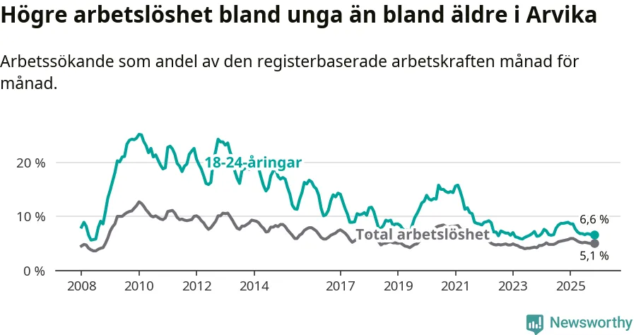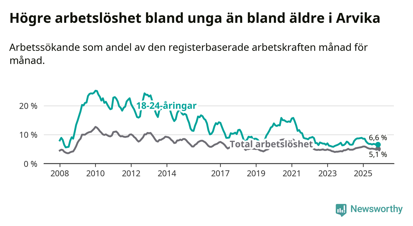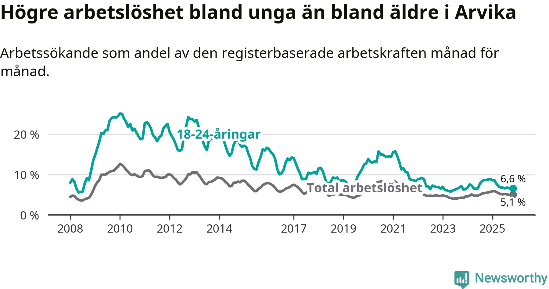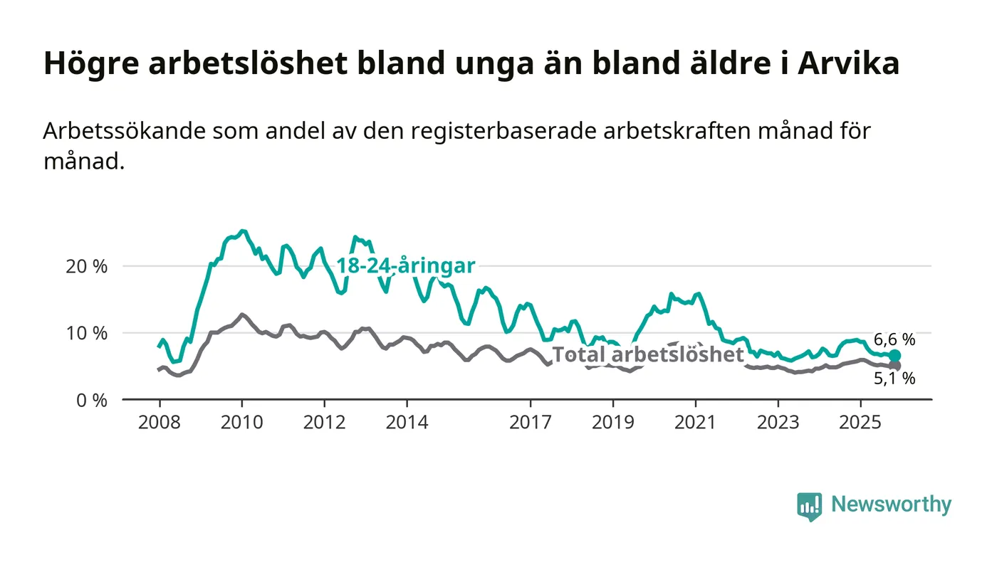 Precis som den totala arbetslösheten ligger ungdomsarbetslösheten i Arvika lägre än i Värmland som helhet. Skillnaden mellan kommunen och länet är 1,4 procentenheter.