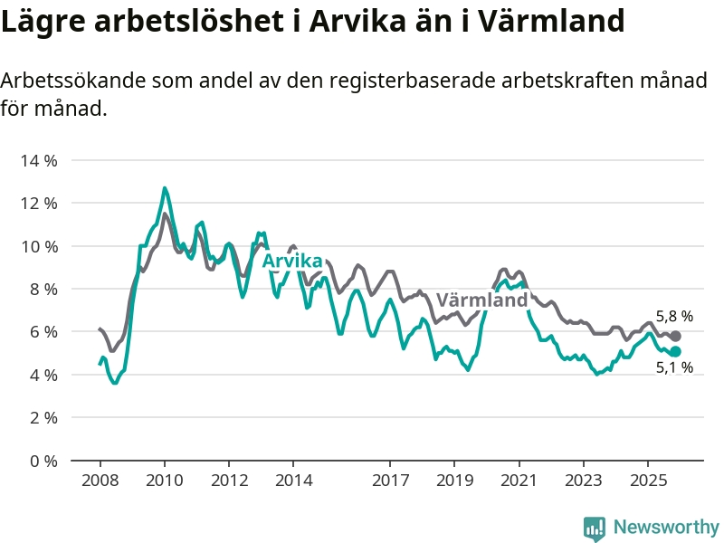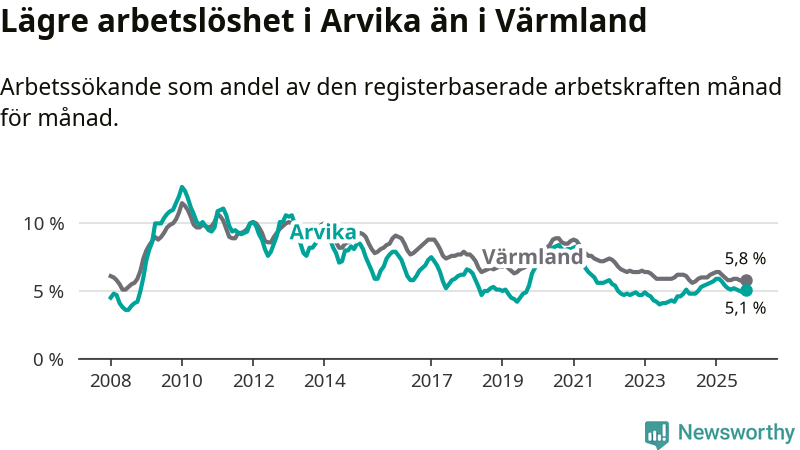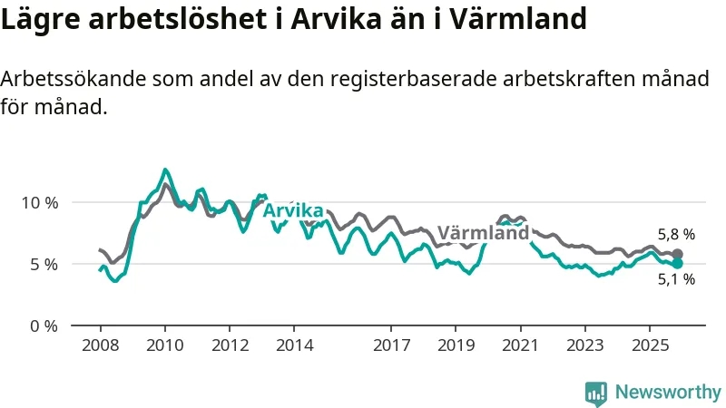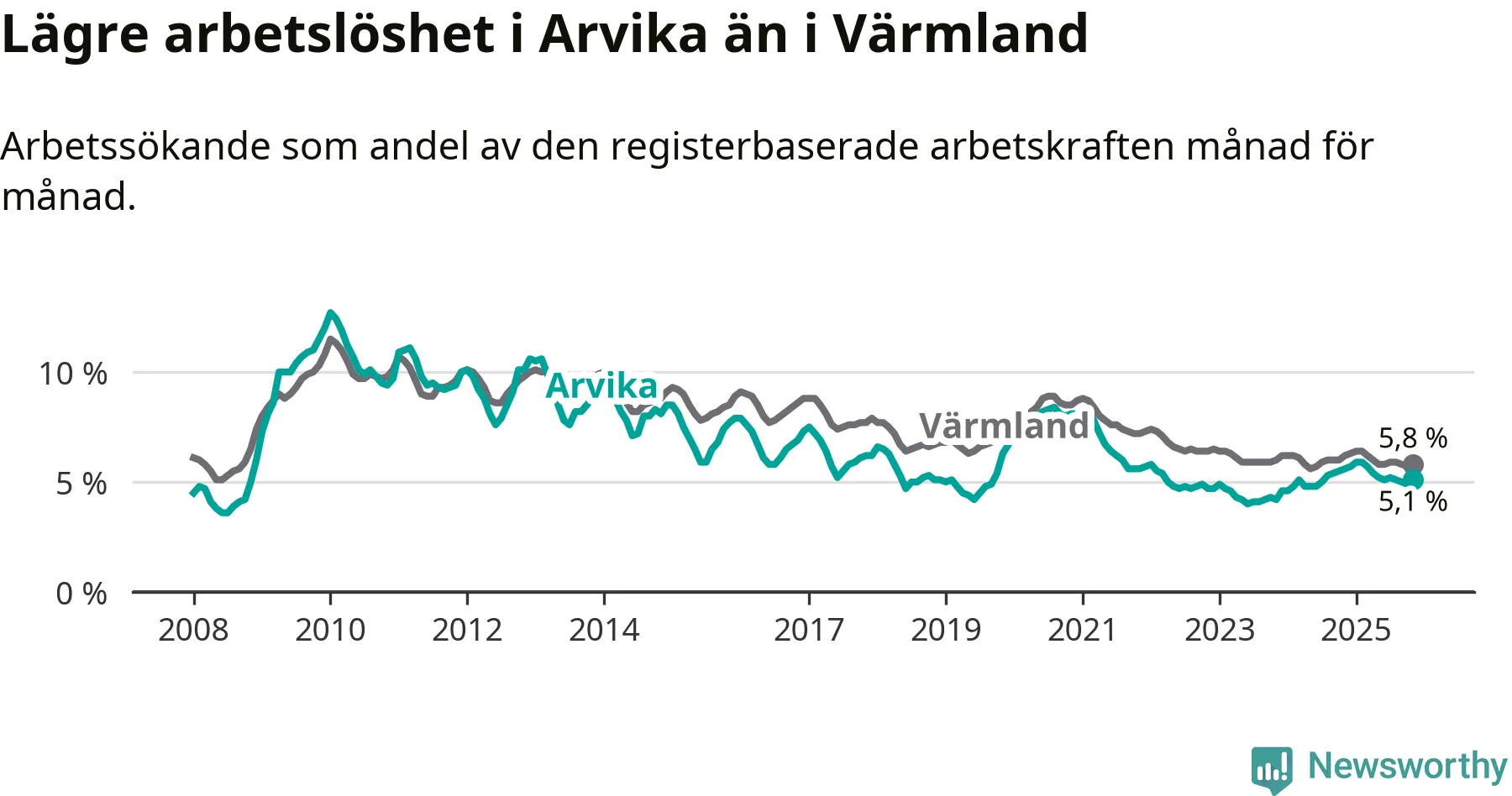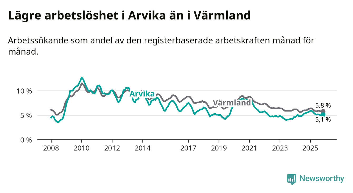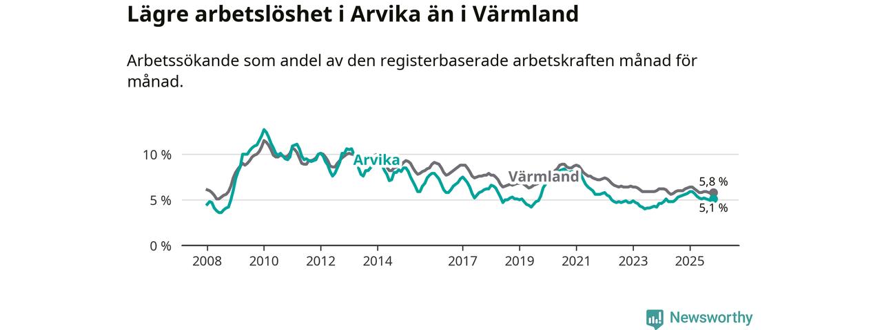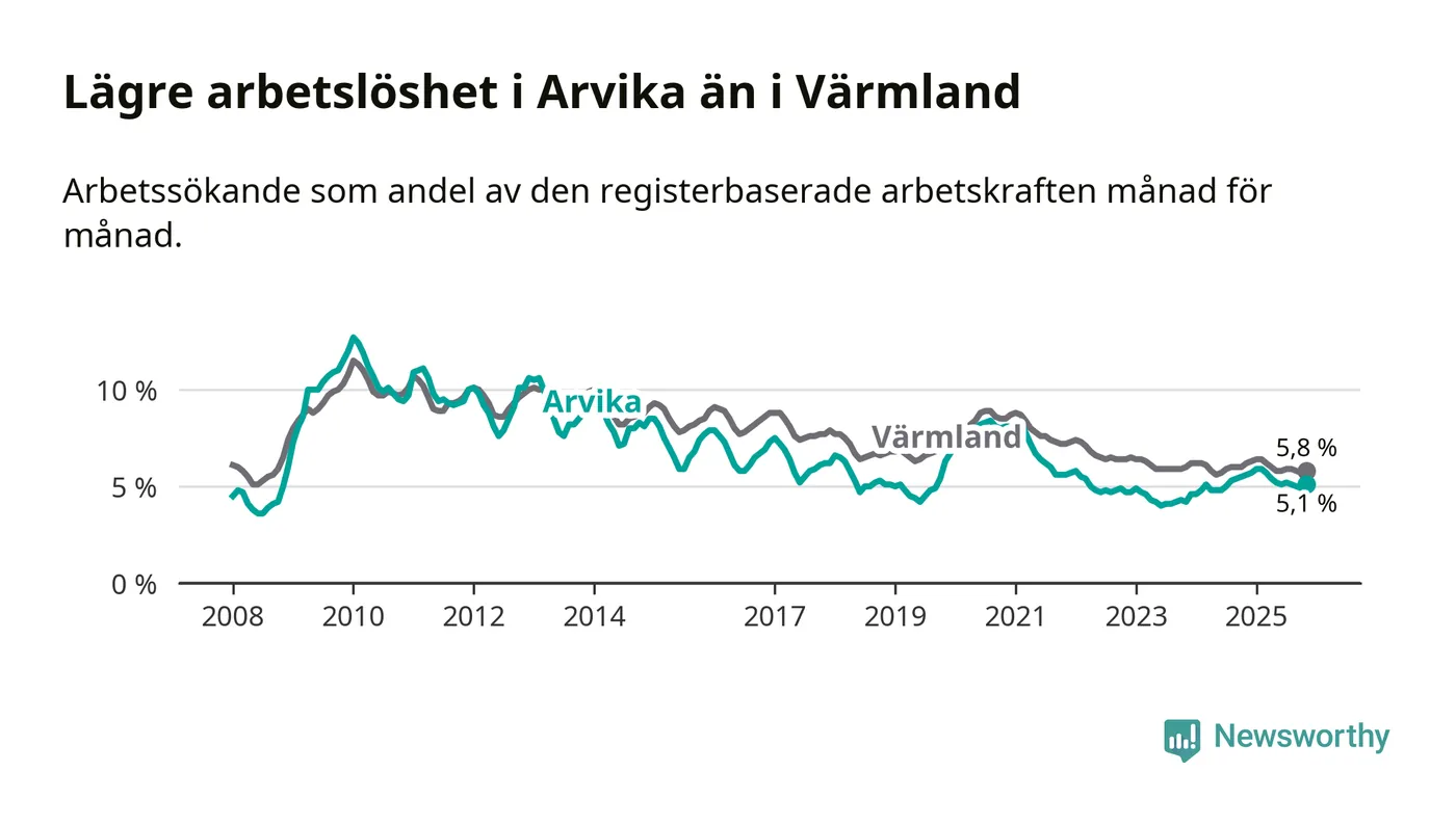 Arvika hade redan tidigare lägre arbetslöshet än snittet i hela Värmlands län och nu växer klyftan (5,1 procent i kommunen, jämfört med 5,8 procent i hela länet). Torsby har den lägsta arbetslösheten i länet (3,5 procent), medan Filipstad har den högsta (8,5 procent). För att Arvika skulle komma ner i samma arbetslöshetsnivå som Torsby skulle 190 personer behöva sysselsättas.