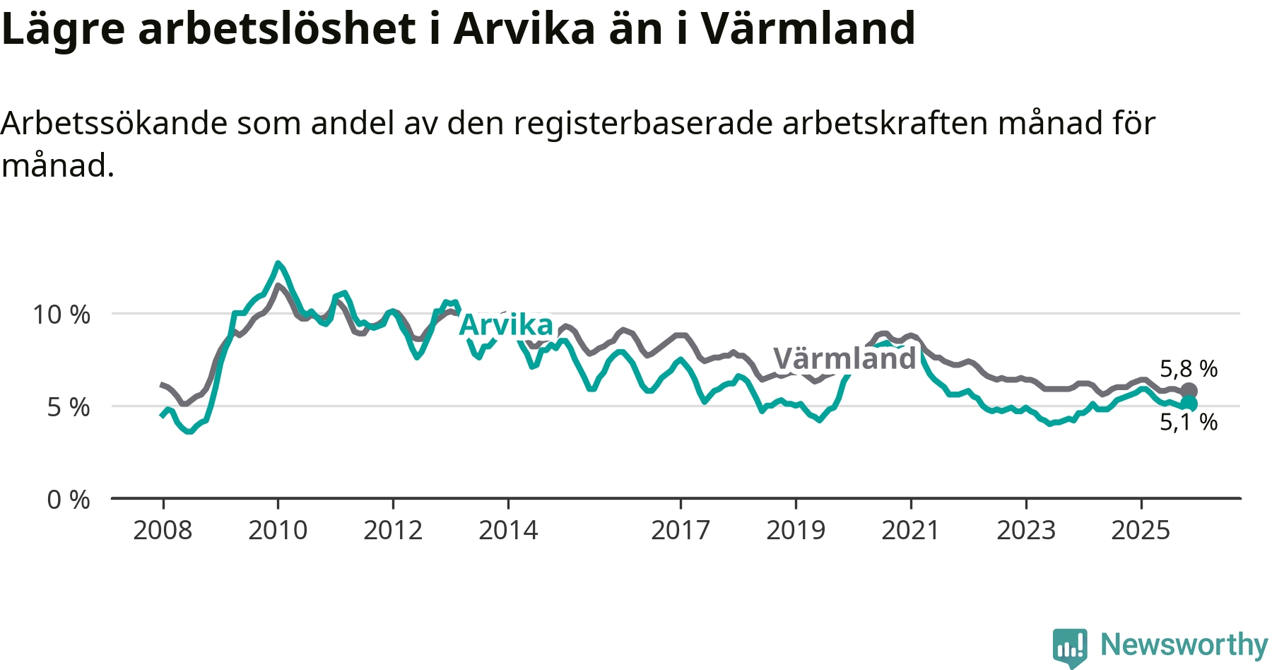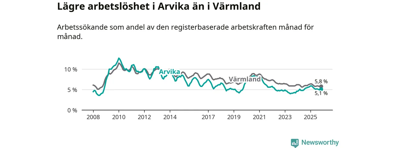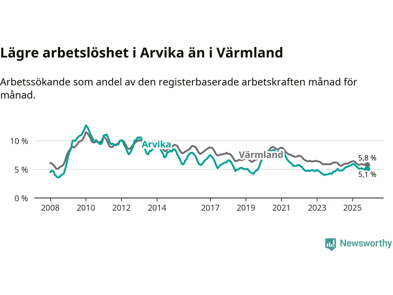Under november månad rapporterade Arvika kommun en total arbetslöshet på 5,1 procent. Det är en minskning jämfört med samma tidpunkt i fjol (−0,5 procentenheter). Även i Värmlands län sjunker arbetslösheten .