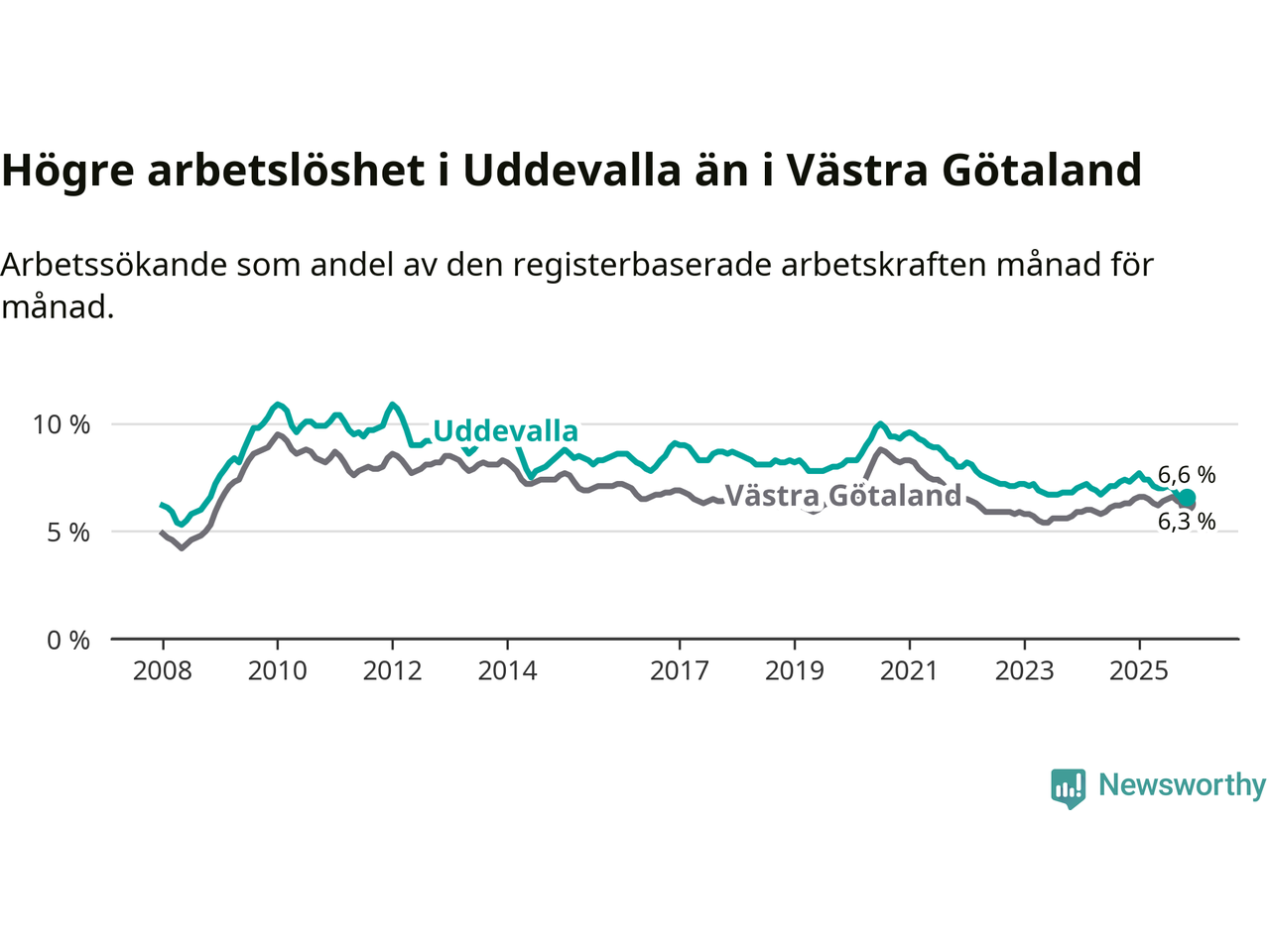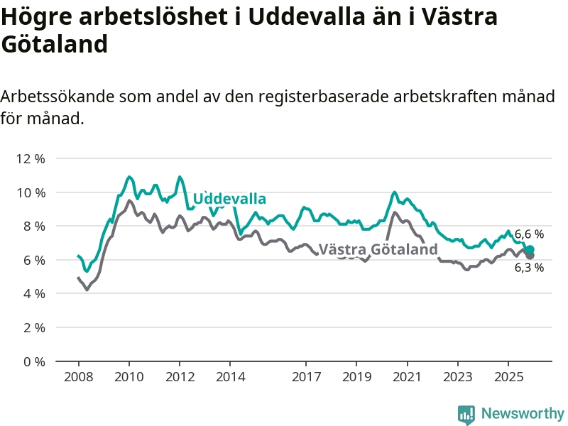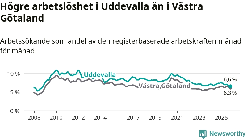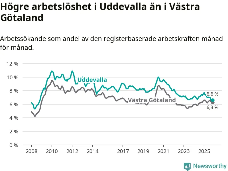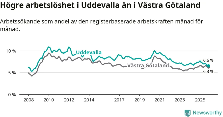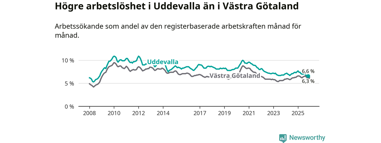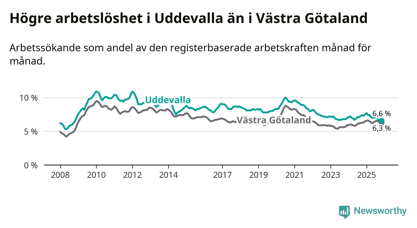 Under november månad rapporterade Uddevalla kommun en total arbetslöshet på 6,6 procent. Det är en minskning jämfört med samma tidpunkt i fjol (−0,7 procentenheter). I Västra Götalands län däremot står arbetslösheten stilla.