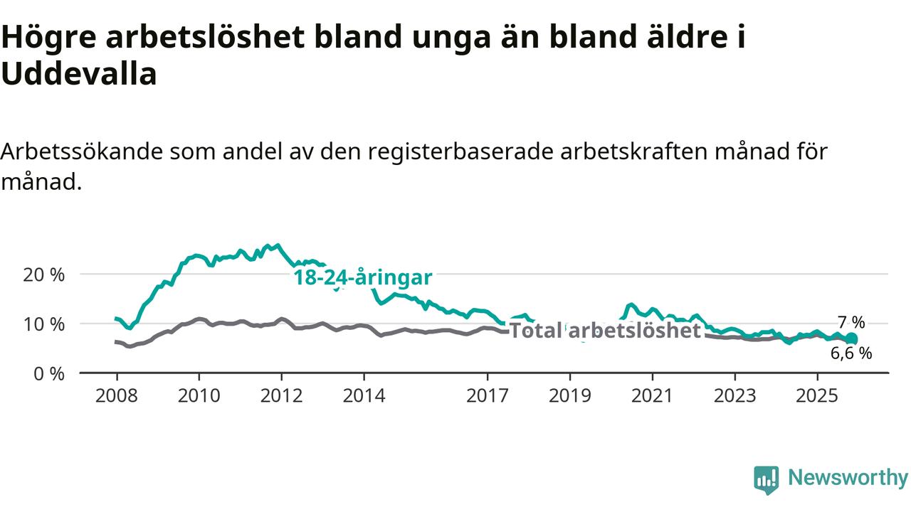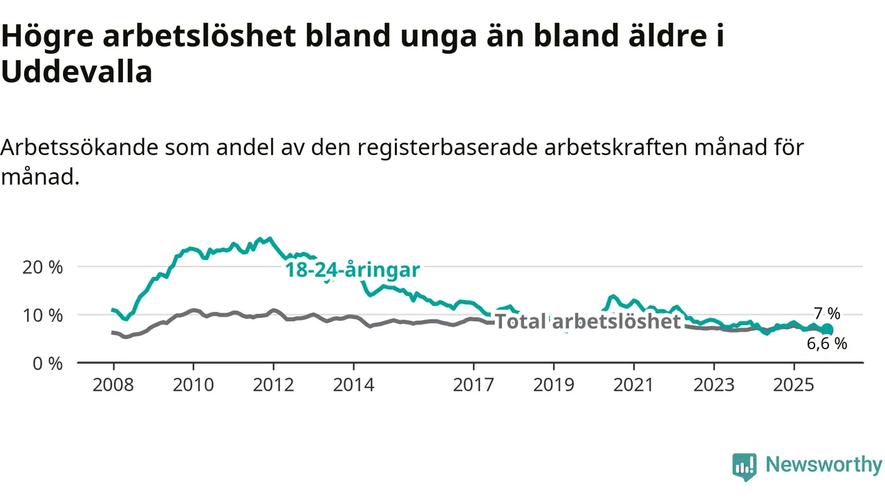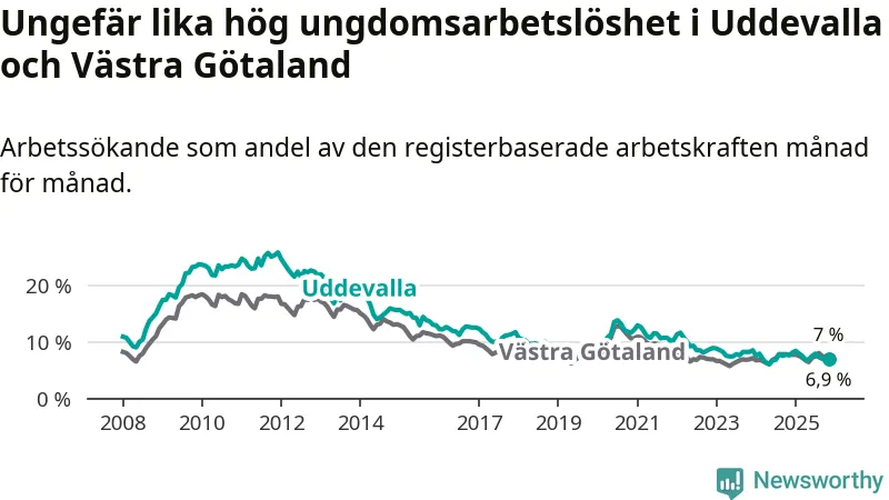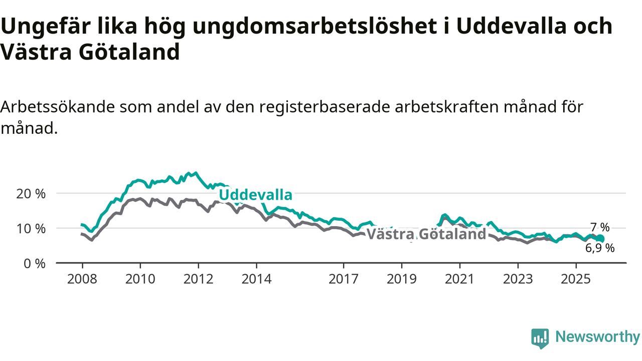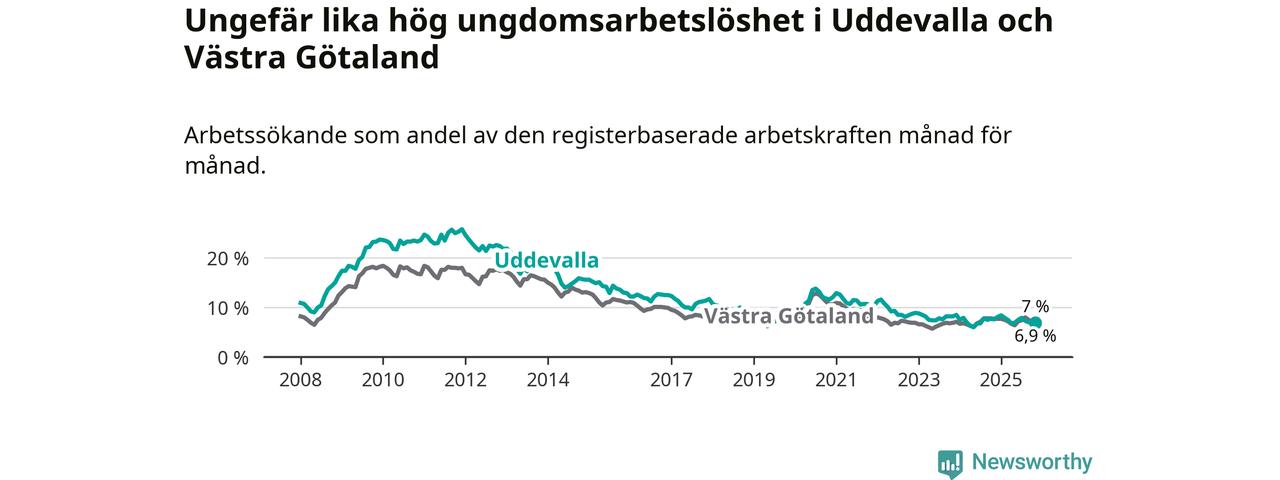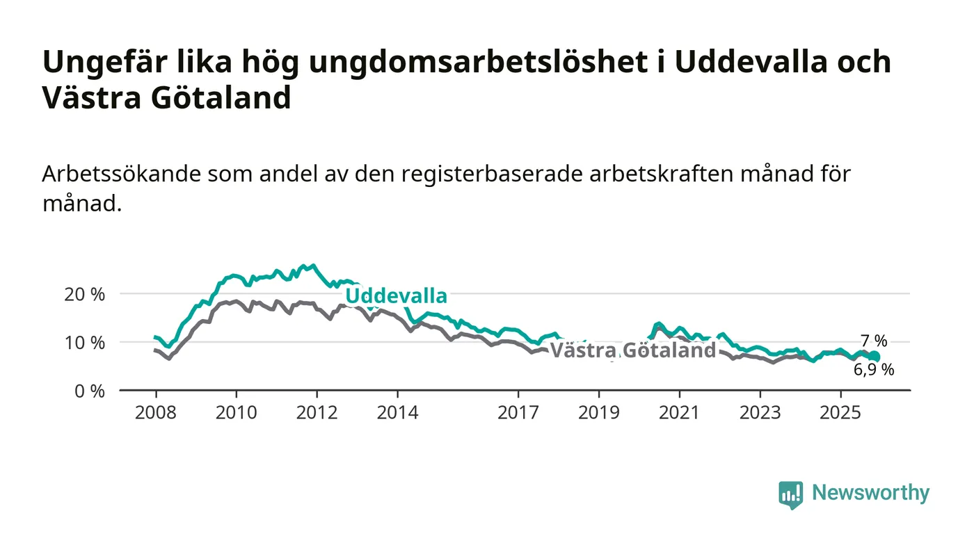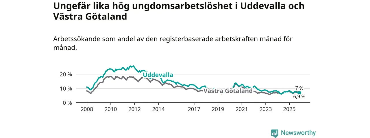 Medan Uddevalla har högre total arbetslöshet än Västra Götaland, ligger ungdomsarbetslösheten på i stort sett samma nivå.