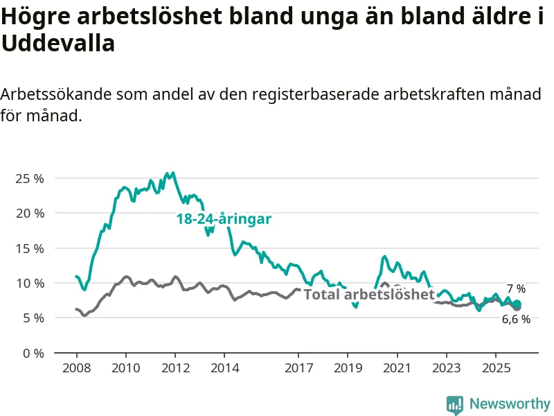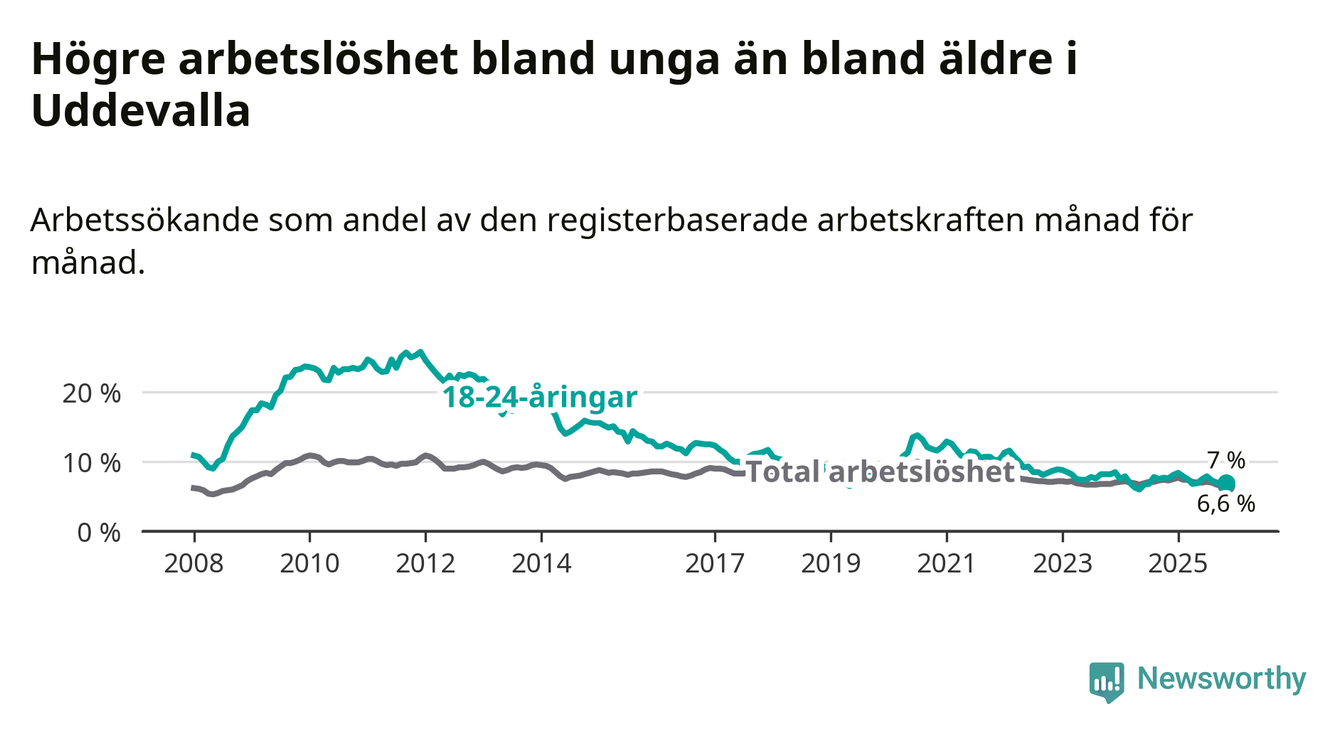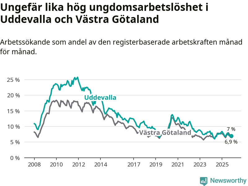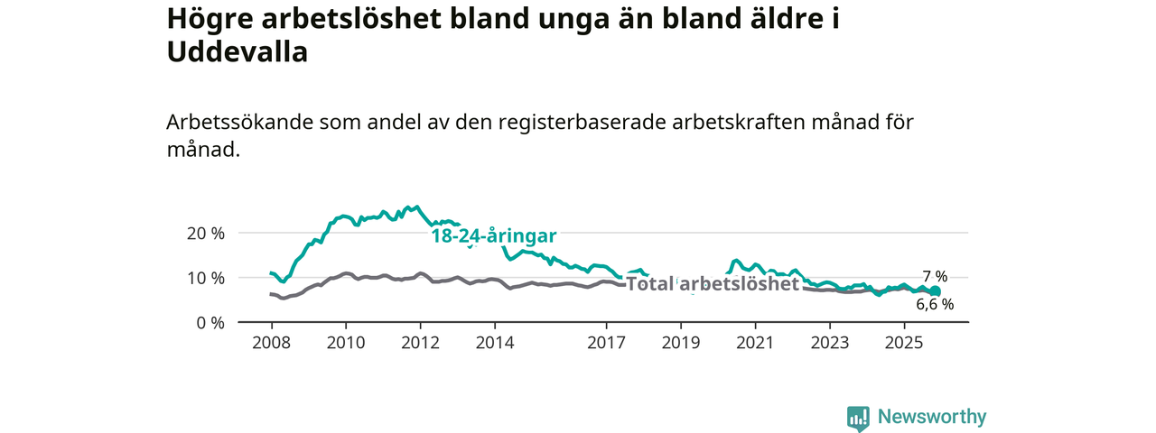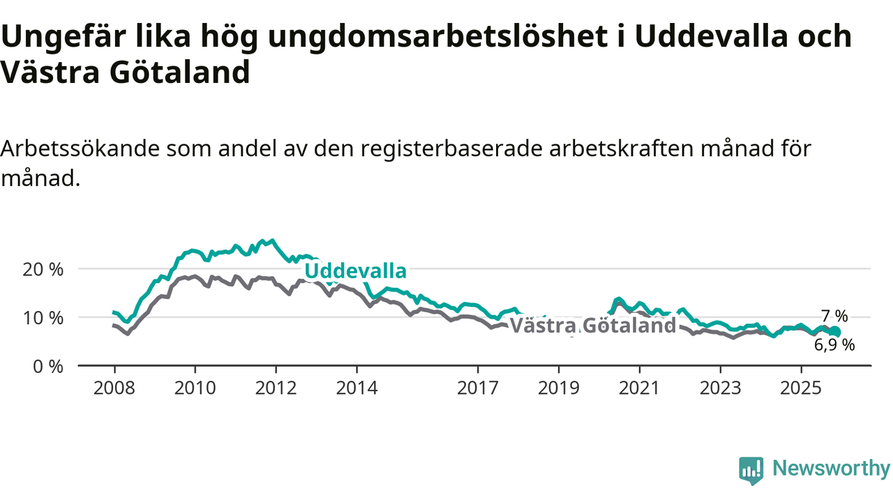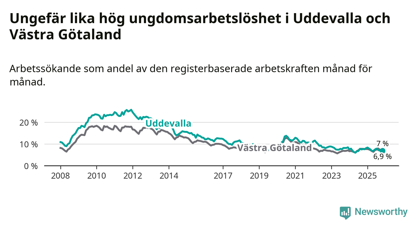 Medan Uddevalla har högre total arbetslöshet än Västra Götaland, ligger ungdomsarbetslösheten på i stort sett samma nivå.