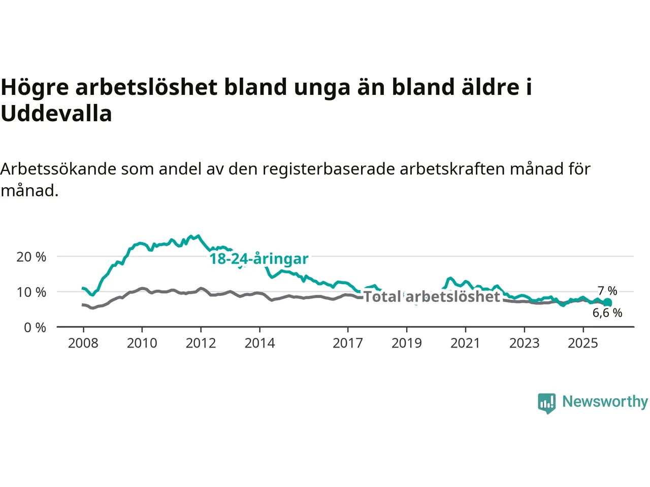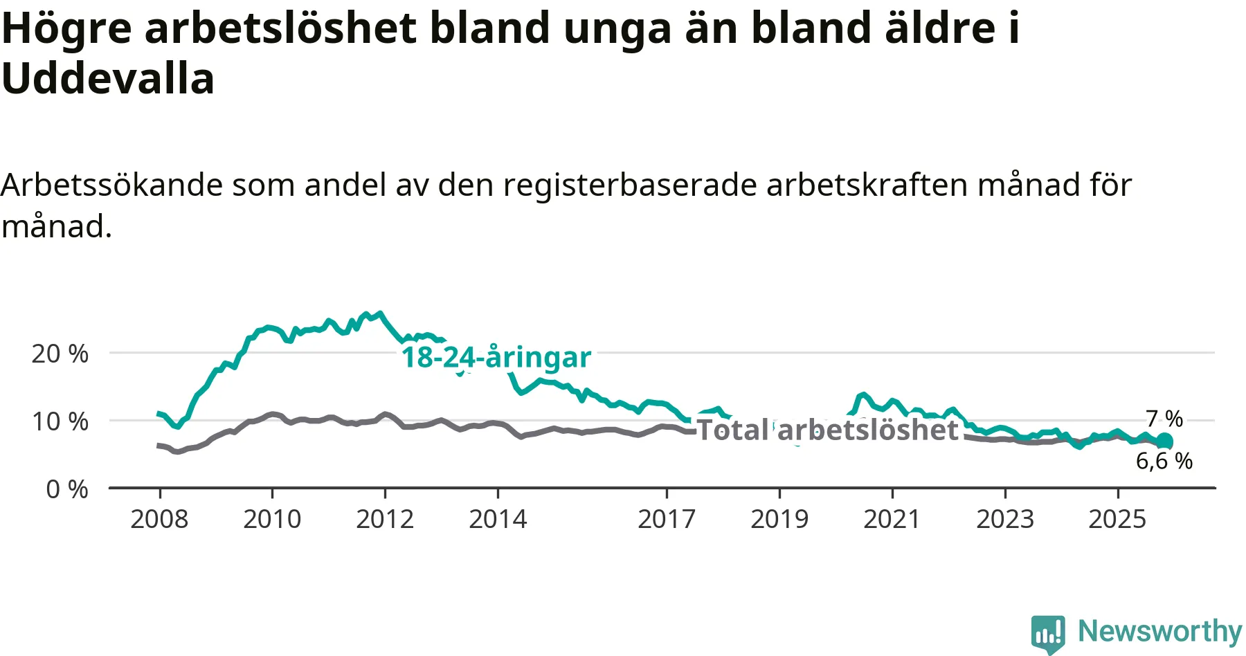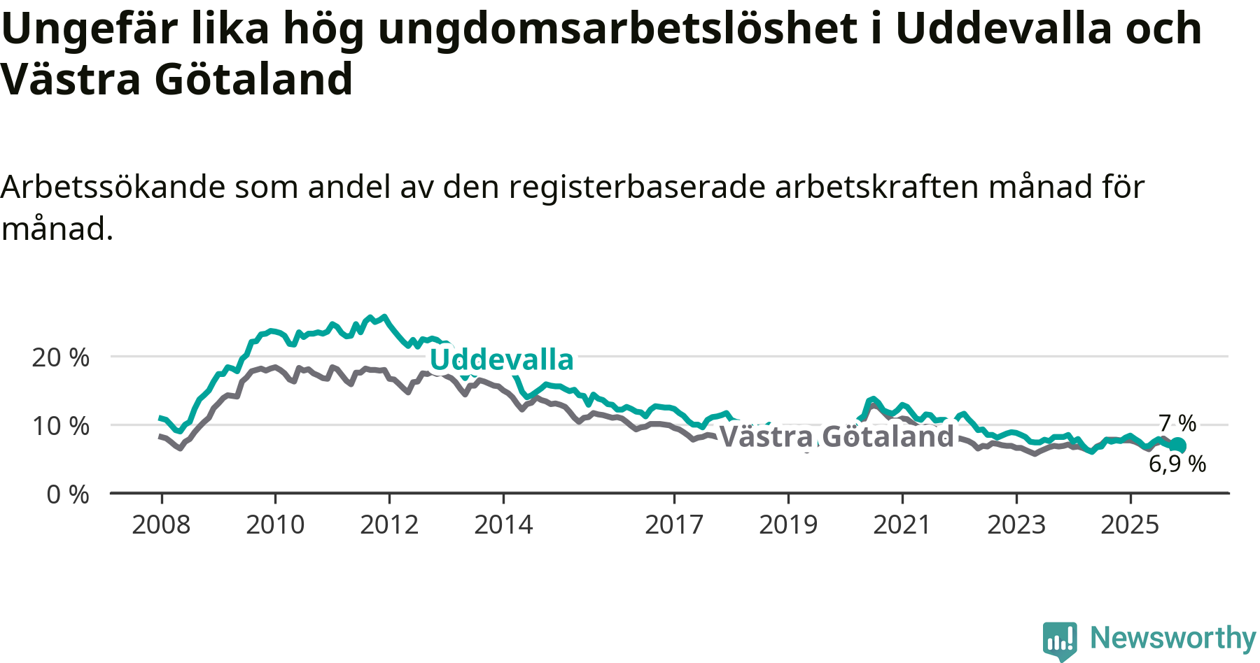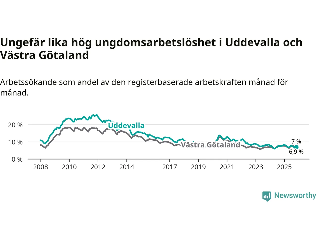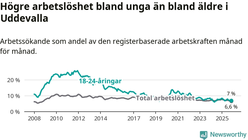 Medan Uddevalla har högre total arbetslöshet än Västra Götaland, ligger ungdomsarbetslösheten på i stort sett samma nivå.